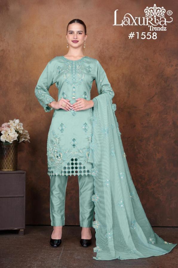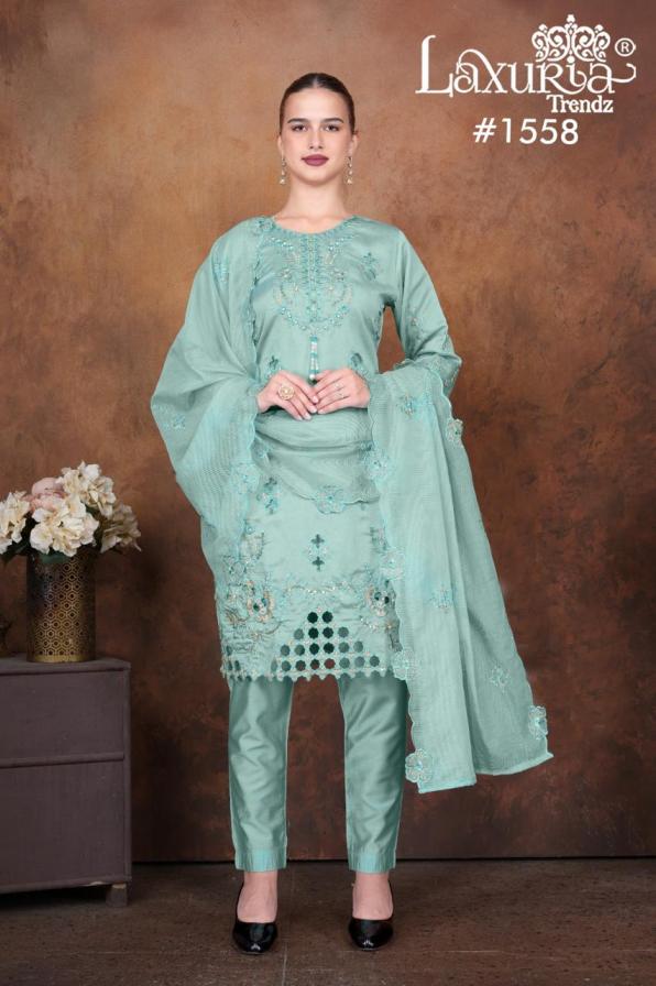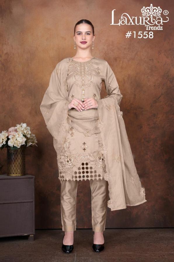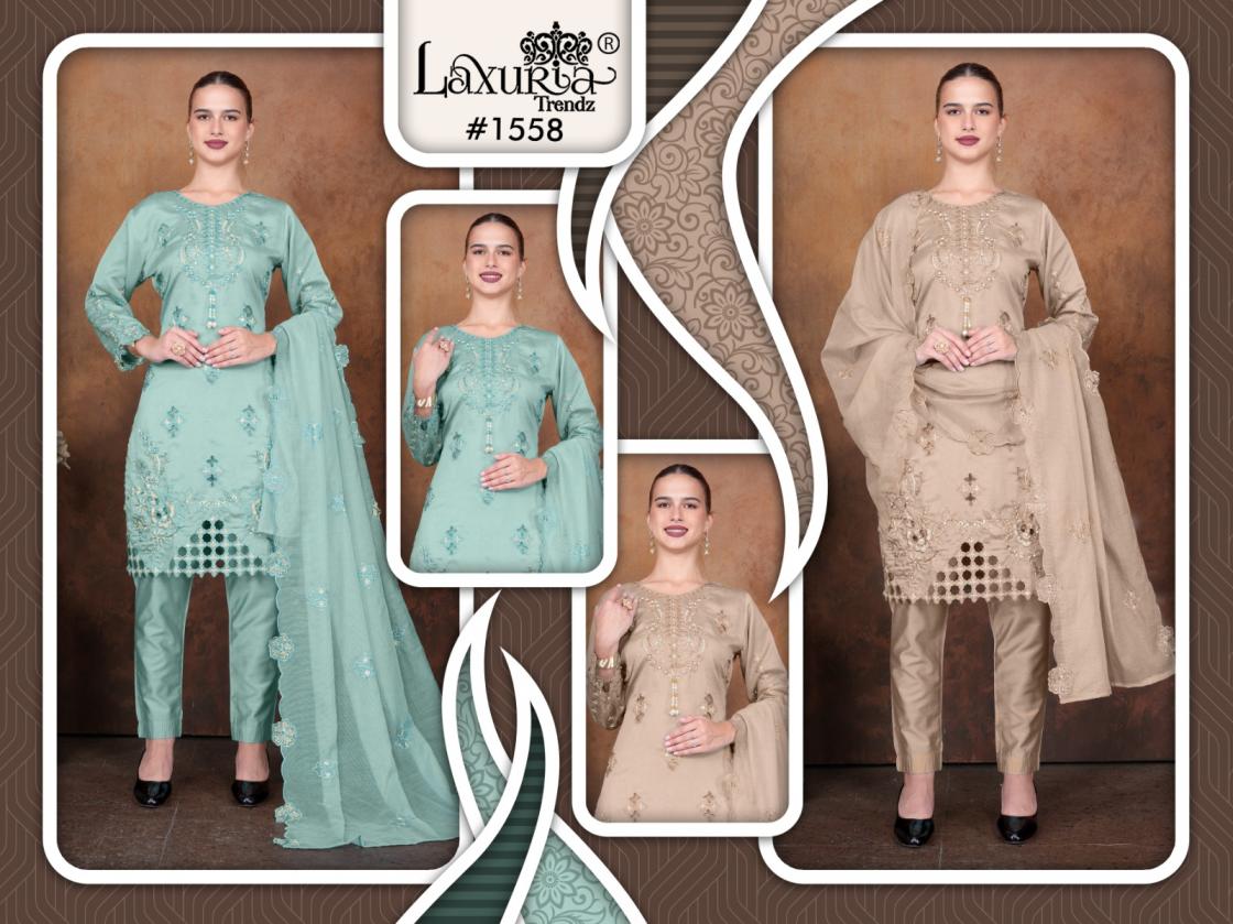 Looking for 1558 BY LAXURIA TRENDZ VICHITRA SIMMER FULL STITCH PAKISTANI SUITS Full Catalouge at Best Price? Buy Now 1558 BY LAXURIA TRENDZ VICHITRA SIMMER FULL STITCH PAKISTANI SUITS at Wholesale Rate of Rs 9000 with Total 6 Pcs from authroized dealer and supplier of Laxuria Trendz Brand. Cost of Each piece is just only Rs 1500 which is very low and affordable price to resale the product in your retail store. rrgandhi is Surat based Wholesale Supplier & Dealer of Laxuria Trendz Brand. Click on Brand name to Know more about Brand's products.