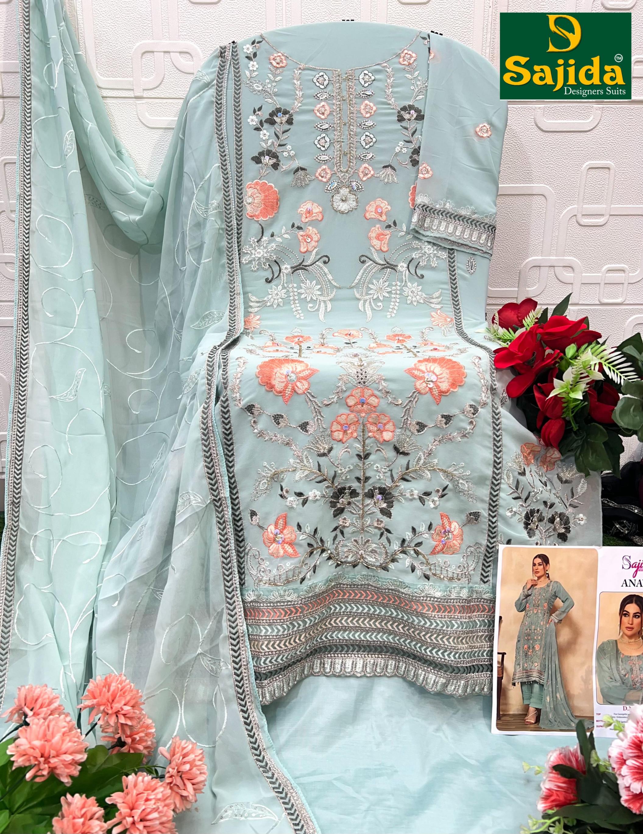 Looking for ANAYA VOL 5 BY SAJIDA DESIGNER GEORGETTE PAKISTANI UNSTITCH SUITS Full Catalouge at Best Price? Buy Now ANAYA VOL 5 BY SAJIDA DESIGNER GEORGETTE PAKISTANI UNSTITCH SUITS at Wholesale Rate of Rs 4197 with Total 3 Pcs from authroized dealer and supplier of Sajida designers Brand. Cost of Each piece is just only Rs 1399 which is very low and affordable price to resale the product in your retail store. rrgandhi is Surat based Wholesale Supplier & Dealer of Sajida designers Brand. Click on Brand name to Know more about Brand's products.