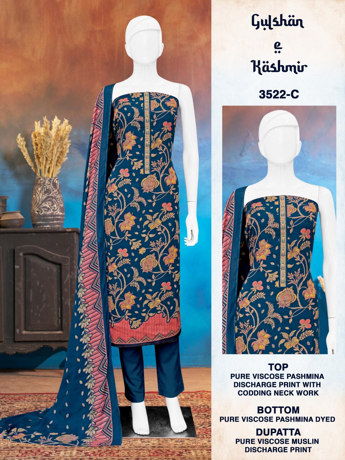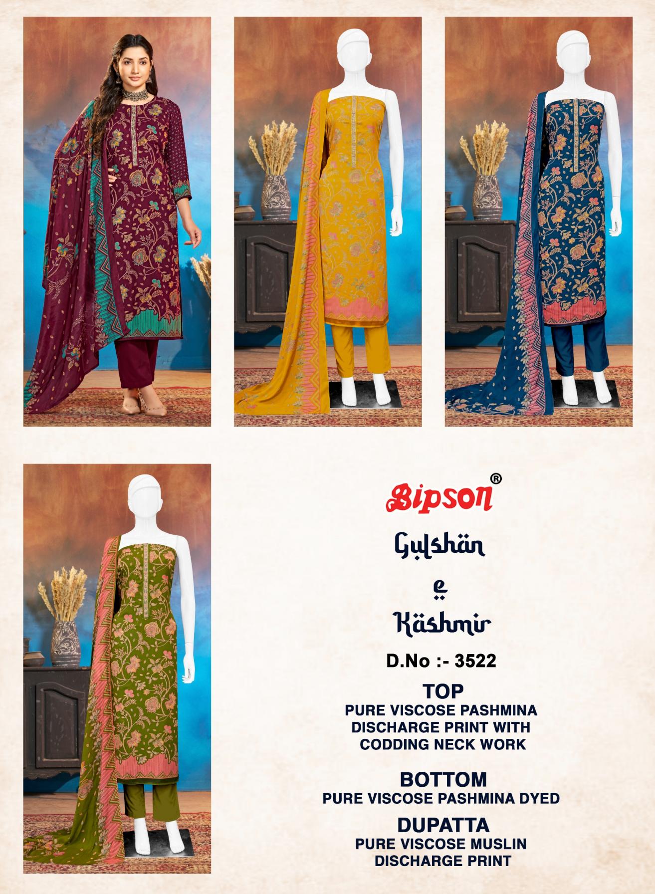 Looking for BIPSON PRINTS GULSHAN E KASHMIR 3522 VISCOSE PASHMINA LADIES SUITS Full Catalouge at Best Price? Buy Now BIPSON PRINTS GULSHAN E KASHMIR 3522 VISCOSE PASHMINA LADIES SUITS at Wholesale Rate of Rs 3700 with Total 4 Pcs from authroized dealer and supplier of Bipson Fashion Brand. Cost of Each piece is just only Rs 925 which is very low and affordable price to resale the product in your retail store. rrgandhi is Surat based Wholesale Supplier & Dealer of Bipson Fashion Brand. Click on Brand name to Know more about Brand's products.