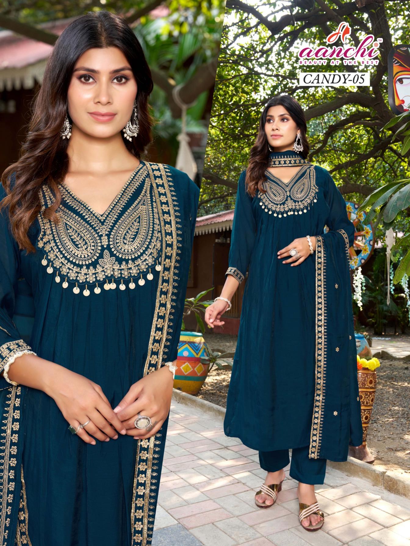 Looking for candy vol 1 by aanchi unique mul chanderi readymade 3pcs dress Full Catalouge at Best Price? Buy Now candy vol 1 by aanchi unique mul chanderi readymade 3pcs dress at Wholesale Rate of Rs 5850 with Total 5 Pcs from authroized dealer and supplier of Aanchi Brand. Cost of Each piece is just only Rs 1170 which is very low and affordable price to resale the product in your retail store. rrgandhi is Surat based Wholesale Supplier & Dealer of Aanchi Brand. Click on Brand name to Know more about Brand's products.