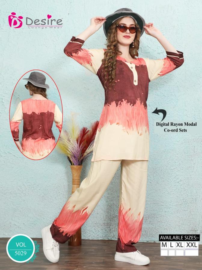 Looking for DESIRE VOL 5029 RAYON MODAL FULL STITCH CO-ORD SET ONLINE Full Catalouge at Best Price? Buy Now DESIRE VOL 5029 RAYON MODAL FULL STITCH CO-ORD SET ONLINE at Wholesale Rate of Rs 3240 with Total 6 Pcs from authroized dealer and supplier of Desire Lounge Wear Brand. Cost of Each piece is just only Rs 540 which is very low and affordable price to resale the product in your retail store. rrgandhi is Surat based Wholesale Supplier & Dealer of Desire Lounge Wear Brand. Click on Brand name to Know more about Brand's products.
