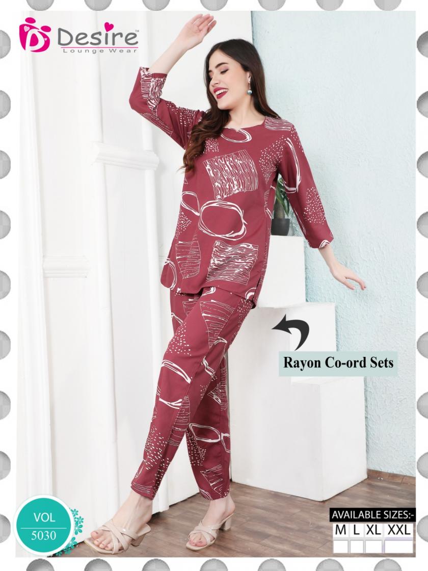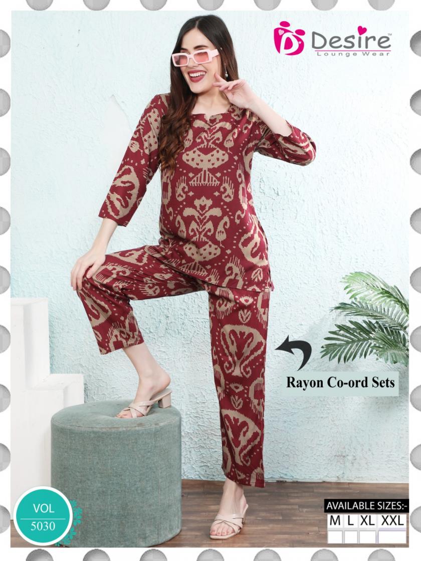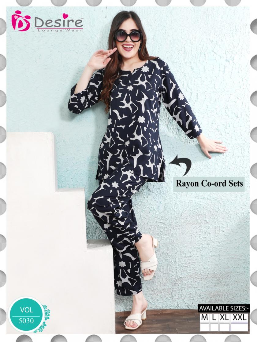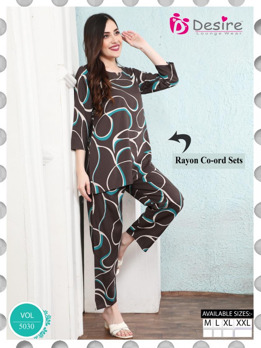 Looking for DESIRE VOL 5030 RAYON FANCY FULLY STITCH CO-ORD SET Full Catalouge at Best Price? Buy Now DESIRE VOL 5030 RAYON FANCY FULLY STITCH CO-ORD SET at Wholesale Rate of Rs 2670 with Total 6 Pcs from authroized dealer and supplier of Desire Lounge Wear Brand. Cost of Each piece is just only Rs 445 which is very low and affordable price to resale the product in your retail store. rrgandhi is Surat based Wholesale Supplier & Dealer of Desire Lounge Wear Brand. Click on Brand name to Know more about Brand's products.