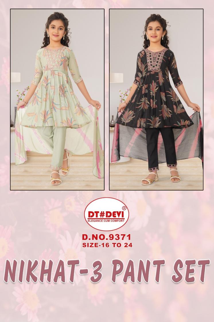 Looking for DT DEVI NIKHAT VOL 3 READYMADE ROMAN SHIMMER 9371 COMBO KIDS DRESS Full Catalouge at Best Price? Buy Now DT DEVI NIKHAT VOL 3 READYMADE ROMAN SHIMMER 9371 COMBO KIDS DRESS at Wholesale Rate of Rs 4850 with Total 10 Pcs from authroized dealer and supplier of Dt Devi Brand. Cost of Each piece is just only Rs 485 which is very low and affordable price to resale the product in your retail store. rrgandhi is Surat based Wholesale Supplier & Dealer of Dt Devi Brand. Click on Brand name to Know more about Brand's products.
