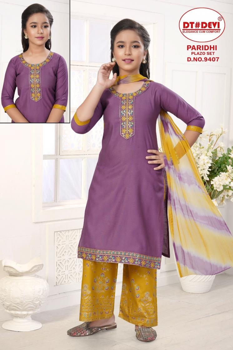 Looking for DT DEVI PARIDHI READYMADE 9407 VETICAN COMBO KIDS PLAZZO DRESS Full Catalouge at Best Price? Buy Now DT DEVI PARIDHI READYMADE 9407 VETICAN COMBO KIDS PLAZZO DRESS at Wholesale Rate of Rs 4725 with Total 9 Pcs from authroized dealer and supplier of Dt Devi Brand. Cost of Each piece is just only Rs 525 which is very low and affordable price to resale the product in your retail store. rrgandhi is Surat based Wholesale Supplier & Dealer of Dt Devi Brand. Click on Brand name to Know more about Brand's products.
