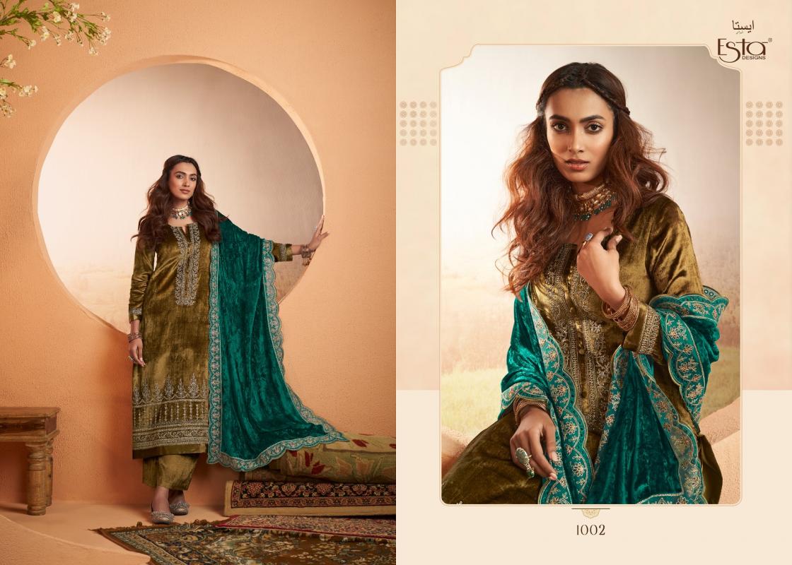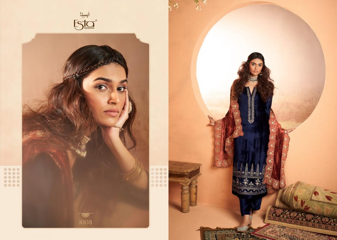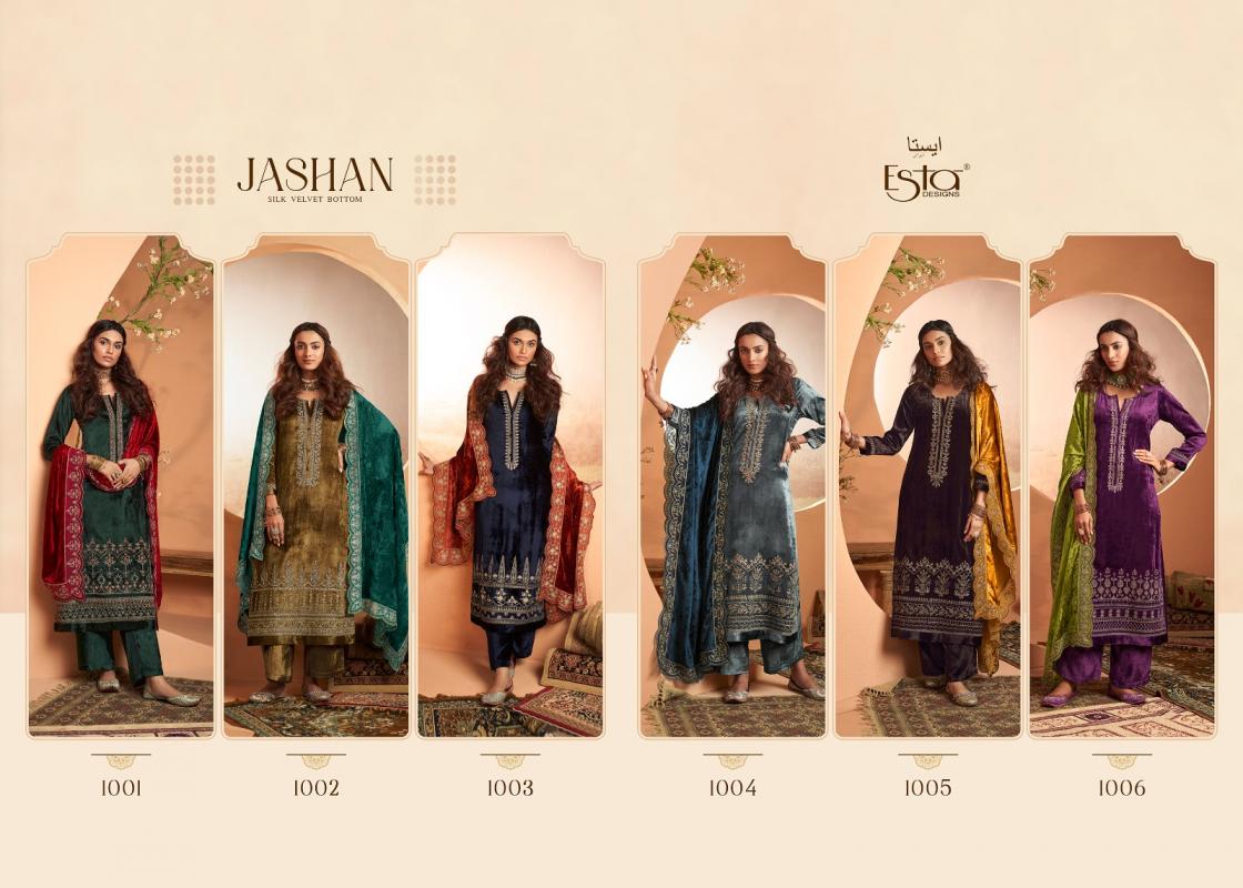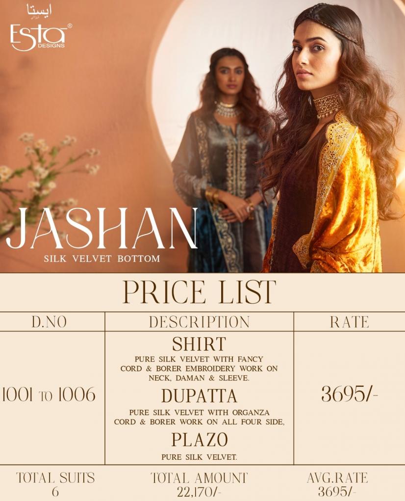 Looking for ESTA DESIGNS JASHAN DESIGNER WINTER 3PCS DRESS Full Catalouge at Best Price? Buy Now ESTA DESIGNS JASHAN DESIGNER WINTER 3PCS DRESS at Wholesale Rate of Rs 22170 with Total 6 Pcs from authroized dealer and supplier of Esta Designs Brand. Cost of Each piece is just only Rs 3695 which is very low and affordable price to resale the product in your retail store. rrgandhi is Surat based Wholesale Supplier & Dealer of Esta Designs Brand. Click on Brand name to Know more about Brand's products.