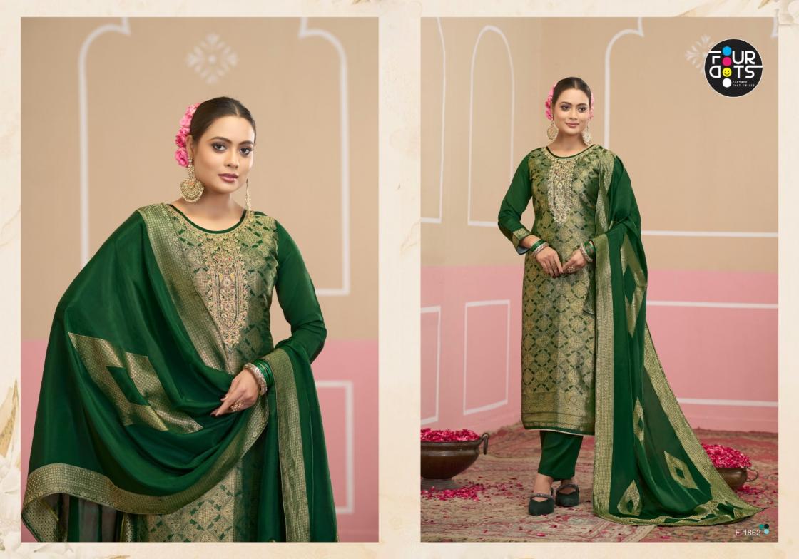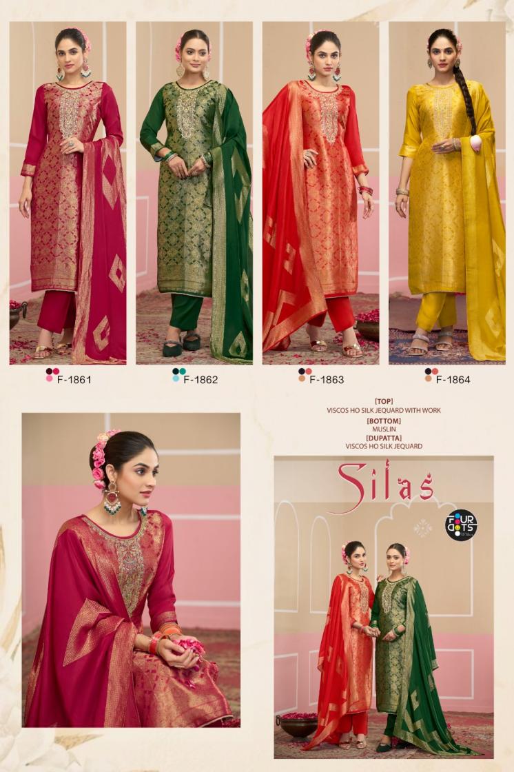 Looking for FOURDOTS SILAS VISCOSE HO SILK JACQUARD FANCY SALWAR SUIT Full Catalouge at Best Price? Buy Now FOURDOTS SILAS VISCOSE HO SILK JACQUARD FANCY SALWAR SUIT at Wholesale Rate of Rs 6300 with Total 4 Pcs from authroized dealer and supplier of Fourdots Brand. Cost of Each piece is just only Rs 1575 which is very low and affordable price to resale the product in your retail store. rrgandhi is Surat based Wholesale Supplier & Dealer of Fourdots Brand. Click on Brand name to Know more about Brand's products.