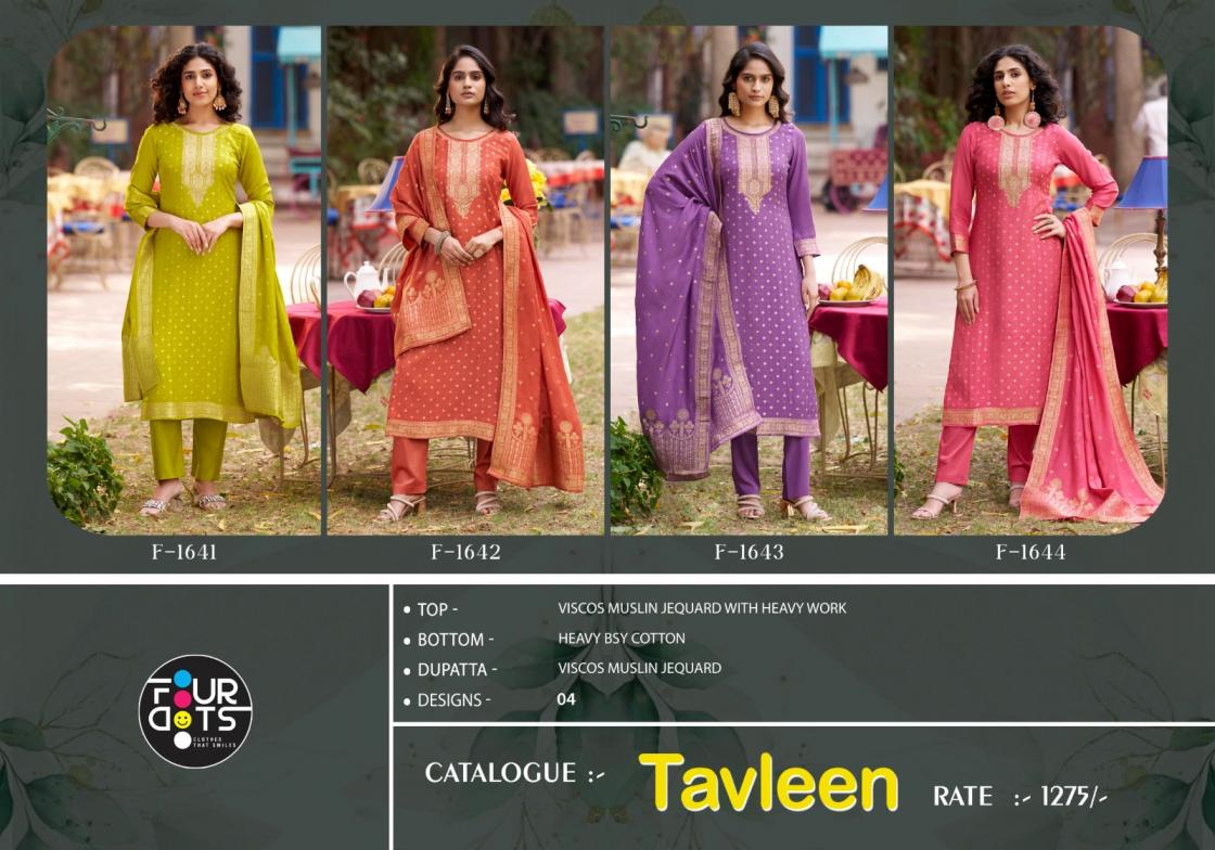 Looking for FOURDOTS TAVLEEN VISCOSE MUSLIN JACQUARD SUIT FOR WOMENS Full Catalouge at Best Price? Buy Now FOURDOTS TAVLEEN VISCOSE MUSLIN JACQUARD SUIT FOR WOMENS at Wholesale Rate of Rs 5100 with Total 4 Pcs from authroized dealer and supplier of Fourdots Brand. Cost of Each piece is just only Rs 1275 which is very low and affordable price to resale the product in your retail store. rrgandhi is Surat based Wholesale Supplier & Dealer of Fourdots Brand. Click on Brand name to Know more about Brand's products.