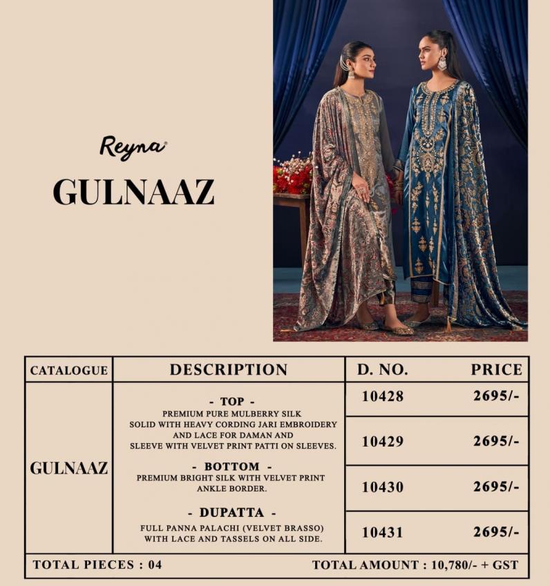 Looking for GULNAAZ BY REYNA MULBERRY SILK UNSTITCH 3PCS DRESS Full Catalouge at Best Price? Buy Now GULNAAZ BY REYNA MULBERRY SILK UNSTITCH 3PCS DRESS at Wholesale Rate of Rs 10780 with Total 4 Pcs from authroized dealer and supplier of Reyna Brand. Cost of Each piece is just only Rs 2695 which is very low and affordable price to resale the product in your retail store. rrgandhi is Surat based Wholesale Supplier & Dealer of Reyna Brand. Click on Brand name to Know more about Brand's products.