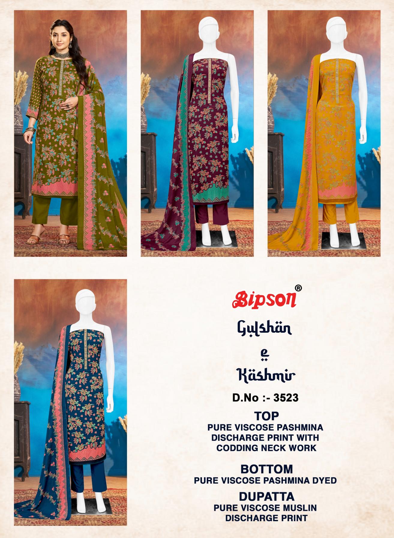 Looking for GULSHAN E KASHMIR 3523 BY BIPSON PRINTS VISCOSE PASHMINA UNSTITCH SUITS Full Catalouge at Best Price? Buy Now GULSHAN E KASHMIR 3523 BY BIPSON PRINTS VISCOSE PASHMINA UNSTITCH SUITS at Wholesale Rate of Rs 3700 with Total 4 Pcs from authroized dealer and supplier of Bipson Fashion Brand. Cost of Each piece is just only Rs 925 which is very low and affordable price to resale the product in your retail store. rrgandhi is Surat based Wholesale Supplier & Dealer of Bipson Fashion Brand. Click on Brand name to Know more about Brand's products.