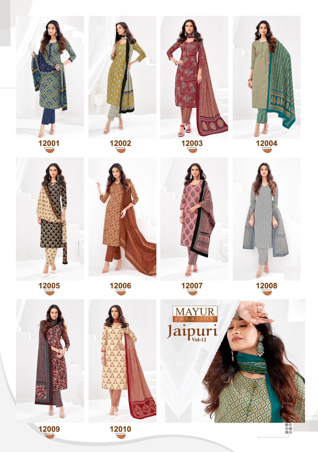 Looking for JAIPURI VOL 12 BY MAYUR CREATION UNSTITCH COTTON 3PCS DRESS Full Catalouge at Best Price? Buy Now JAIPURI VOL 12 BY MAYUR CREATION UNSTITCH COTTON 3PCS DRESS at Wholesale Rate of Rs 3800 with Total 10 Pcs from authroized dealer and supplier of Mayur Creation Brand. Cost of Each piece is just only Rs 380 which is very low and affordable price to resale the product in your retail store. rrgandhi is Surat based Wholesale Supplier & Dealer of Mayur Creation Brand. Click on Brand name to Know more about Brand's products.