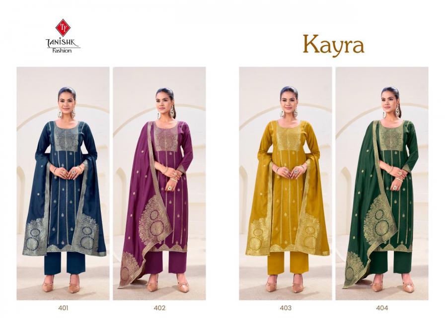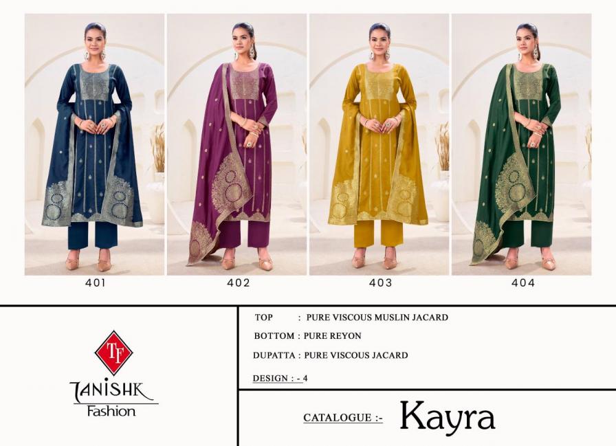 Looking for KAYRA BY TANISHK FASHION VISCOSE MUSLIN JACQUARD UNSTITCH SUITS Full Catalouge at Best Price? Buy Now KAYRA BY TANISHK FASHION VISCOSE MUSLIN JACQUARD UNSTITCH SUITS at Wholesale Rate of Rs 3400 with Total 4 Pcs from authroized dealer and supplier of Tanishk Fashion Brand. Cost of Each piece is just only Rs 850 which is very low and affordable price to resale the product in your retail store. rrgandhi is Surat based Wholesale Supplier & Dealer of Tanishk Fashion Brand. Click on Brand name to Know more about Brand's products.