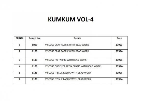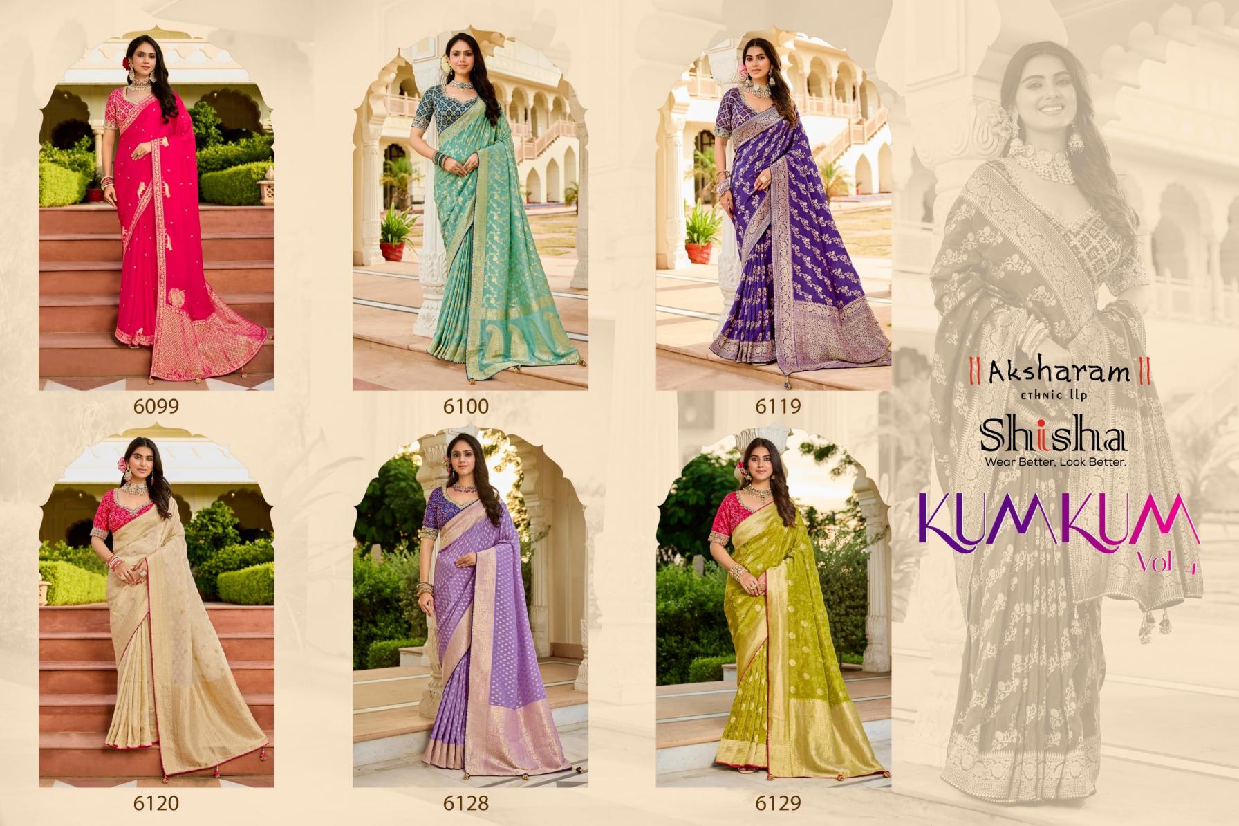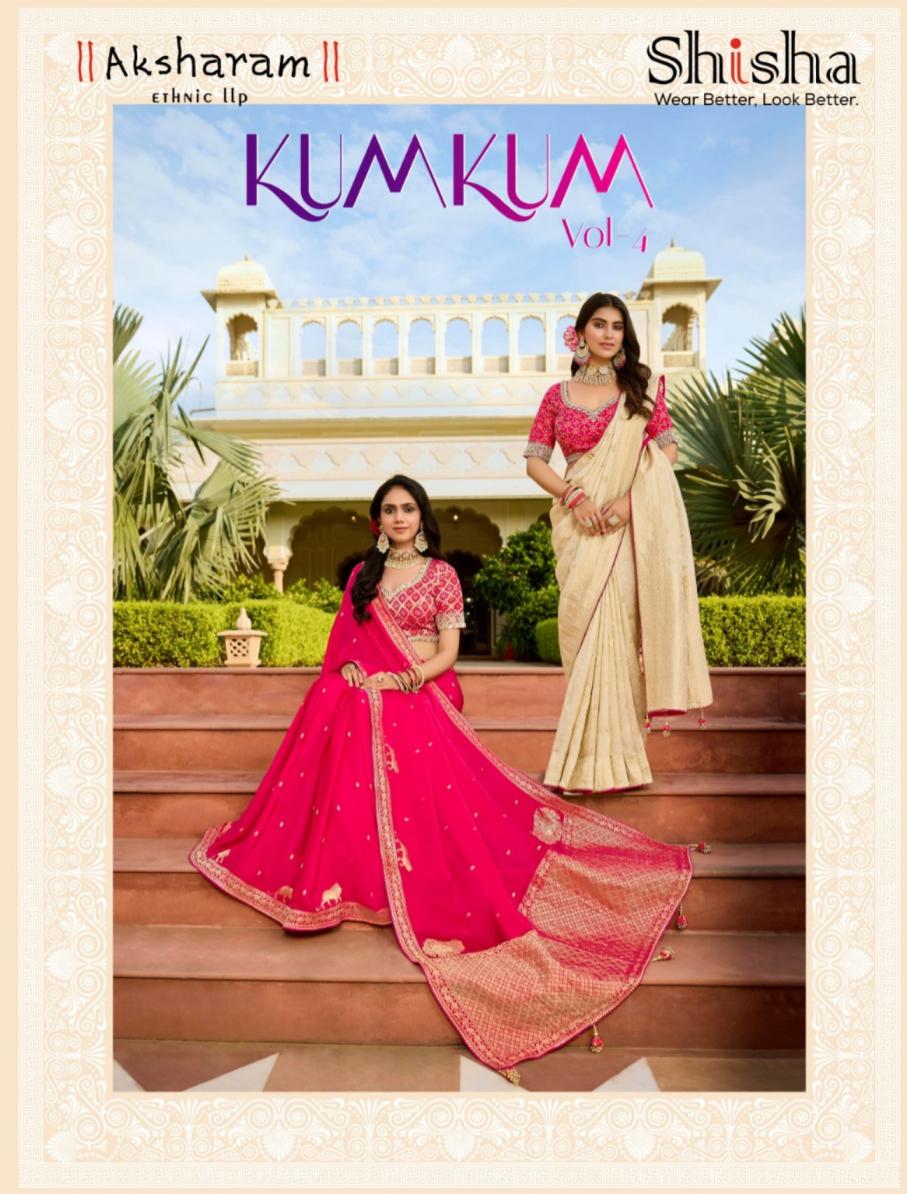 Looking for KUM KUM VOL 4 BY SHISHA VISCOSE CRAPE NEW DESIGN SAREE 2025 Full Catalouge at Best Price? Buy Now KUM KUM VOL 4 BY SHISHA VISCOSE CRAPE NEW DESIGN SAREE 2025 at Wholesale Rate of Rs 21180 with Total 6 Pcs from authroized dealer and supplier of Shisha Brand. Cost of Each piece is just only Rs 3530 which is very low and affordable price to resale the product in your retail store. rrgandhi is Surat based Wholesale Supplier & Dealer of Shisha Brand. Click on Brand name to Know more about Brand's products.