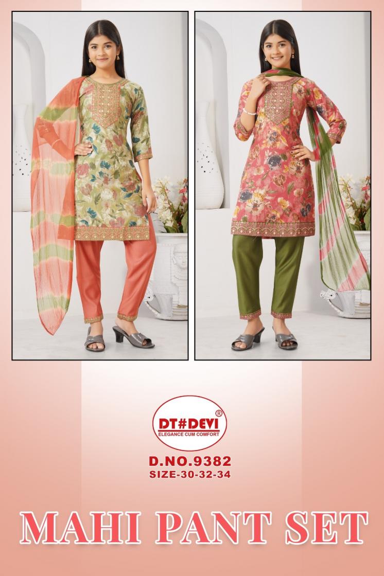 Looking for MAHI 9382 BY DT DEVI FUL STITCH VETICAN SILK COMBO KIDS SUITS Full Catalouge at Best Price? Buy Now MAHI 9382 BY DT DEVI FUL STITCH VETICAN SILK COMBO KIDS SUITS at Wholesale Rate of Rs 3510 with Total 6 Pcs from authroized dealer and supplier of Dt Devi Brand. Cost of Each piece is just only Rs 585 which is very low and affordable price to resale the product in your retail store. rrgandhi is Surat based Wholesale Supplier & Dealer of Dt Devi Brand. Click on Brand name to Know more about Brand's products.