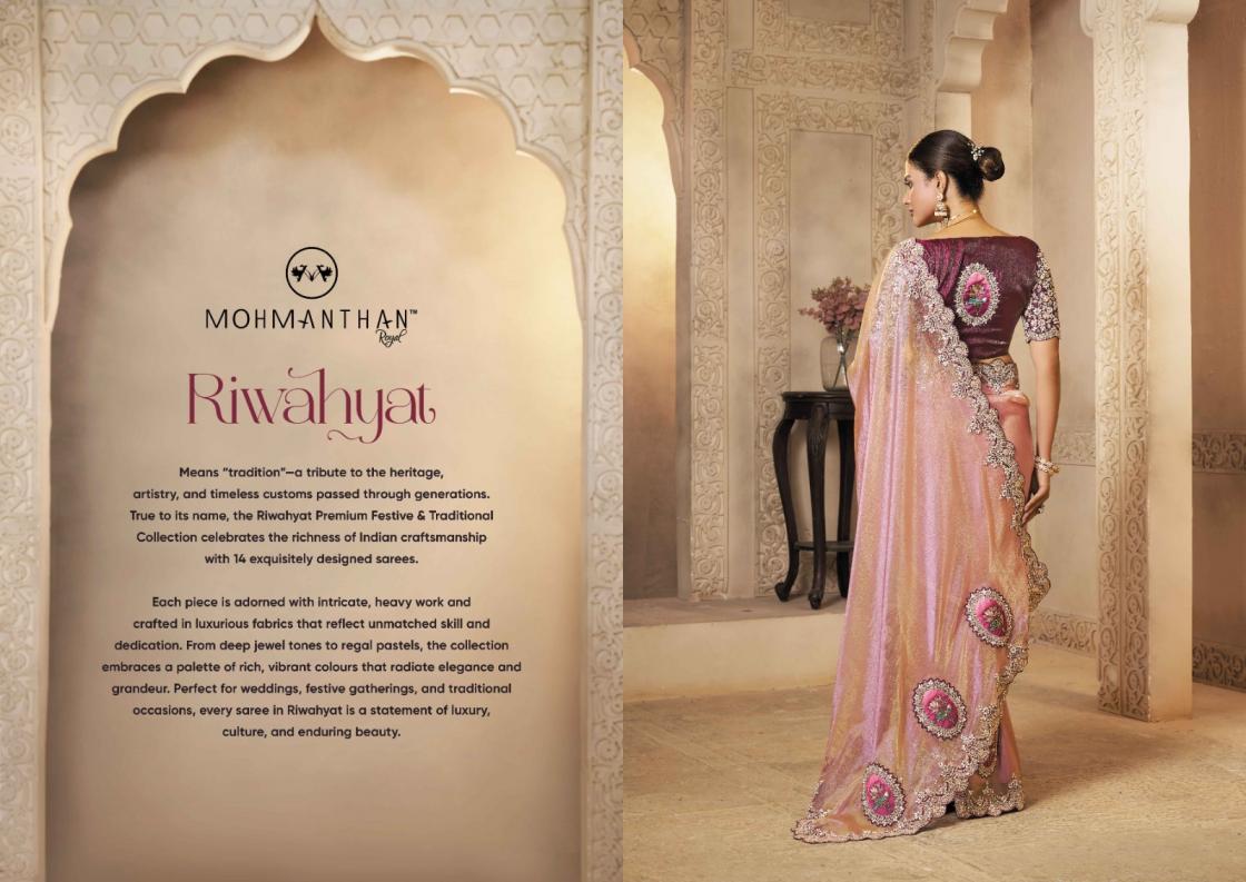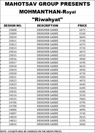 Looking for MAHOTSAV RIWAHYAT SATIN SILK PARTY WEAR SAREE AT BEST RATE Full Catalouge at Best Price? Buy Now MAHOTSAV RIWAHYAT SATIN SILK PARTY WEAR SAREE AT BEST RATE at Wholesale Rate of Rs 117585 with Total 27 Pcs from authroized dealer and supplier of Mahotsav Brand. Cost of Each piece is just only Rs 4355 which is very low and affordable price to resale the product in your retail store. rrgandhi is Surat based Wholesale Supplier & Dealer of Mahotsav Brand. Click on Brand name to Know more about Brand's products.