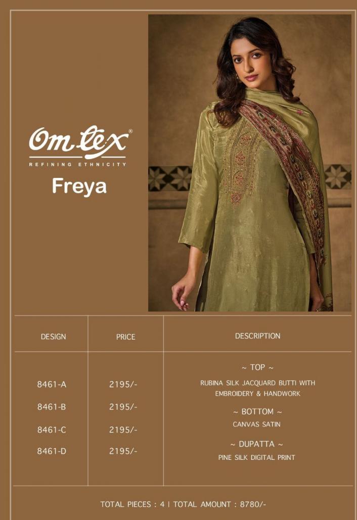 Looking for OMTEX FREYA RUBINA SILK JACQUARD SHOP TRENDY DRESS MATERIALS Full Catalouge at Best Price? Buy Now OMTEX FREYA RUBINA SILK JACQUARD SHOP TRENDY DRESS MATERIALS at Wholesale Rate of Rs 8780 with Total 4 Pcs from authroized dealer and supplier of Om Tex Brand. Cost of Each piece is just only Rs 2195 which is very low and affordable price to resale the product in your retail store. rrgandhi is Surat based Wholesale Supplier & Dealer of Om Tex Brand. Click on Brand name to Know more about Brand's products.
