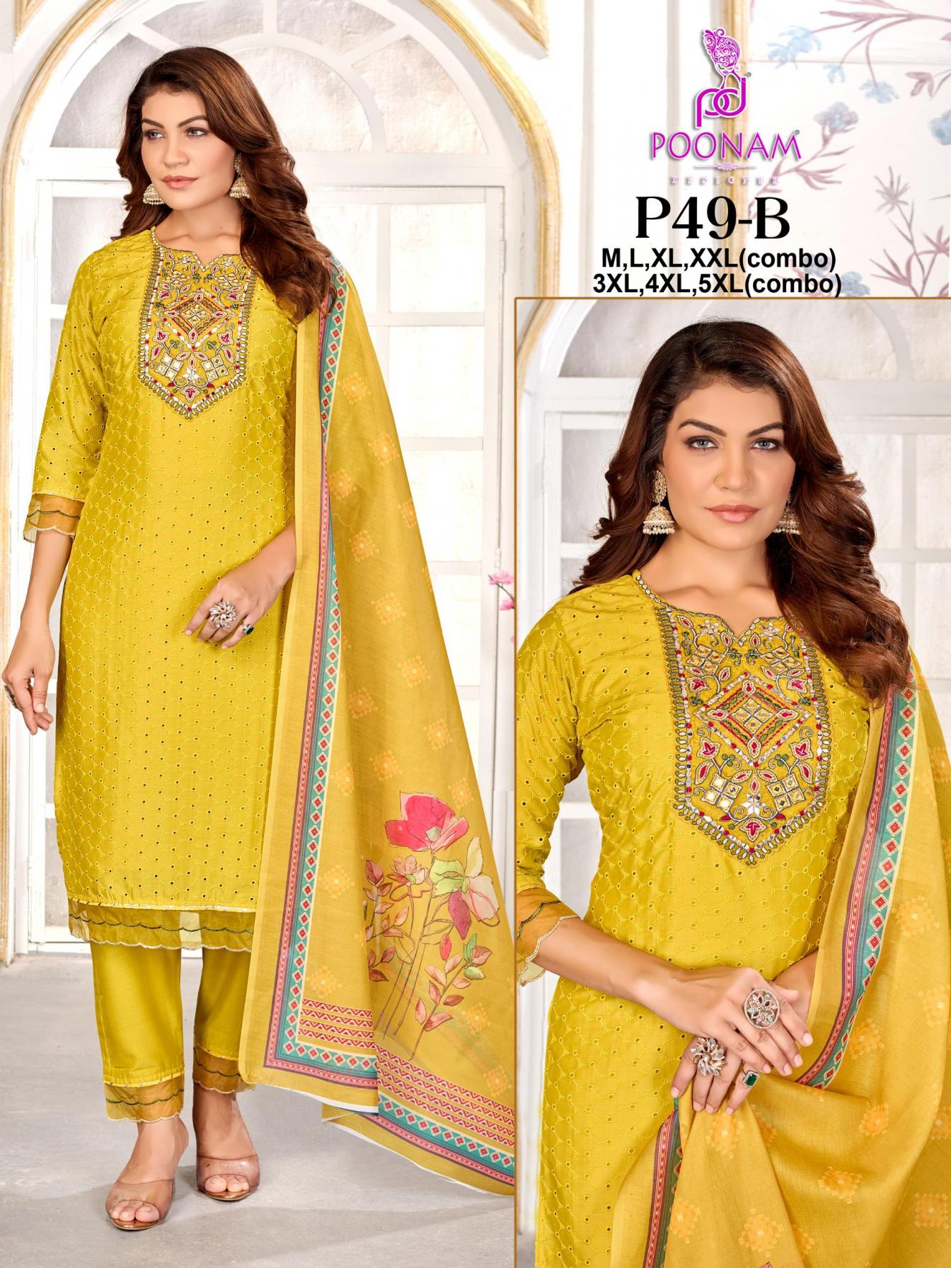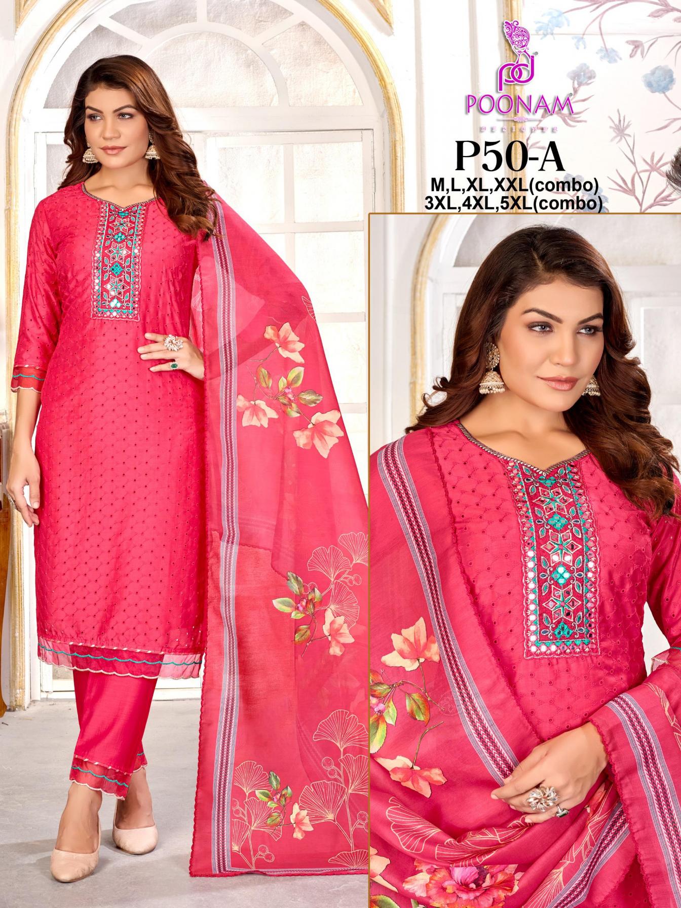 Looking for P50 BY POONAM DESIGNER MUSLIN FANCY READYMADE COMBO SUITS ONLINE Full Catalouge at Best Price? Buy Now P50 BY POONAM DESIGNER MUSLIN FANCY READYMADE COMBO SUITS ONLINE at Wholesale Rate of Rs 16788 with Total 12 Pcs from authroized dealer and supplier of POONAM DESIGNER Brand. Cost of Each piece is just only Rs 1399 which is very low and affordable price to resale the product in your retail store. rrgandhi is Surat based Wholesale Supplier & Dealer of POONAM DESIGNER Brand. Click on Brand name to Know more about Brand's products.