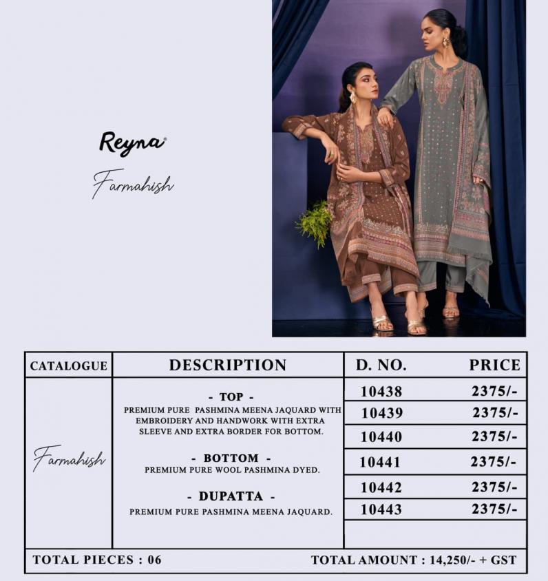 Looking for REYNA FARMAHISH PASHMINA MEENA JACQUARD UNSTITCH SUITS Full Catalouge at Best Price? Buy Now REYNA FARMAHISH PASHMINA MEENA JACQUARD UNSTITCH SUITS at Wholesale Rate of Rs 14250 with Total 6 Pcs from authroized dealer and supplier of Reyna Brand. Cost of Each piece is just only Rs 2375 which is very low and affordable price to resale the product in your retail store. rrgandhi is Surat based Wholesale Supplier & Dealer of Reyna Brand. Click on Brand name to Know more about Brand's products.