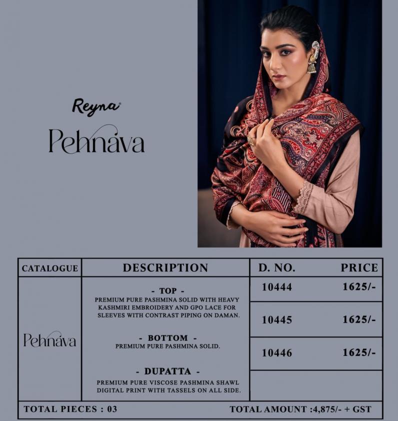 Looking for REYNA PEHNAVA PASHMINA SOLID UNSTITCH 3PCS DRESS Full Catalouge at Best Price? Buy Now REYNA PEHNAVA PASHMINA SOLID UNSTITCH 3PCS DRESS at Wholesale Rate of Rs 4875 with Total 3 Pcs from authroized dealer and supplier of Reyna Brand. Cost of Each piece is just only Rs 1625 which is very low and affordable price to resale the product in your retail store. rrgandhi is Surat based Wholesale Supplier & Dealer of Reyna Brand. Click on Brand name to Know more about Brand's products.