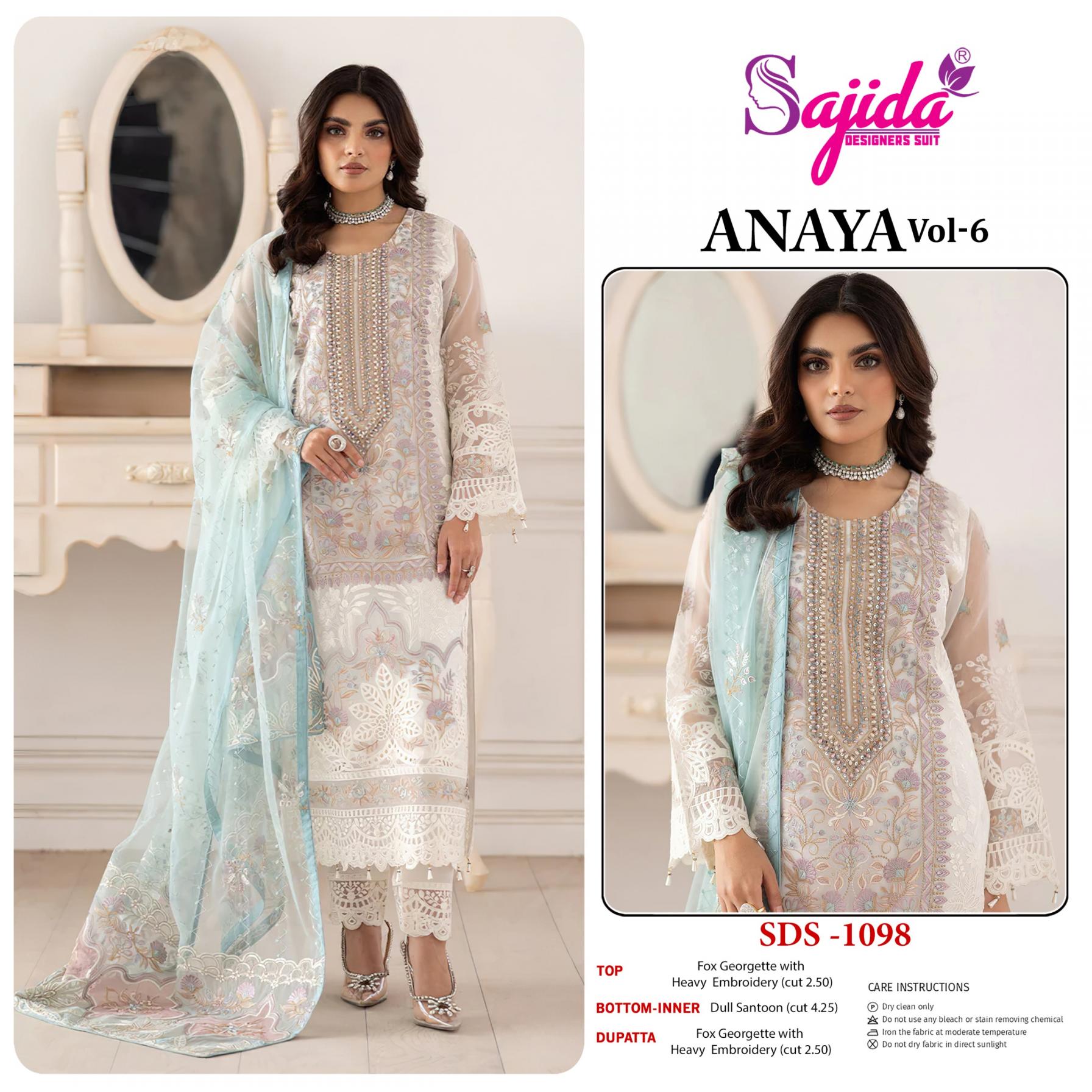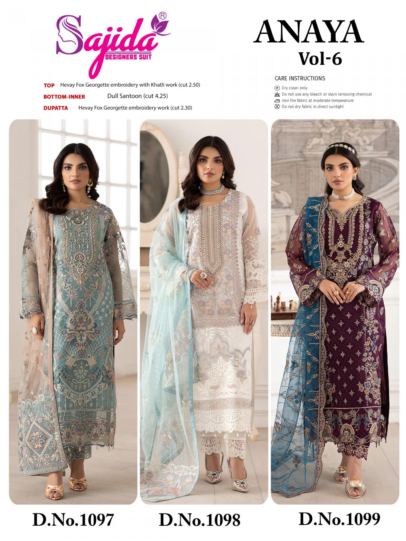 Looking for sajida anaya vol 6 designer georgette pakistani 3pcs dress Full Catalouge at Best Price? Buy Now sajida anaya vol 6 designer georgette pakistani 3pcs dress at Wholesale Rate of Rs 4197 with Total 3 Pcs from authroized dealer and supplier of Sajida designers Brand. Cost of Each piece is just only Rs 1399 which is very low and affordable price to resale the product in your retail store. rrgandhi is Surat based Wholesale Supplier & Dealer of Sajida designers Brand. Click on Brand name to Know more about Brand's products.