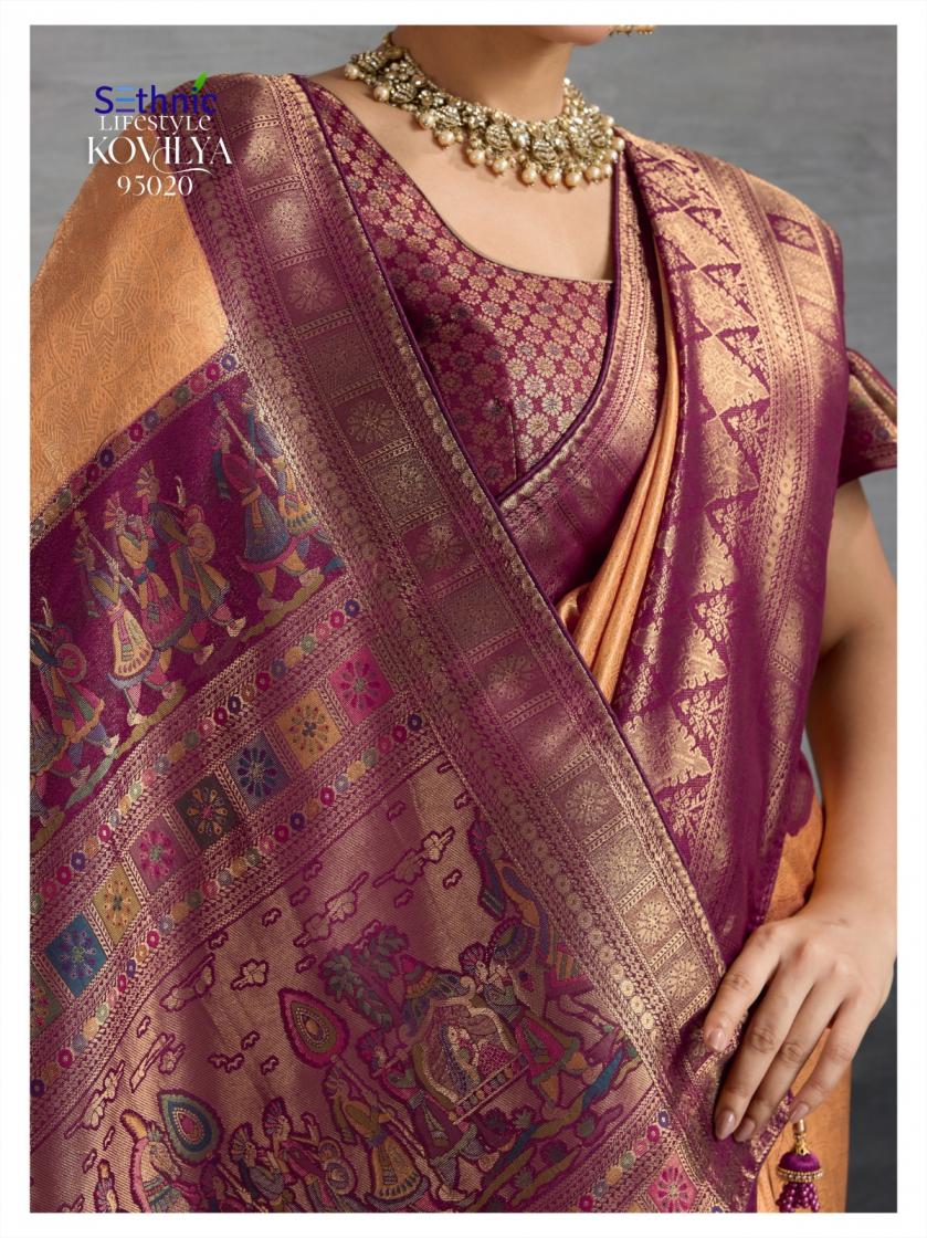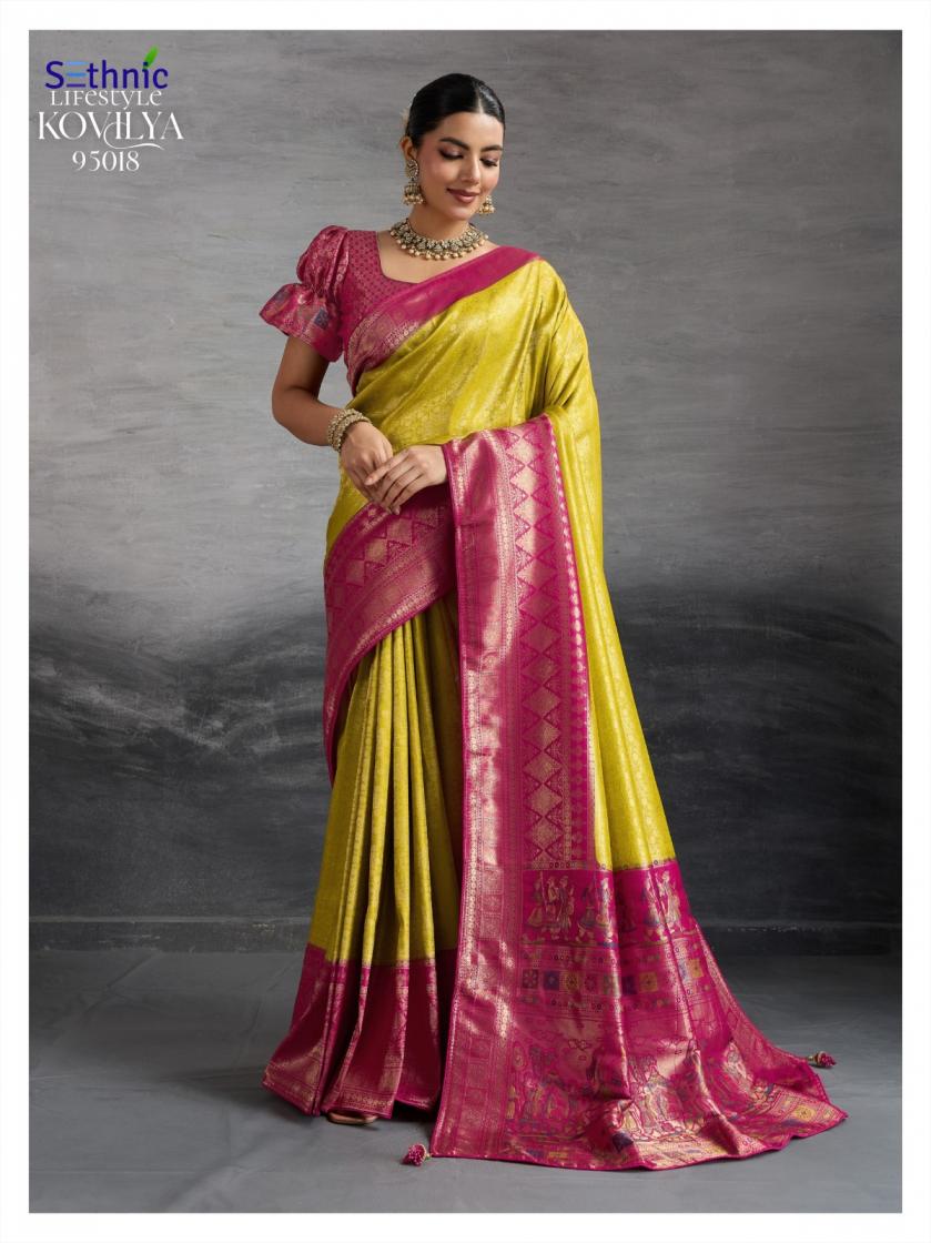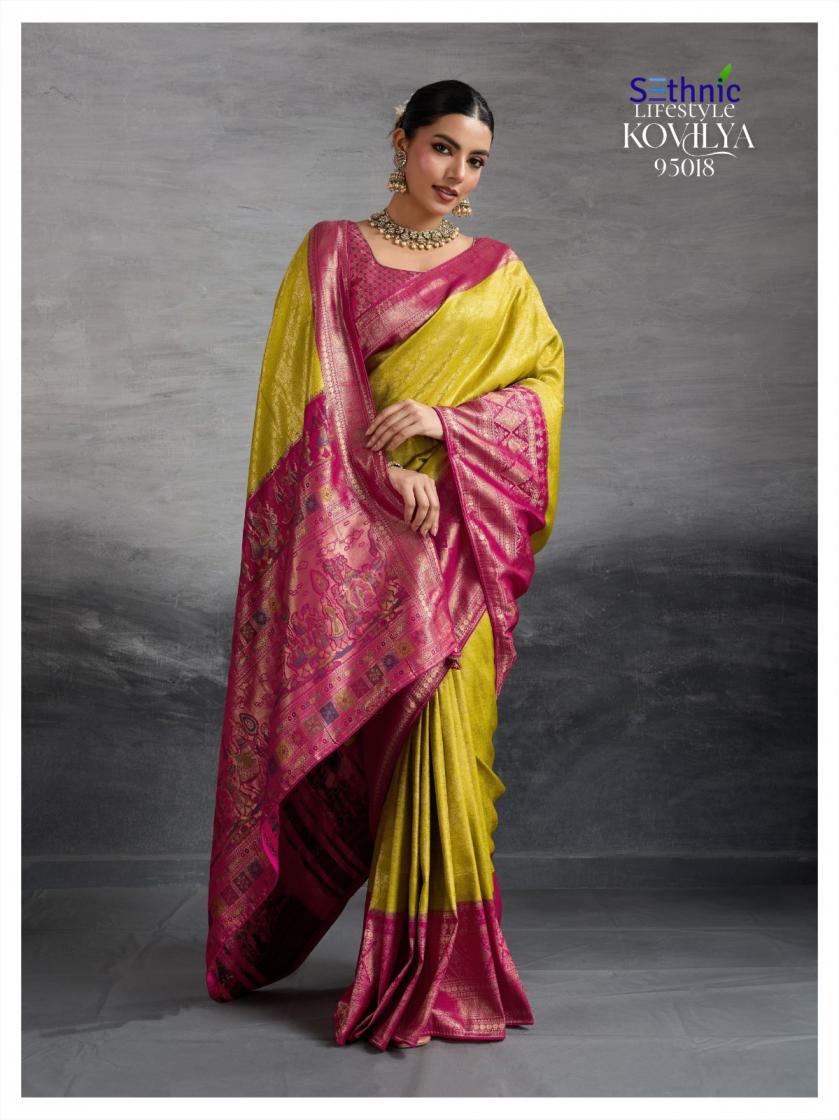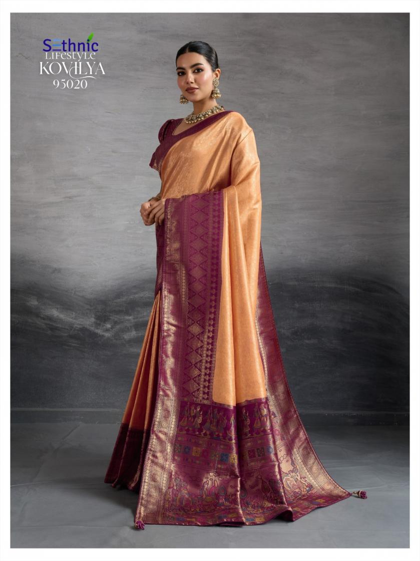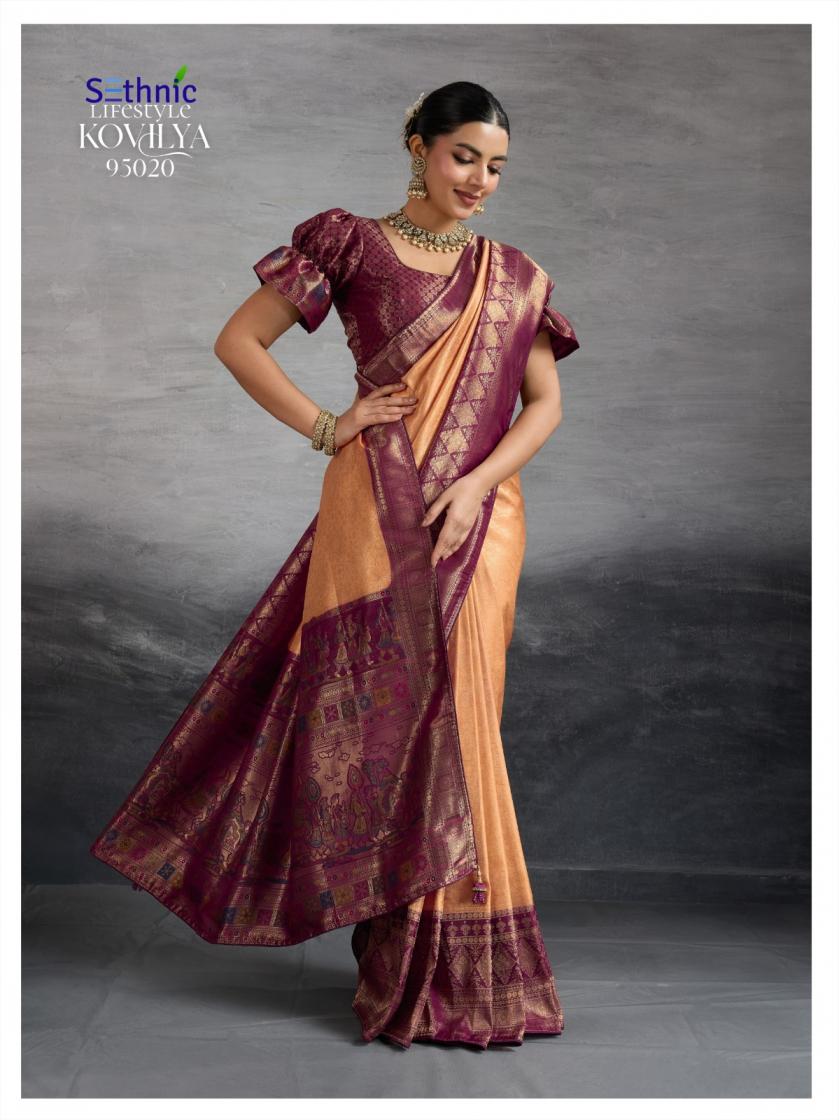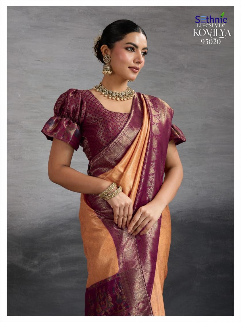 Looking for SETHNIC LIFESTYLE KOVILYA VOL 5 ELEGANCE KANJIVARAM SILK SAREE ONLINE Full Catalouge at Best Price? Buy Now SETHNIC LIFESTYLE KOVILYA VOL 5 ELEGANCE KANJIVARAM SILK SAREE ONLINE at Wholesale Rate of Rs 6380 with Total 4 Pcs from authroized dealer and supplier of Sethnic Lifestyle Brand. Cost of Each piece is just only Rs 1595 which is very low and affordable price to resale the product in your retail store. rrgandhi is Surat based Wholesale Supplier & Dealer of Sethnic Lifestyle Brand. Click on Brand name to Know more about Brand's products.