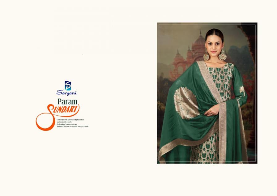 Looking for SUNDARI BY SARGAM PRINTS PRETTY BANGLORY SILK JACQUARD LADIES SUITS Full Catalouge at Best Price? Buy Now SUNDARI BY SARGAM PRINTS PRETTY BANGLORY SILK JACQUARD LADIES SUITS at Wholesale Rate of Rs 6780 with Total 4 Pcs from authroized dealer and supplier of Sargam Prints Brand. Cost of Each piece is just only Rs 1695 which is very low and affordable price to resale the product in your retail store. rrgandhi is Surat based Wholesale Supplier & Dealer of Sargam Prints Brand. Click on Brand name to Know more about Brand's products.