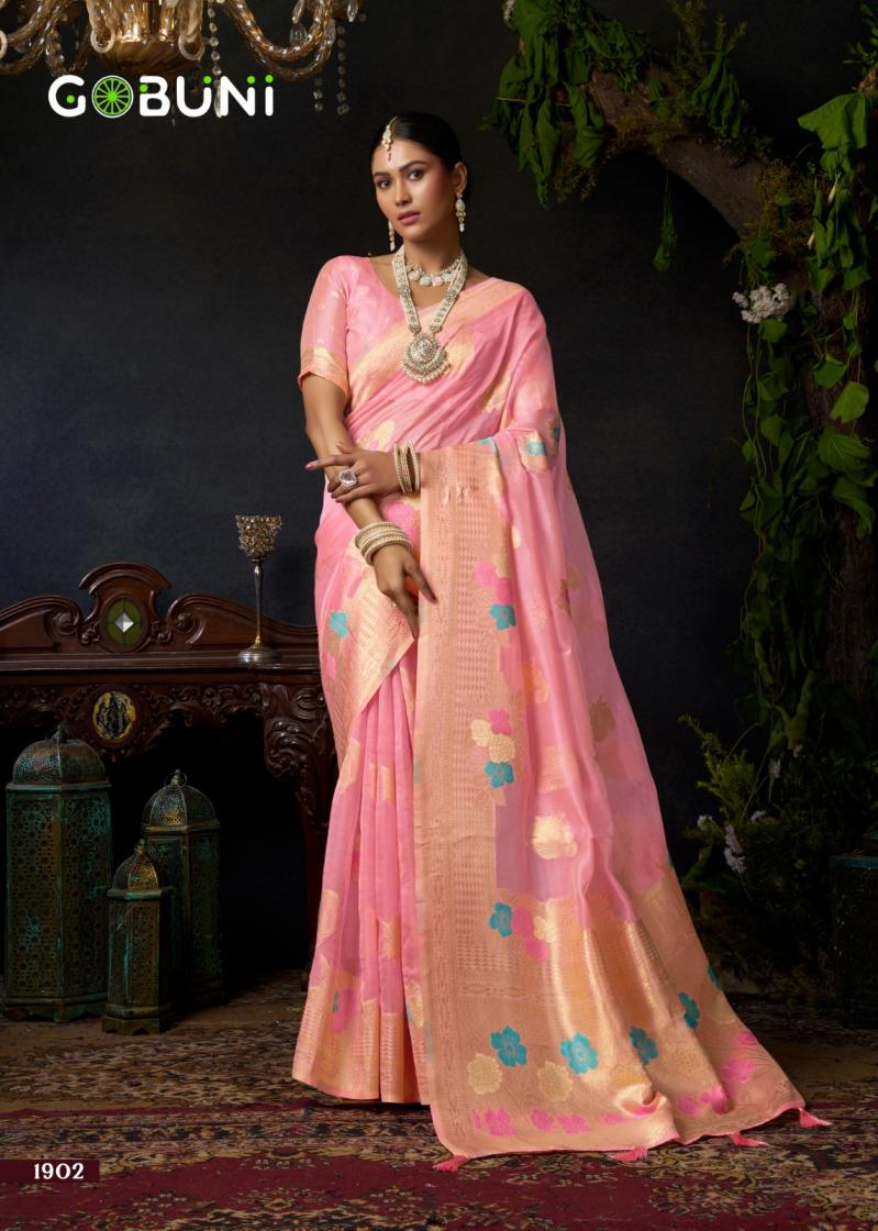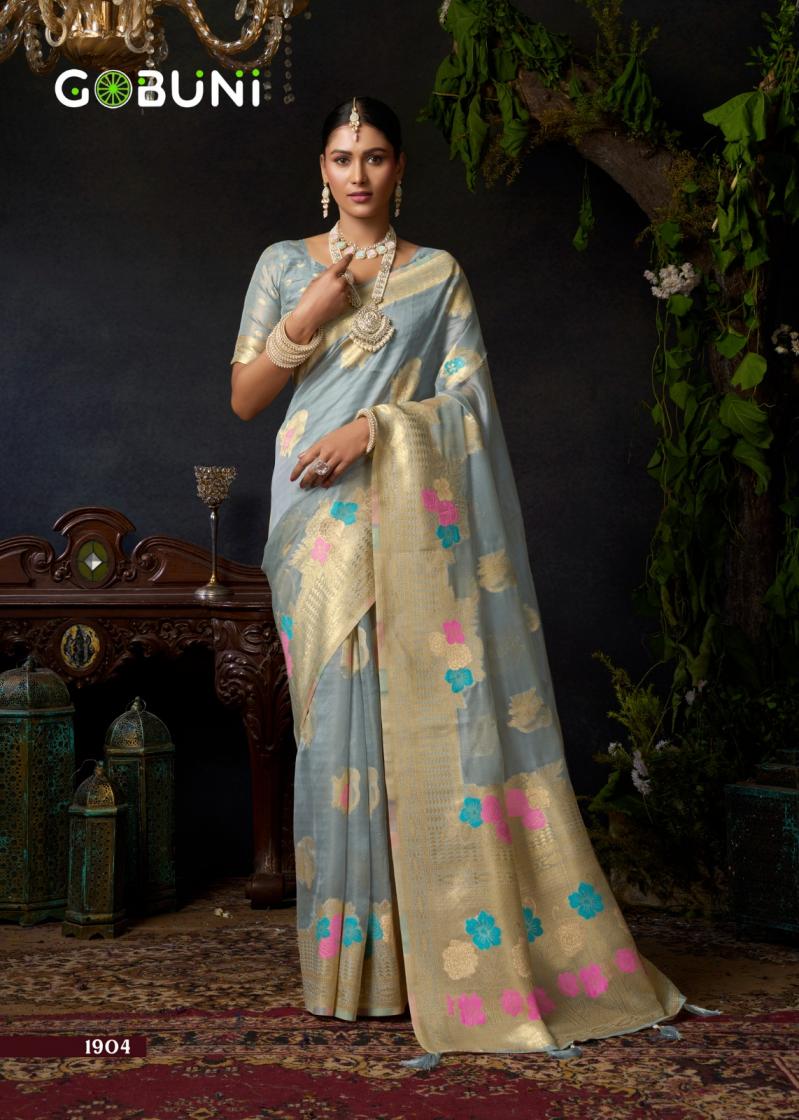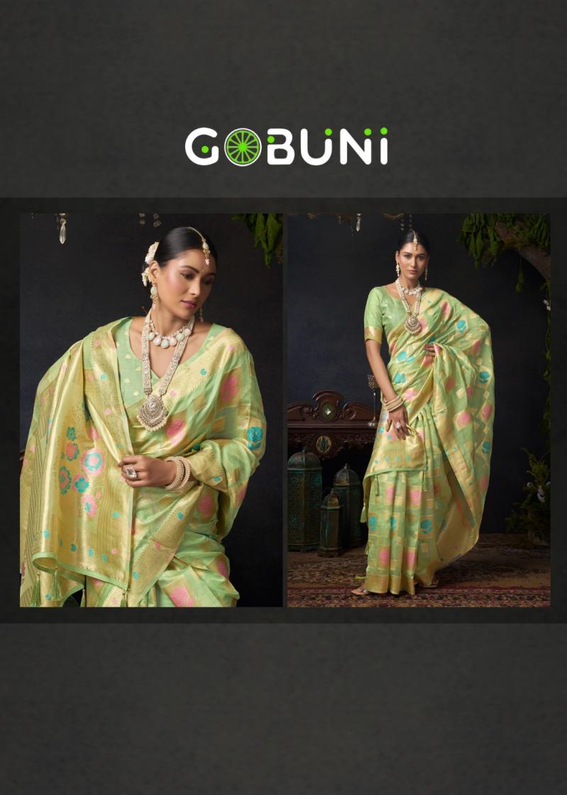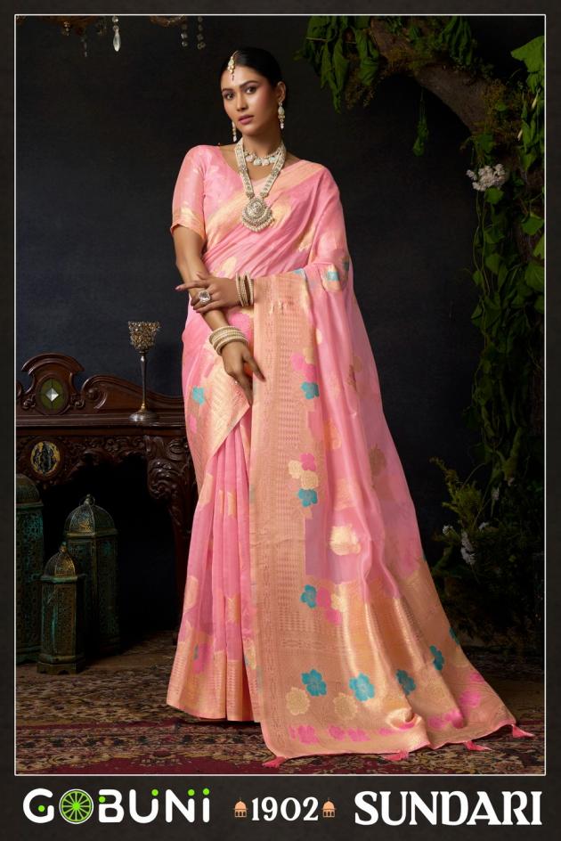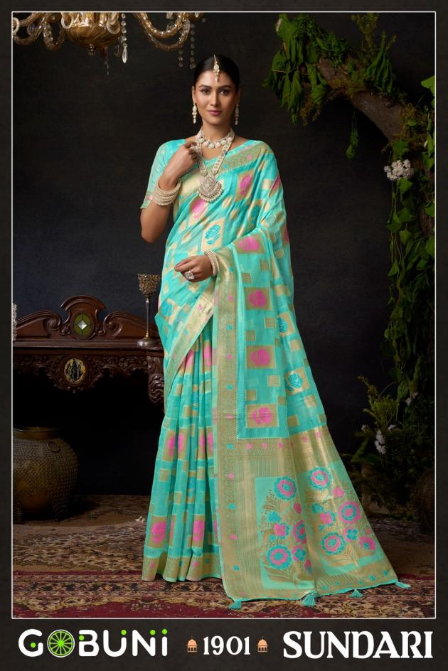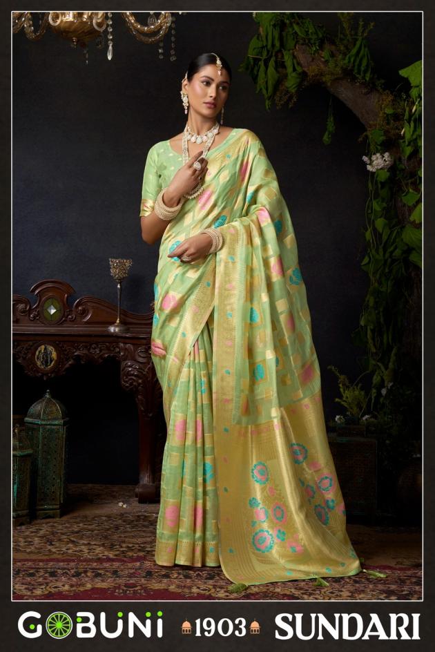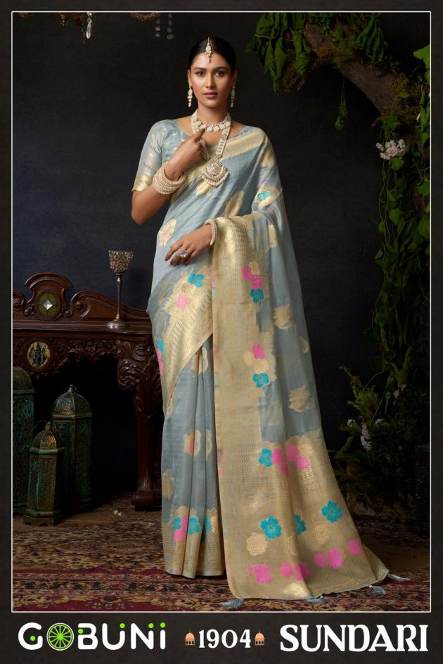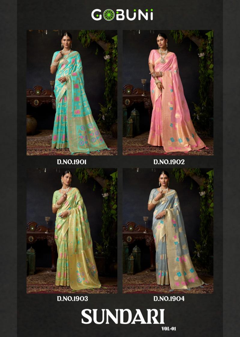 Looking for SUNDARI VOL 1 BY GOBUNI ORGANZA KHADI OCCASION WEAR SAREES Full Catalouge at Best Price? Buy Now SUNDARI VOL 1 BY GOBUNI ORGANZA KHADI OCCASION WEAR SAREES at Wholesale Rate of Rs 4600 with Total 4 Pcs from authroized dealer and supplier of Gobuni Brand. Cost of Each piece is just only Rs 1150 which is very low and affordable price to resale the product in your retail store. rrgandhi is Surat based Wholesale Supplier & Dealer of Gobuni Brand. Click on Brand name to Know more about Brand's products.