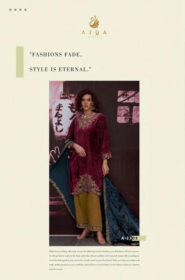 Looking for THE DANCE OF LOVE BY AIQA LIFESTYLE VISCOSE VELVET SUIT ONLINE Full Catalouge at Best Price? Buy Now THE DANCE OF LOVE BY AIQA LIFESTYLE VISCOSE VELVET SUIT ONLINE at Wholesale Rate of Rs 24150 with Total 6 Pcs from authroized dealer and supplier of Aiqa Lifestyle Brand. Cost of Each piece is just only Rs 4025 which is very low and affordable price to resale the product in your retail store. rrgandhi is Surat based Wholesale Supplier & Dealer of Aiqa Lifestyle Brand. Click on Brand name to Know more about Brand's products.