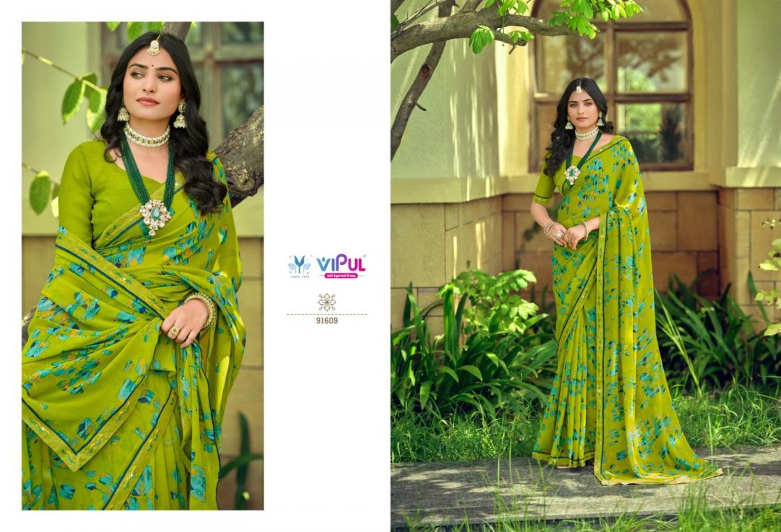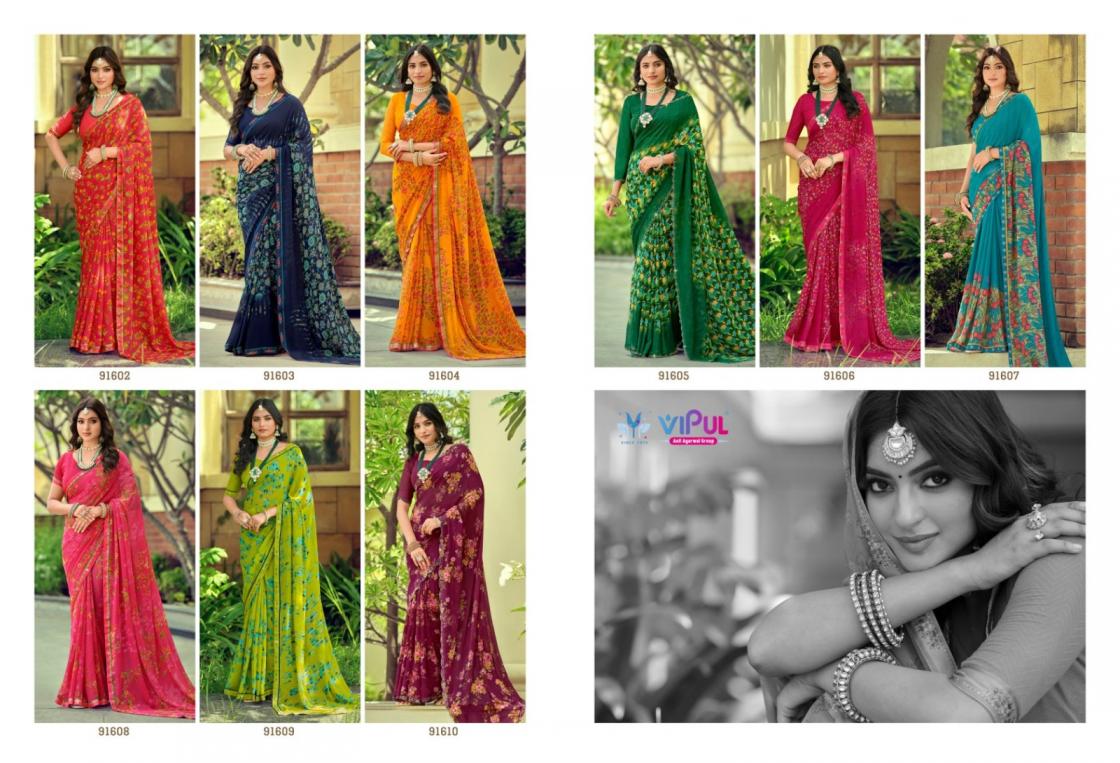 Looking for TULSI VOL 10 BY VIPUL UNIQUE 91602-91610 SAREES Full Catalouge at Best Price? Buy Now TULSI VOL 10 BY VIPUL UNIQUE 91602-91610 SAREES at Wholesale Rate of Rs 7011 with Total 9 Pcs from authroized dealer and supplier of Vipul Fashion Brand. Cost of Each piece is just only Rs 779 which is very low and affordable price to resale the product in your retail store. rrgandhi is Surat based Wholesale Supplier & Dealer of Vipul Fashion Brand. Click on Brand name to Know more about Brand's products.