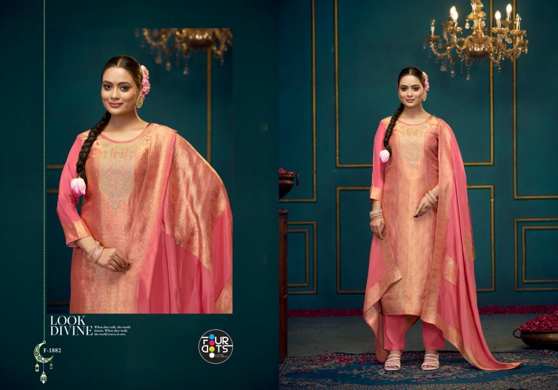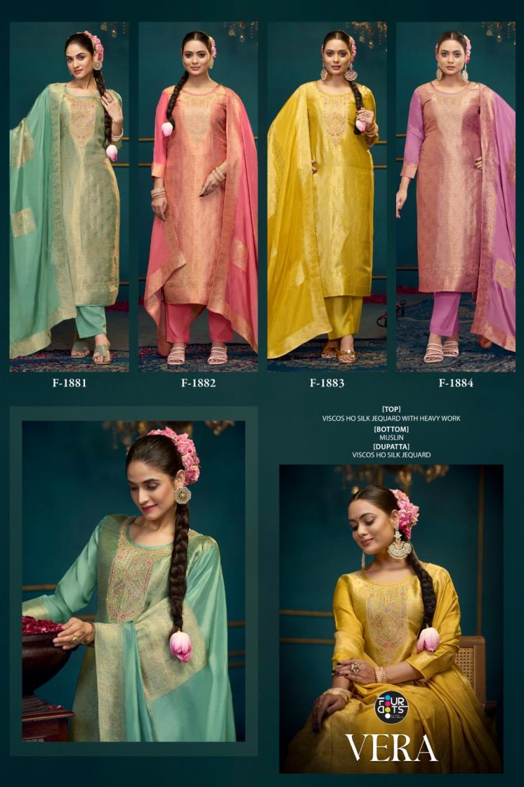 Looking for VERA BY FOURDOTS VISCOSE SILK JACQUARD UNIQUE SUITS Full Catalouge at Best Price? Buy Now VERA BY FOURDOTS VISCOSE SILK JACQUARD UNIQUE SUITS at Wholesale Rate of Rs 6300 with Total 4 Pcs from authroized dealer and supplier of Fourdots Brand. Cost of Each piece is just only Rs 1575 which is very low and affordable price to resale the product in your retail store. rrgandhi is Surat based Wholesale Supplier & Dealer of Fourdots Brand. Click on Brand name to Know more about Brand's products.