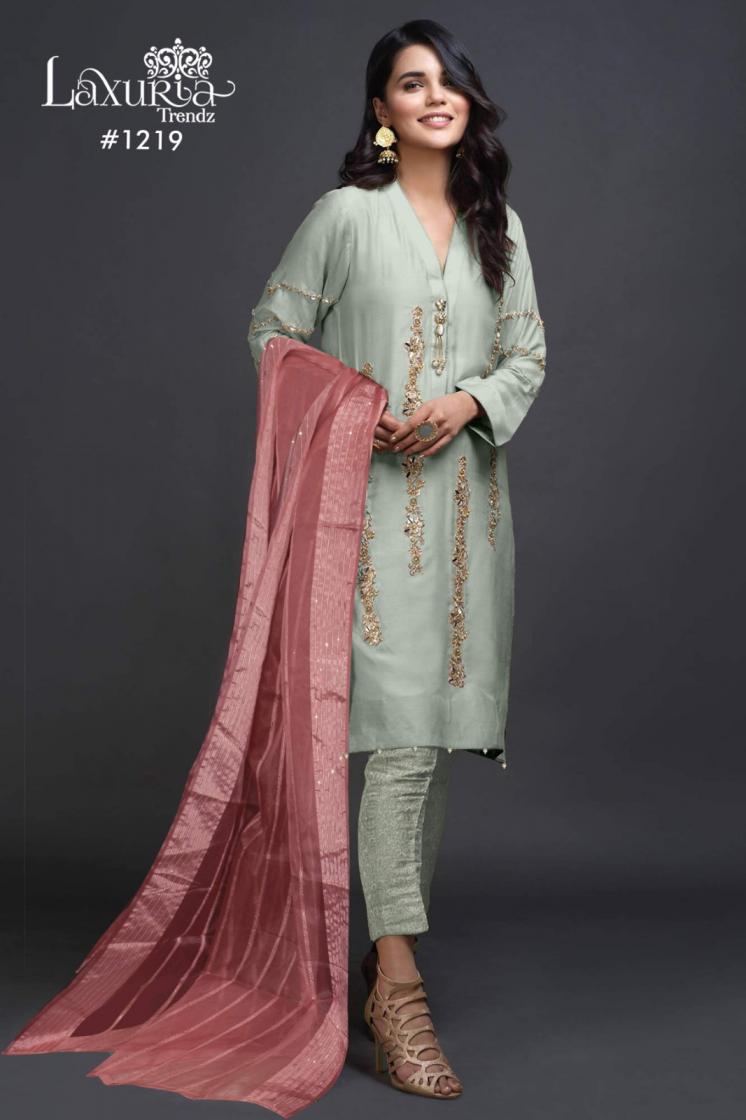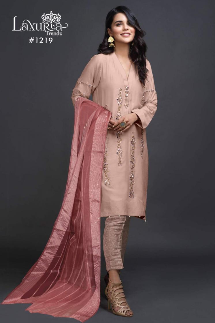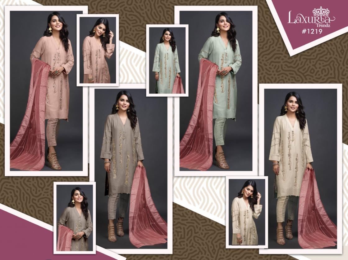 Looking for 1219 BY LAXURIA TRENDZ STYLISH IMPORTED SATIN PAKISTANI SUIT FOR WOMENS Full Catalouge at Best Price? Buy Now 1219 BY LAXURIA TRENDZ STYLISH IMPORTED SATIN PAKISTANI SUIT FOR WOMENS at Wholesale Rate of Rs 18000 with Total 12 Pcs from authroized dealer and supplier of Laxuria Trendz Brand. Cost of Each piece is just only Rs 1500 which is very low and affordable price to resale the product in your retail store. rrgandhi is Surat based Wholesale Supplier & Dealer of Laxuria Trendz Brand. Click on Brand name to Know more about Brand's products.