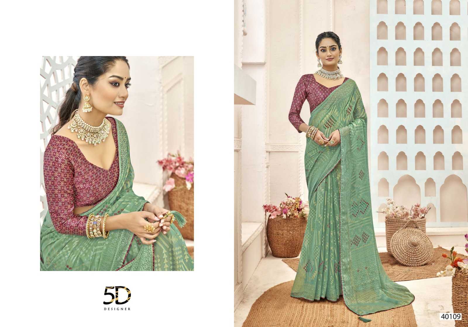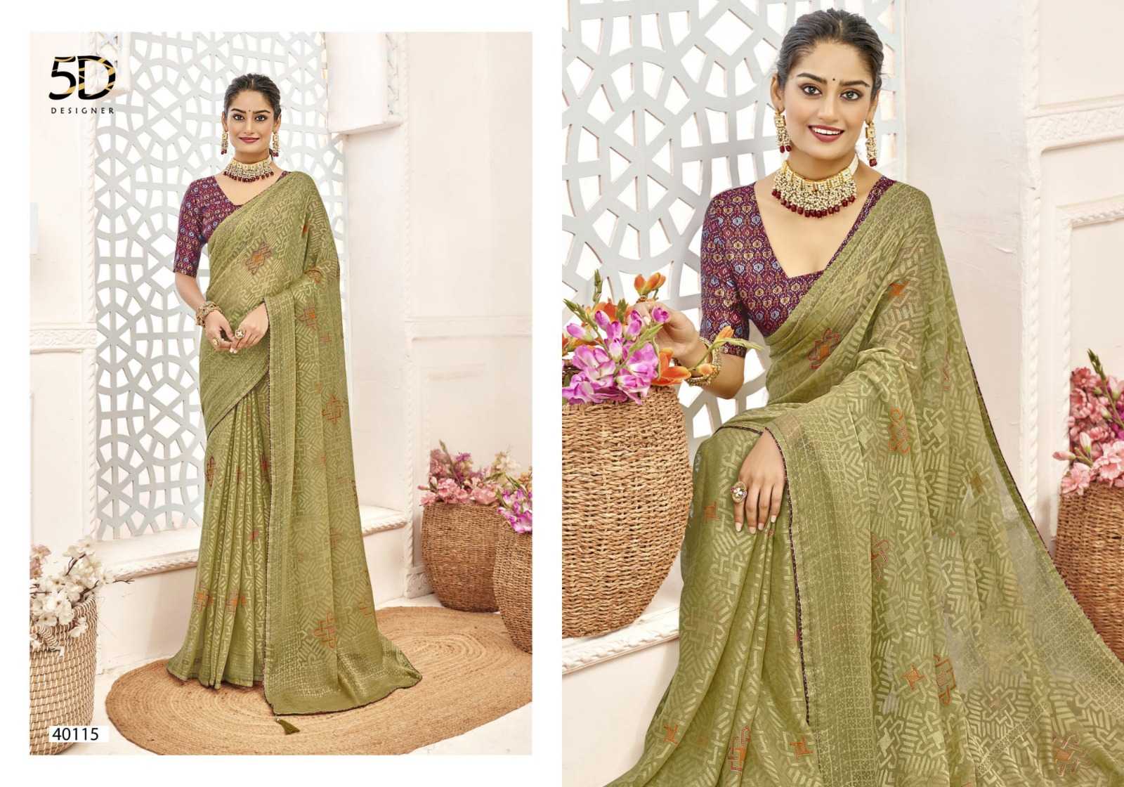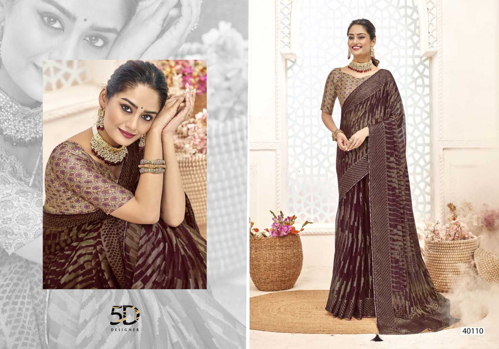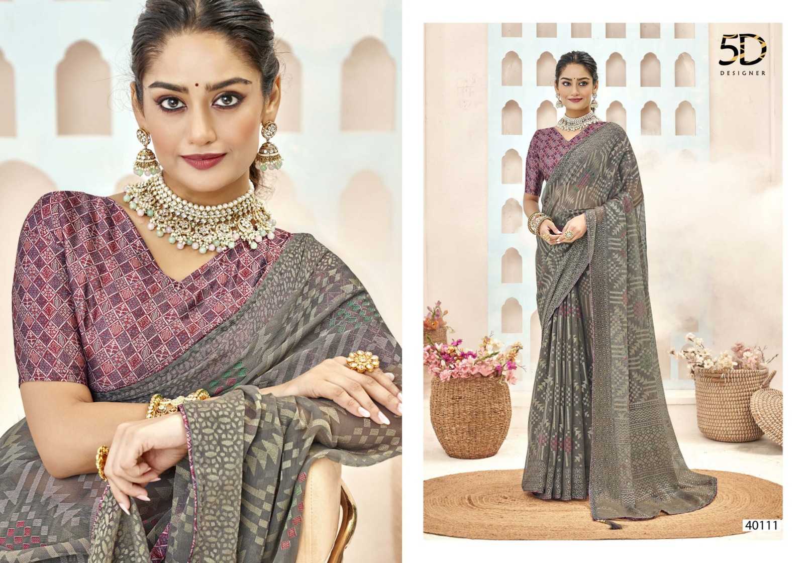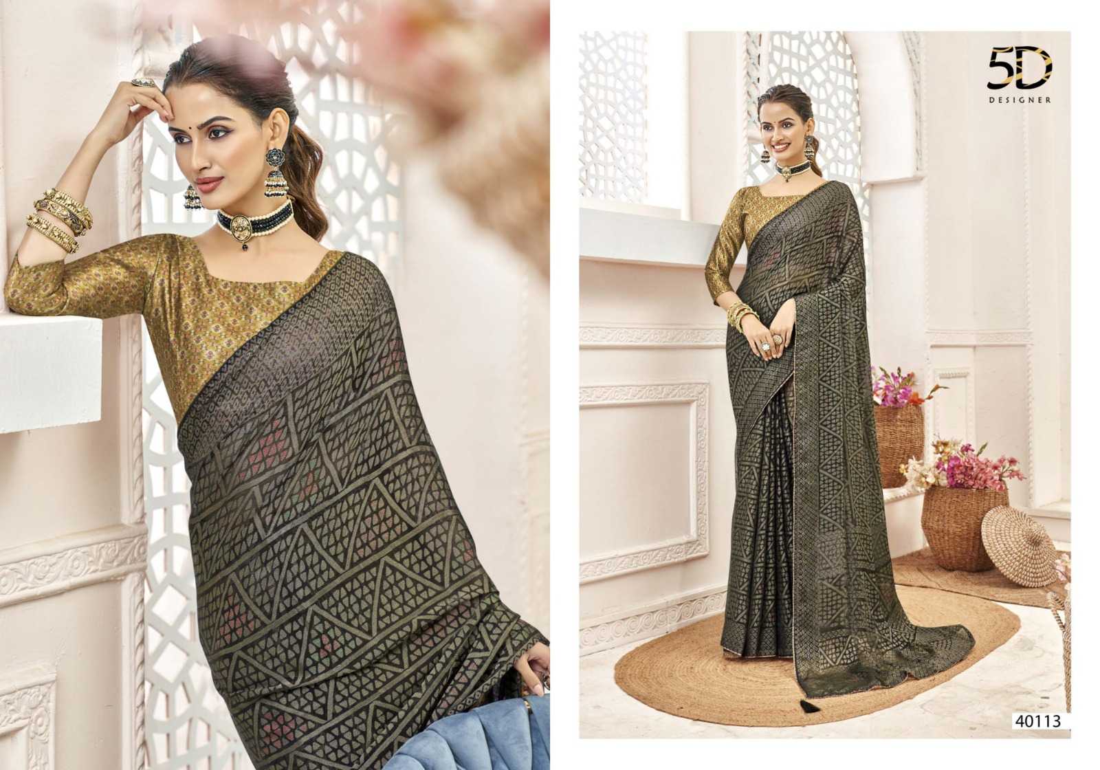 Looking for 5d designer venice brasso pretty look chiffon brasso with digital printed blouse exports Full Catalouge at Best Price? Buy Now 5d designer venice brasso pretty look chiffon brasso with digital printed blouse exports at Wholesale Rate of Rs 4600 with Total 8 Pcs from authroized dealer and supplier of 5D Designer Brand. Cost of Each piece is just only Rs 575 which is very low and affordable price to resale the product in your retail store. rrgandhi is Surat based Wholesale Supplier & Dealer of 5D Designer Brand. Click on Brand name to Know more about Brand's products.