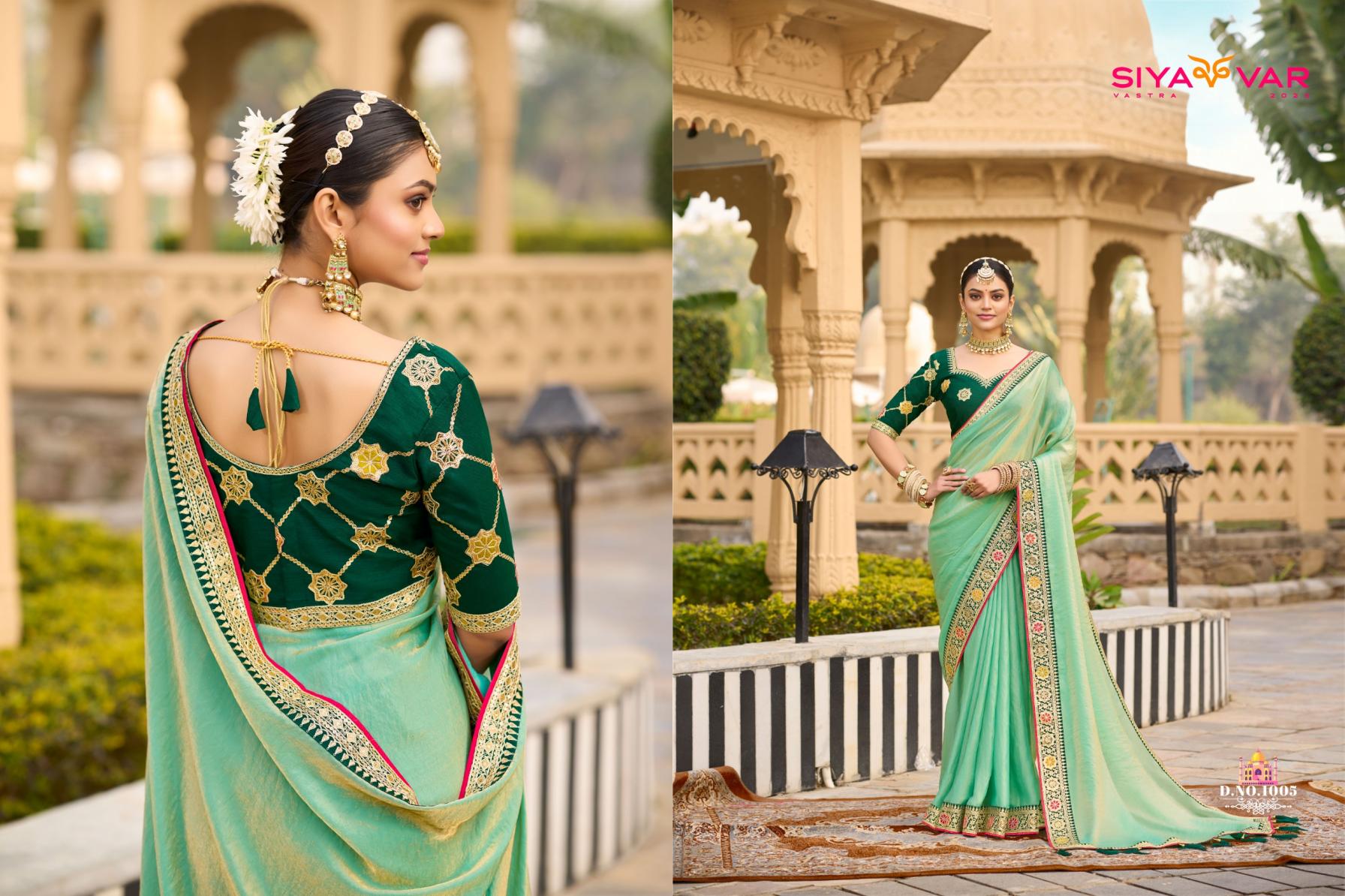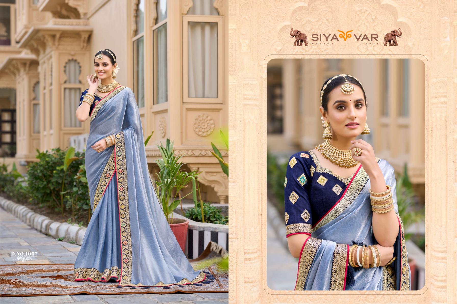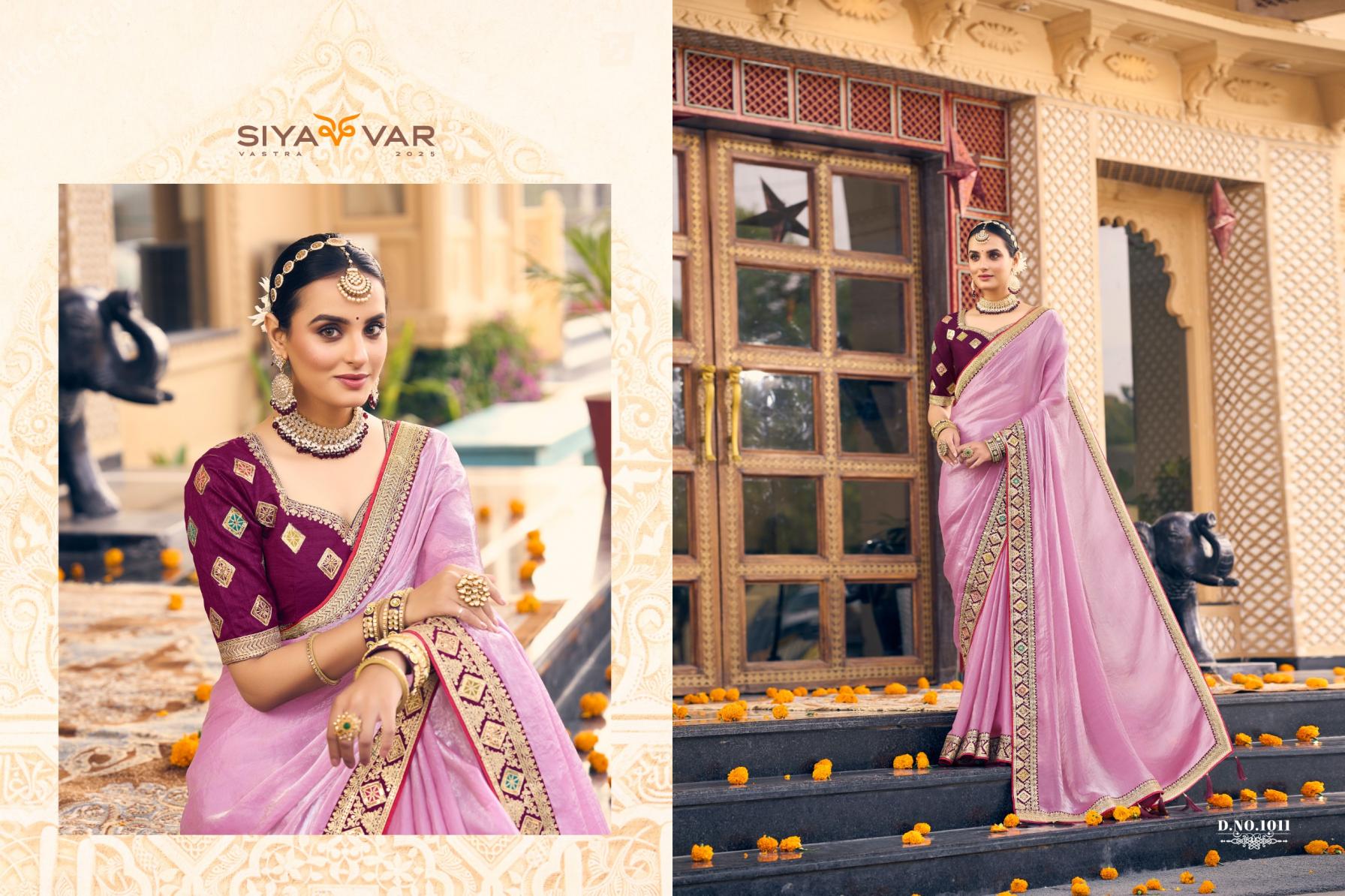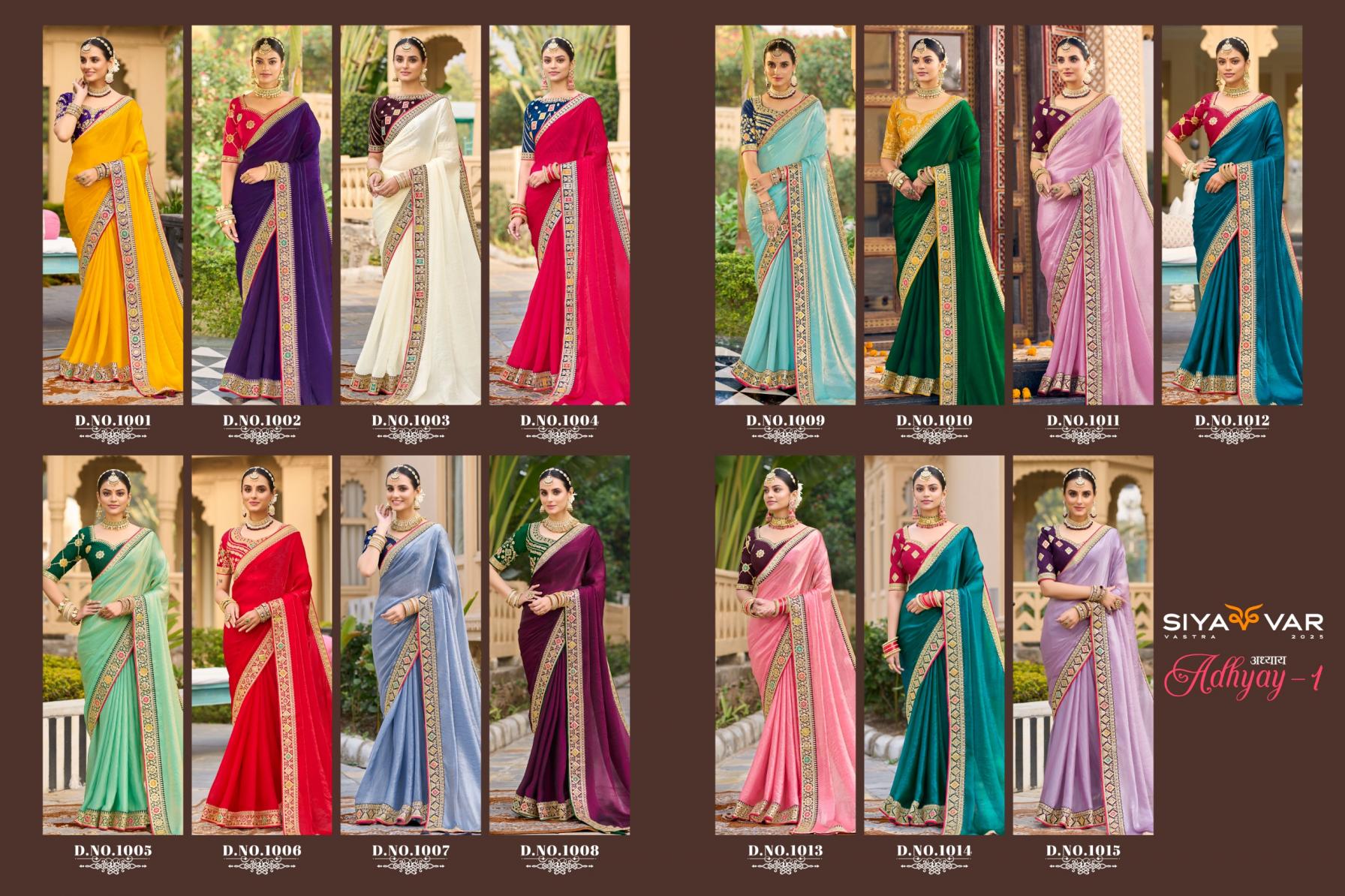Looking for ADHYAY VOL 1 BY SIYA VAR 1001-1015 SERIES FENDI SATIN INDIAN TRADITIONAL SAREES Full Catalouge at Best Price? Buy Now ADHYAY VOL 1 BY SIYA VAR 1001-1015 SERIES FENDI SATIN INDIAN TRADITIONAL SAREES at Wholesale Rate of Rs 22125 with Total 15 Pcs from authroized dealer and supplier of siya var Brand. Cost of Each piece is just only Rs 1475 which is very low and affordable price to resale the product in your retail store. rrgandhi is Surat based Wholesale Supplier & Dealer of siya var Brand. Click on Brand name to Know more about Brand's products.