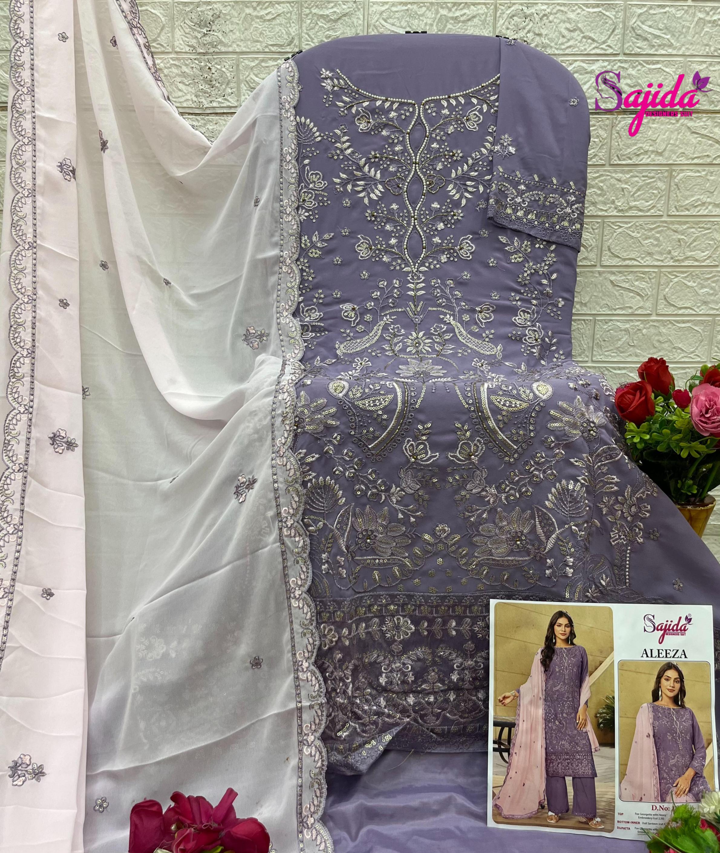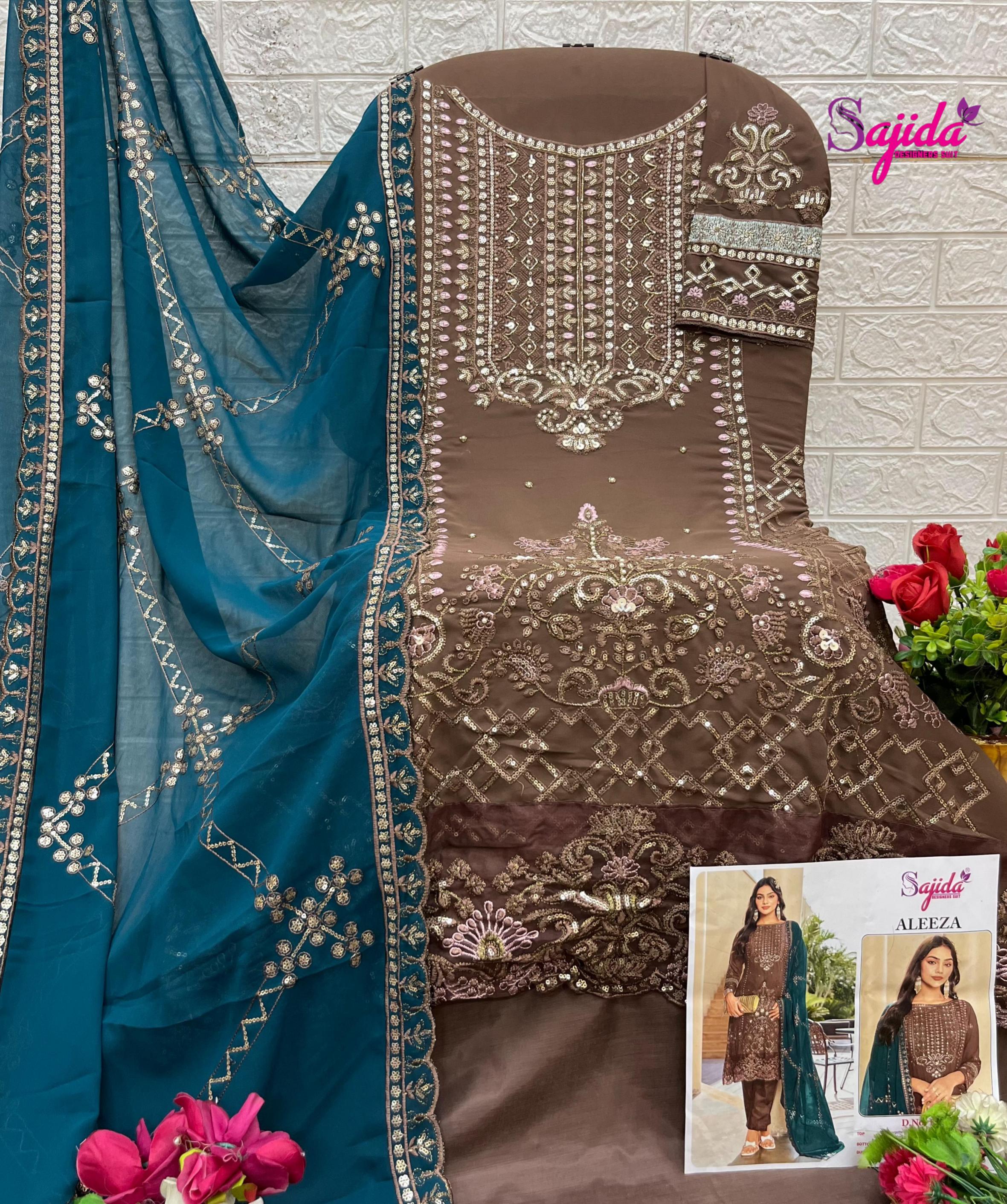 Looking for ALEEZA BY SAJIDA DESIGNER GEORGETTE PAKISTANI 3PCS DRESS Full Catalouge at Best Price? Buy Now ALEEZA BY SAJIDA DESIGNER GEORGETTE PAKISTANI 3PCS DRESS at Wholesale Rate of Rs 4080 with Total 3 Pcs from authroized dealer and supplier of Sajida designers Brand. Cost of Each piece is just only Rs 1360 which is very low and affordable price to resale the product in your retail store. rrgandhi is Surat based Wholesale Supplier & Dealer of Sajida designers Brand. Click on Brand name to Know more about Brand's products.