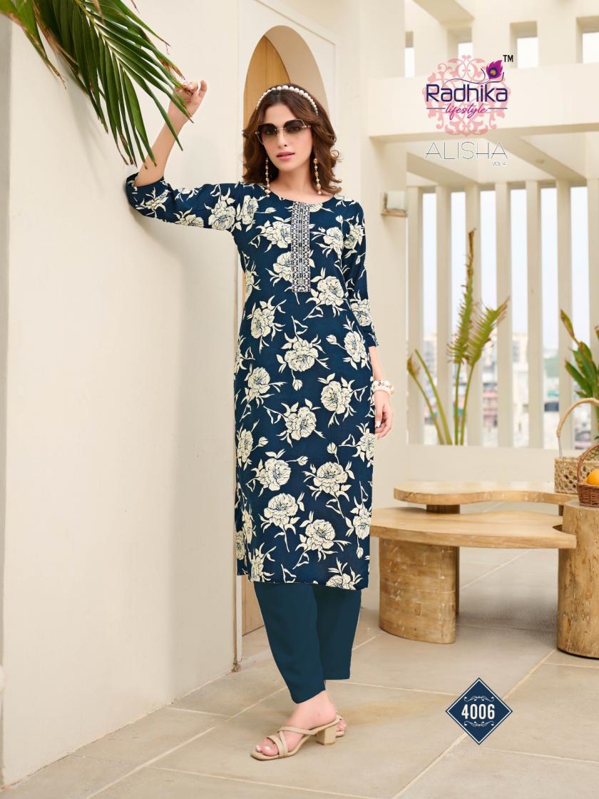 Looking for ALISHA VOL 4 BY RADHIKA LIFESTYLE RAYON READYMADE FANCY PLUS SIZE KURTI ONLINE Full Catalouge at Best Price? Buy Now ALISHA VOL 4 BY RADHIKA LIFESTYLE RAYON READYMADE FANCY PLUS SIZE KURTI ONLINE at Wholesale Rate of Rs 2000 with Total 8 Pcs from authroized dealer and supplier of Radhika Lifestyle Brand. Cost of Each piece is just only Rs 250 which is very low and affordable price to resale the product in your retail store. rrgandhi is Surat based Wholesale Supplier & Dealer of Radhika Lifestyle Brand. Click on Brand name to Know more about Brand's products.
