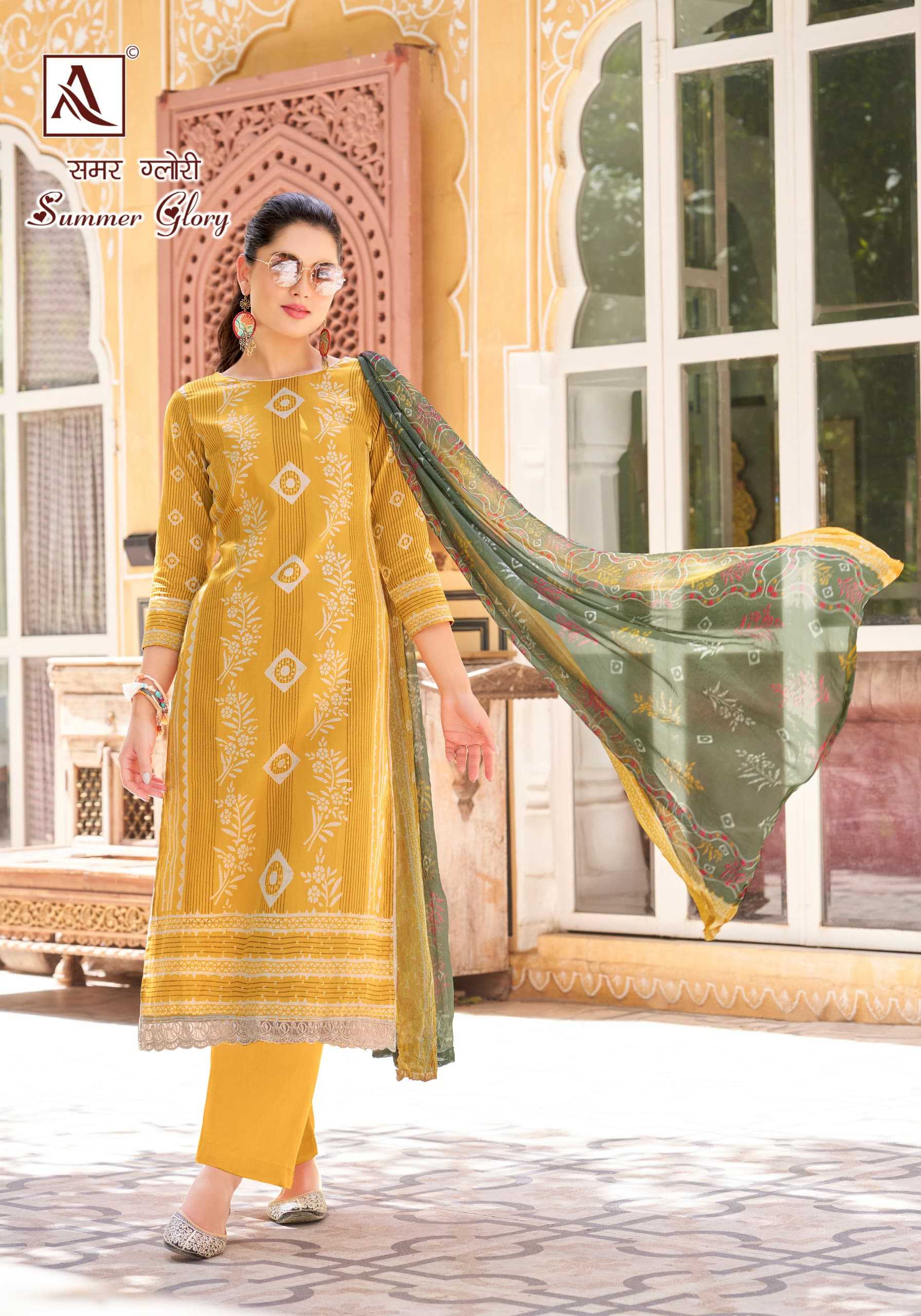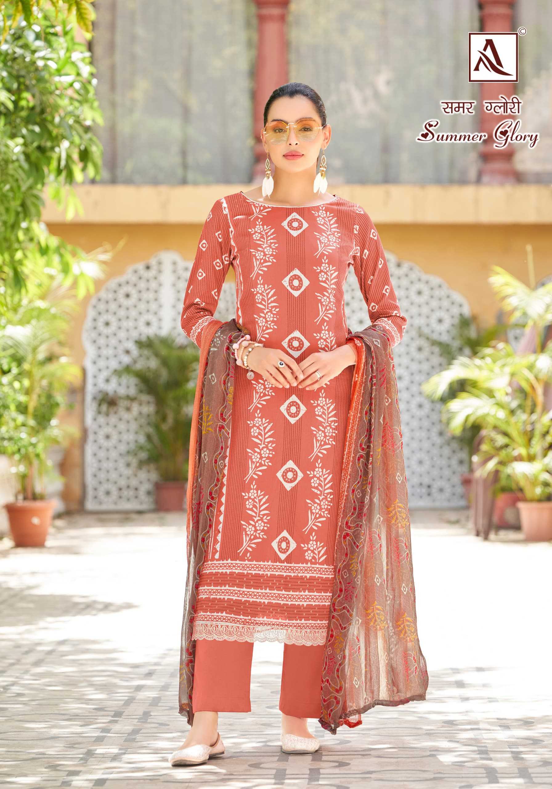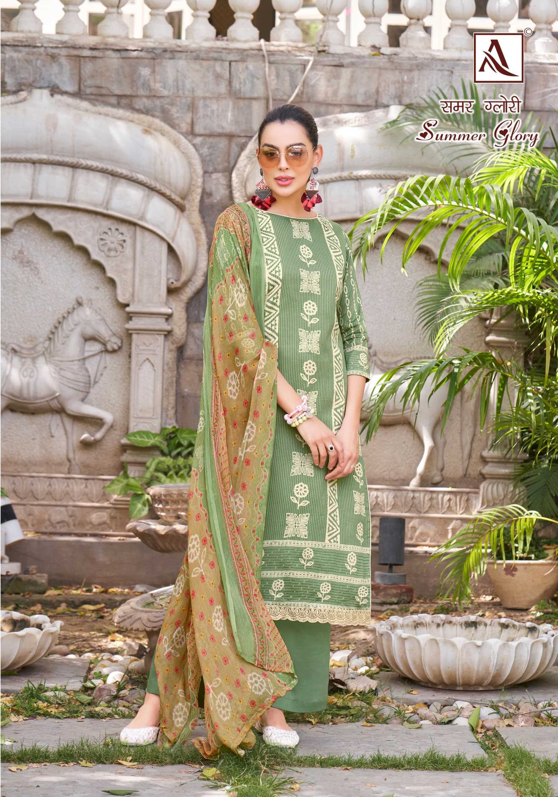Looking for alok suit presents summer glory fancy zam designer elegant look pakistani salwar suit Full Catalouge at Best Price? Buy Now alok suit presents summer glory fancy zam designer elegant look pakistani salwar suit at Wholesale Rate of Rs 4440 with Total 6 Pcs from authroized dealer and supplier of Alok Suit Brand. Cost of Each piece is just only Rs 740 which is very low and affordable price to resale the product in your retail store. rrgandhi is Surat based Wholesale Supplier & Dealer of Alok Suit Brand. Click on Brand name to Know more about Brand's products.