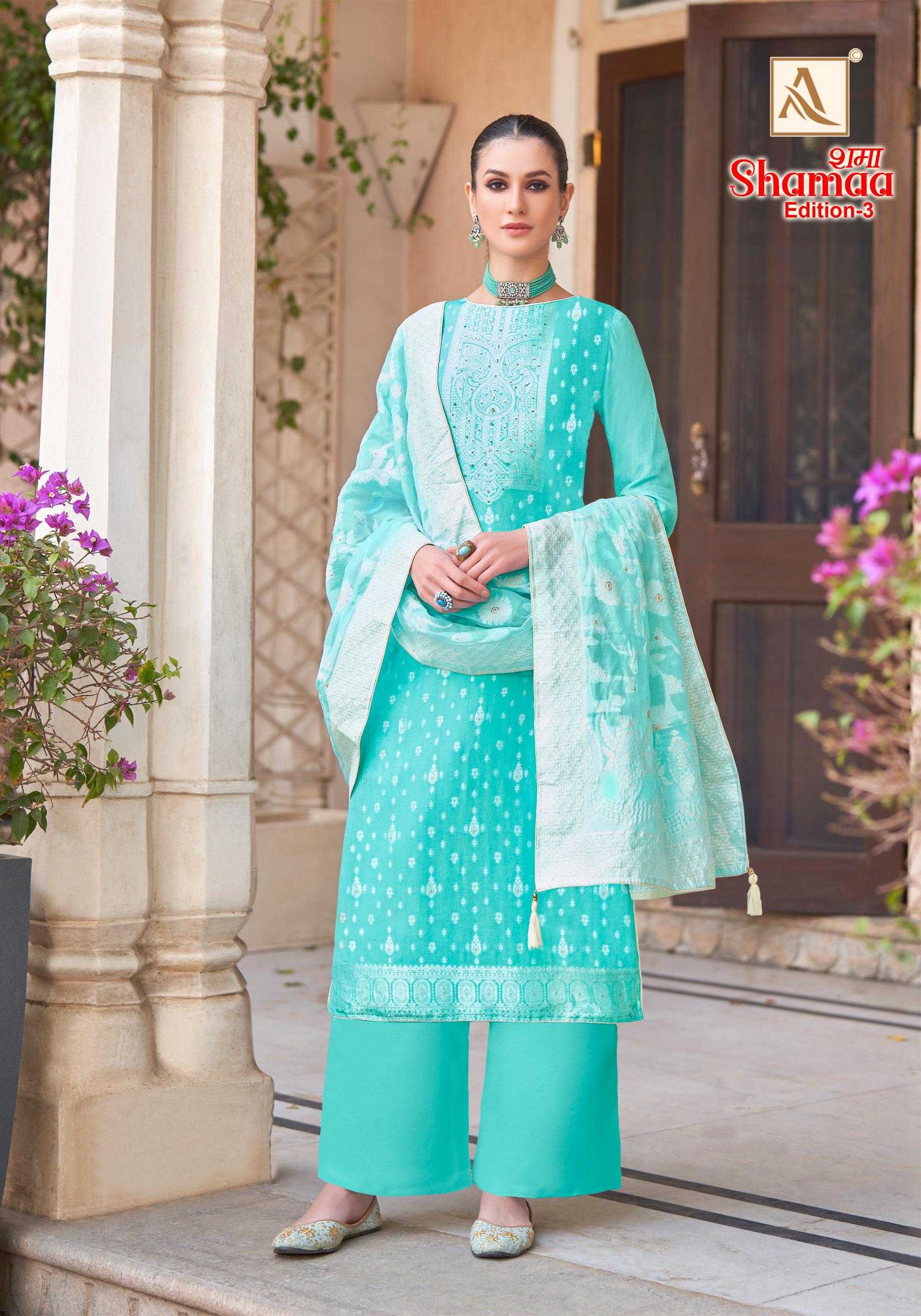 Looking for alok suits shamaa vol 3 elegant handwork viscose salwar suits Full Catalouge at Best Price? Buy Now alok suits shamaa vol 3 elegant handwork viscose salwar suits at Wholesale Rate of Rs 6150 with Total 6 Pcs from authroized dealer and supplier of Brand. Cost of Each piece is just only Rs 1025 which is very low and affordable price to resale the product in your retail store. rrgandhi is Surat based Wholesale Supplier & Dealer of Brand. Click on Brand name to Know more about Brand's products.