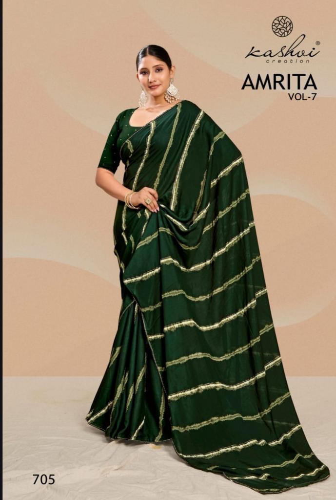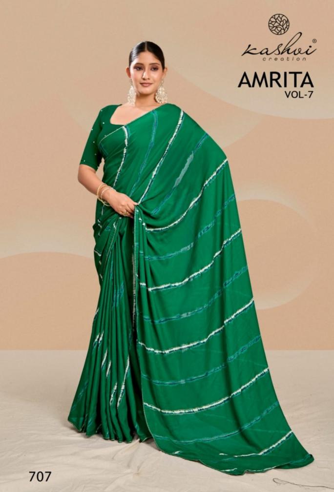 Looking for AMRITA VOL 7 BY KASHVI CREATION DULL MOSS CASUAL SAREES ONLINE Full Catalouge at Best Price? Buy Now AMRITA VOL 7 BY KASHVI CREATION DULL MOSS CASUAL SAREES ONLINE at Wholesale Rate of Rs 5480 with Total 8 Pcs from authroized dealer and supplier of Kashvi Creation Brand. Cost of Each piece is just only Rs 685 which is very low and affordable price to resale the product in your retail store. rrgandhi is Surat based Wholesale Supplier & Dealer of Kashvi Creation Brand. Click on Brand name to Know more about Brand's products.