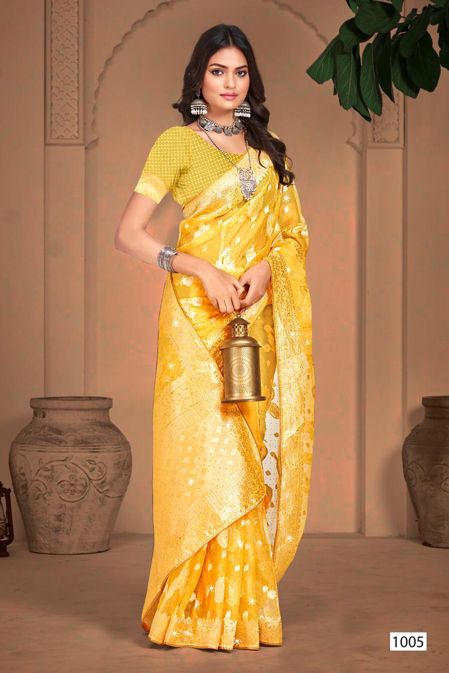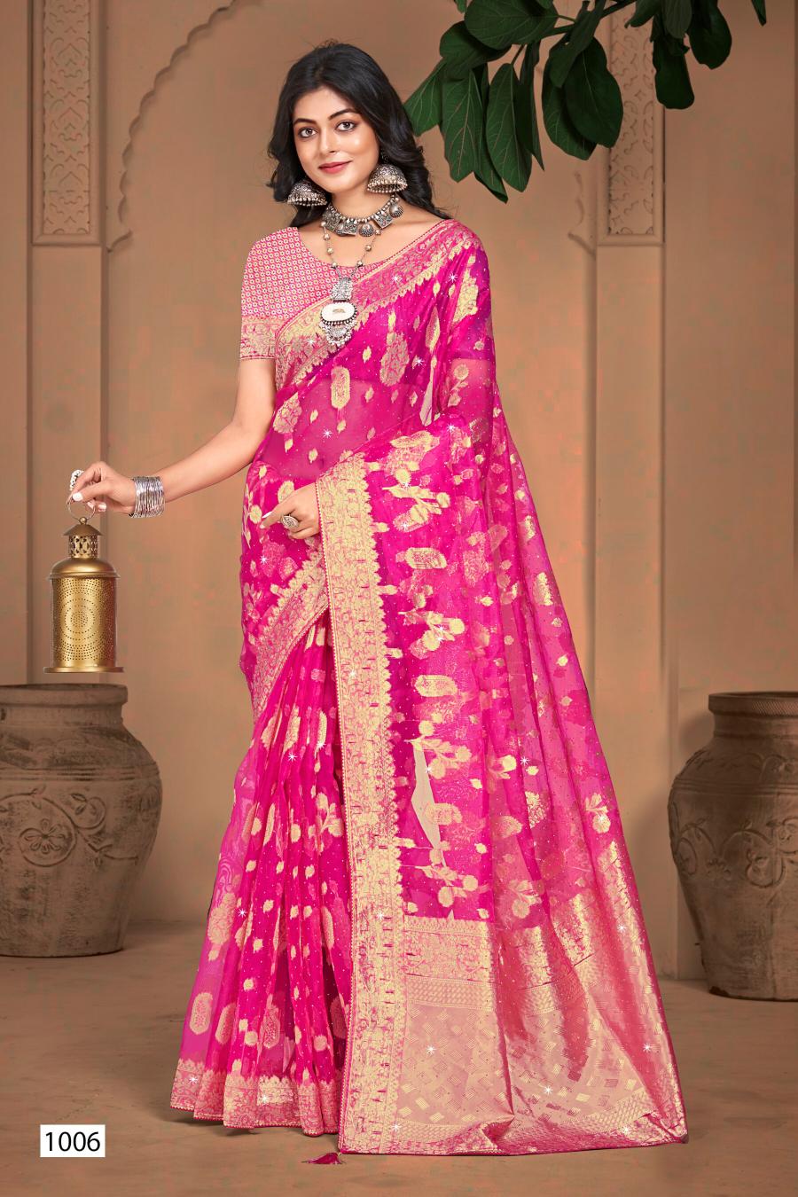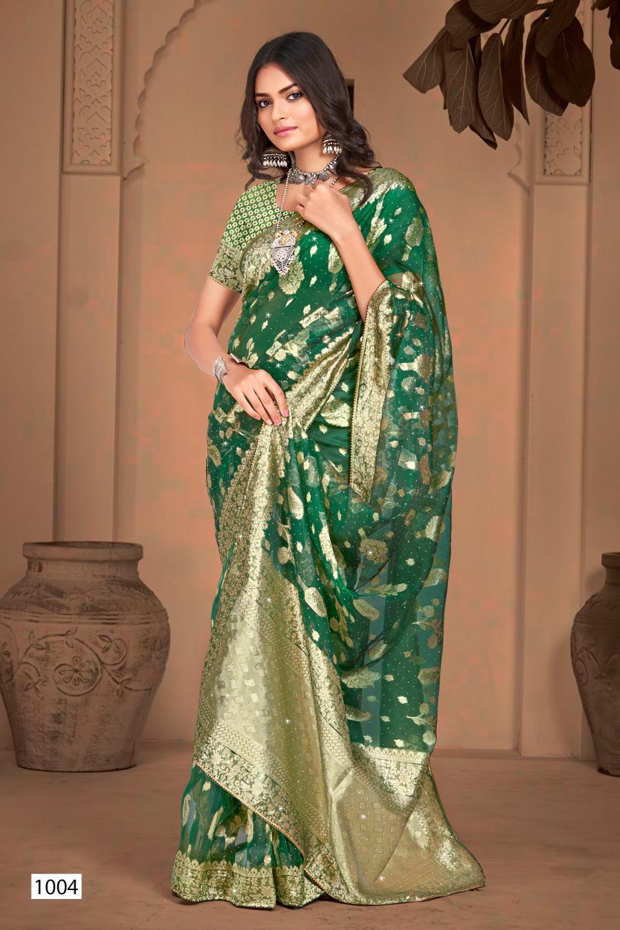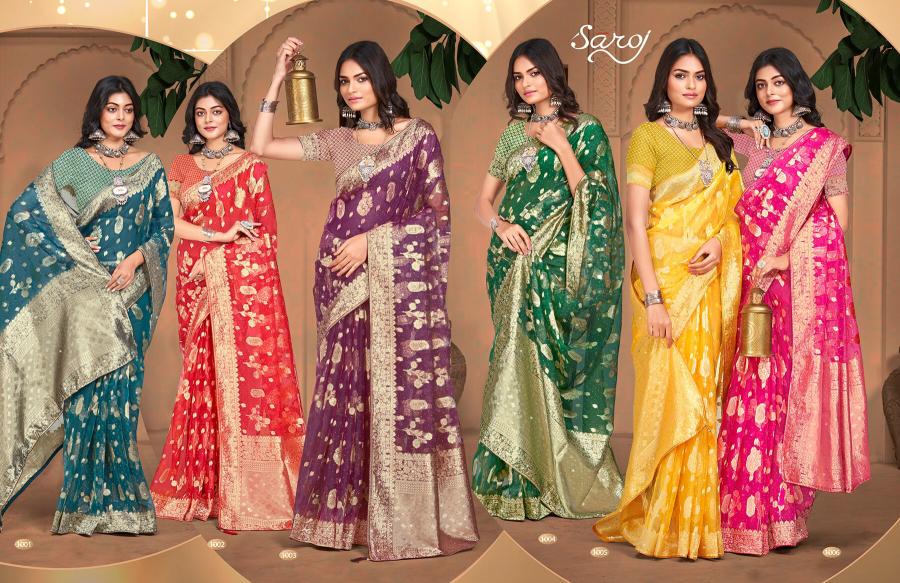 Looking for Ankita Swarovski Saroj Vol.6 organza silk saree Full Catalouge at Best Price? Buy Now Ankita Swarovski Saroj Vol.6 organza silk saree at Wholesale Rate of Rs 3480 with Total 6 Pcs from authroized dealer and supplier of Saroj Textiles Brand. Cost of Each piece is just only Rs 580 which is very low and affordable price to resale the product in your retail store. rrgandhi is Surat based Wholesale Supplier & Dealer of Saroj Textiles Brand. Click on Brand name to Know more about Brand's products.