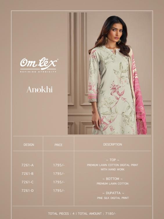 Looking for anokhi by omtex lawn cotton pretty look suit for womens Full Catalouge at Best Price? Buy Now anokhi by omtex lawn cotton pretty look suit for womens at Wholesale Rate of Rs 7180 with Total 4 Pcs from authroized dealer and supplier of Om Tex Brand. Cost of Each piece is just only Rs 1795 which is very low and affordable price to resale the product in your retail store. rrgandhi is Surat based Wholesale Supplier & Dealer of Om Tex Brand. Click on Brand name to Know more about Brand's products.