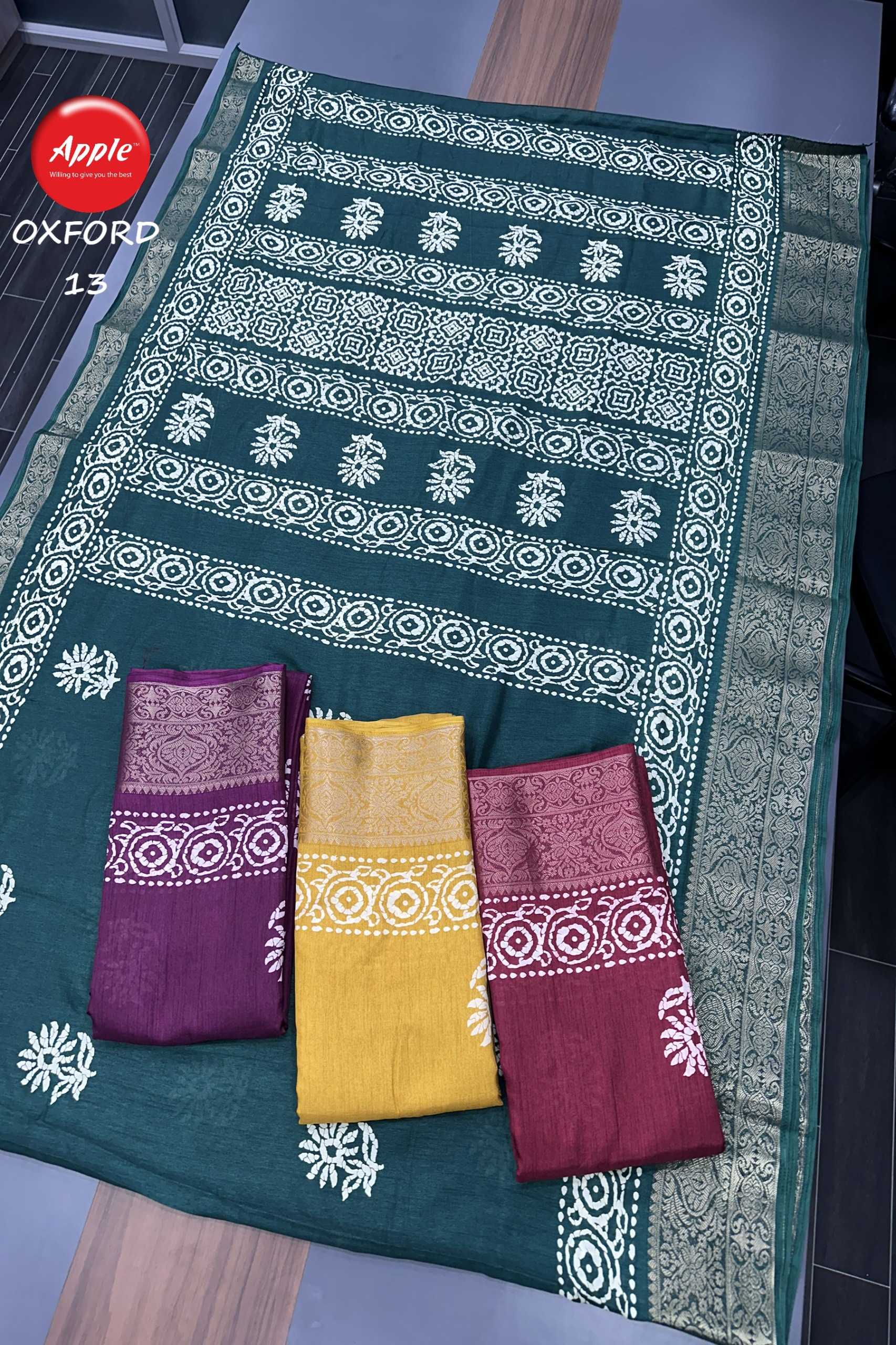 Looking for apple oxford vol 9 to 14 dola jecquard saree best seller in surat Full Catalouge at Best Price? Buy Now apple oxford vol 9 to 14 dola jecquard saree best seller in surat at Wholesale Rate of Rs 5940 with Total 12 Pcs from authroized dealer and supplier of Apple Sarees Brand. Cost of Each piece is just only Rs 495 which is very low and affordable price to resale the product in your retail store. rrgandhi is Surat based Wholesale Supplier & Dealer of Apple Sarees Brand. Click on Brand name to Know more about Brand's products.
