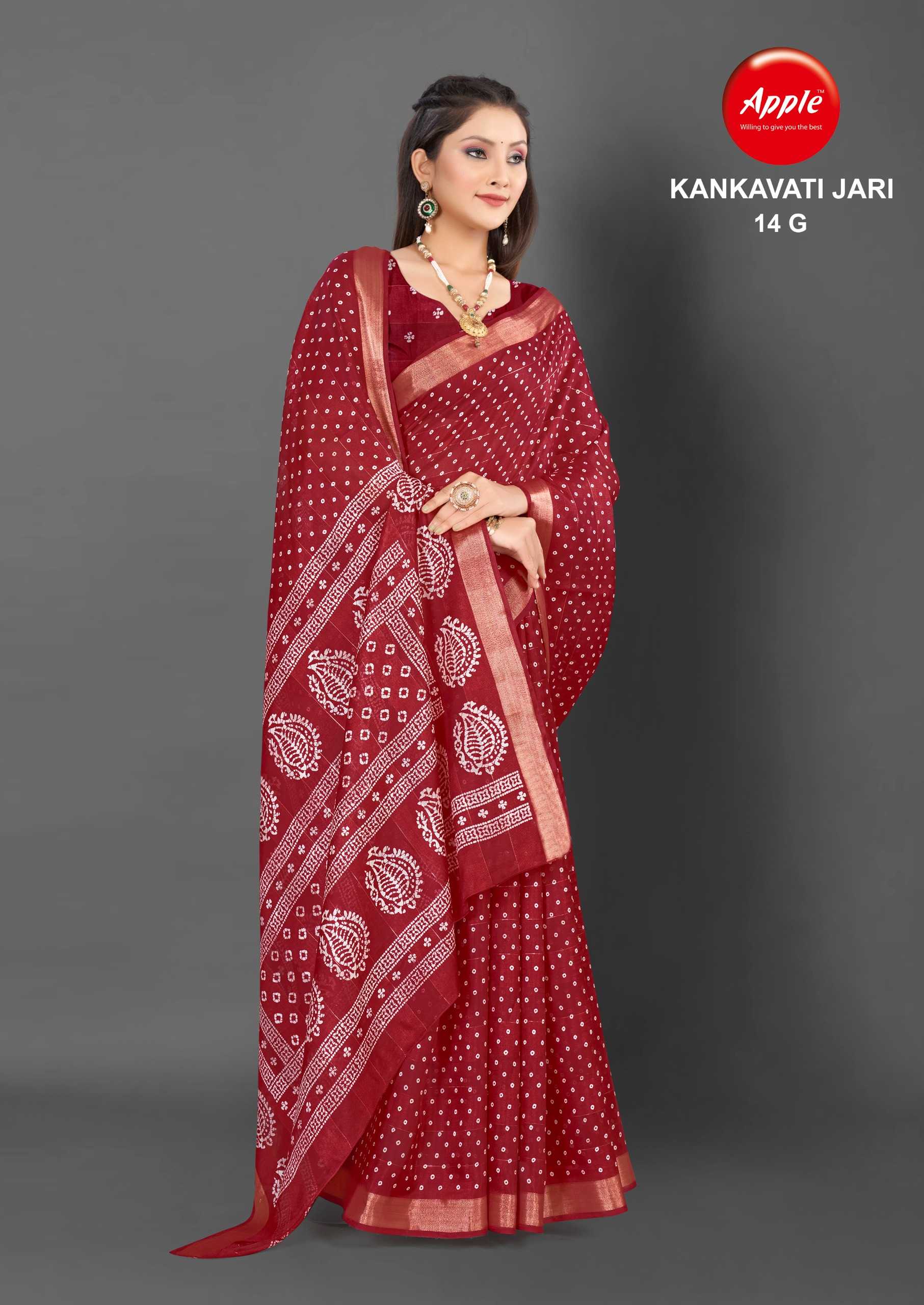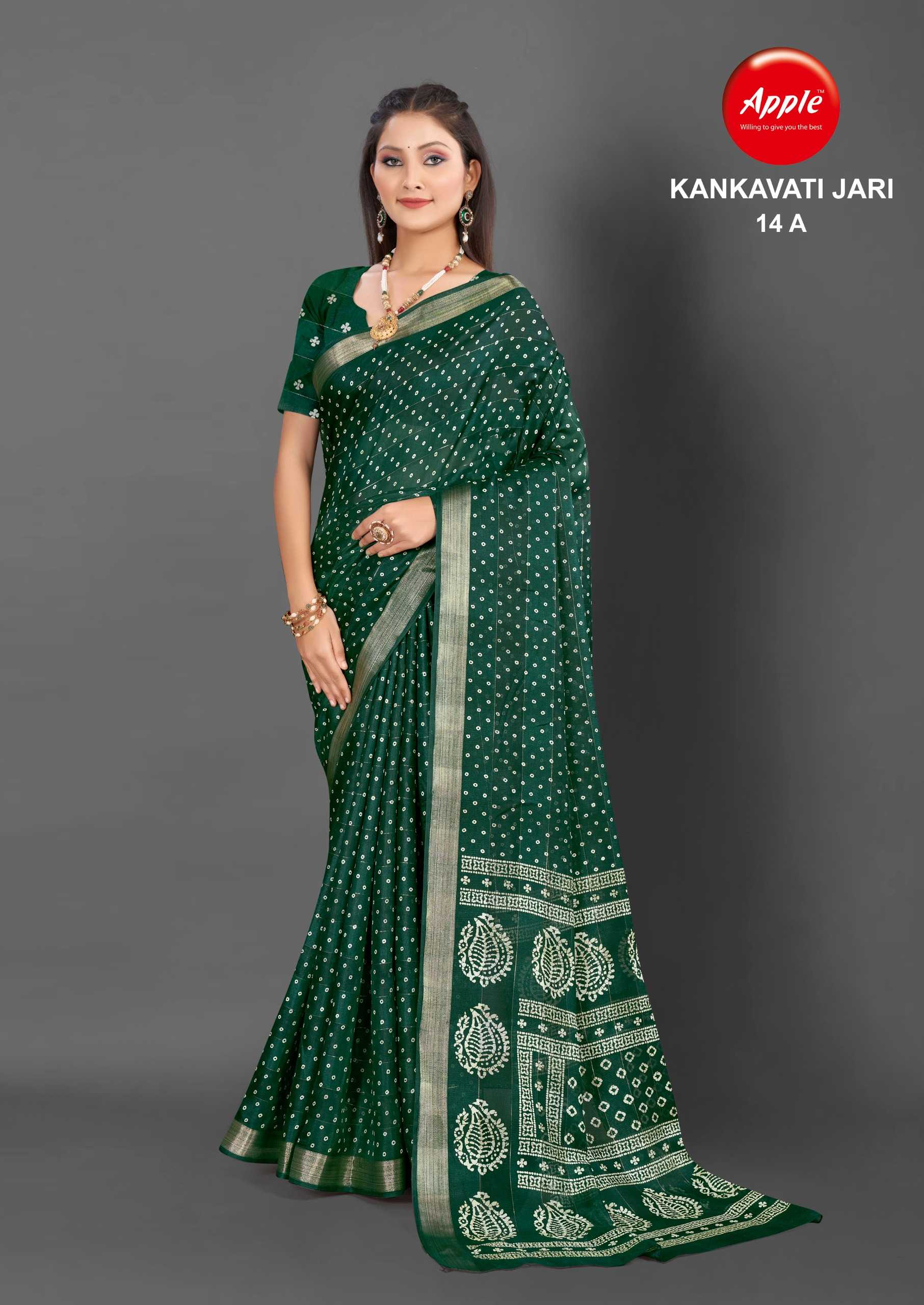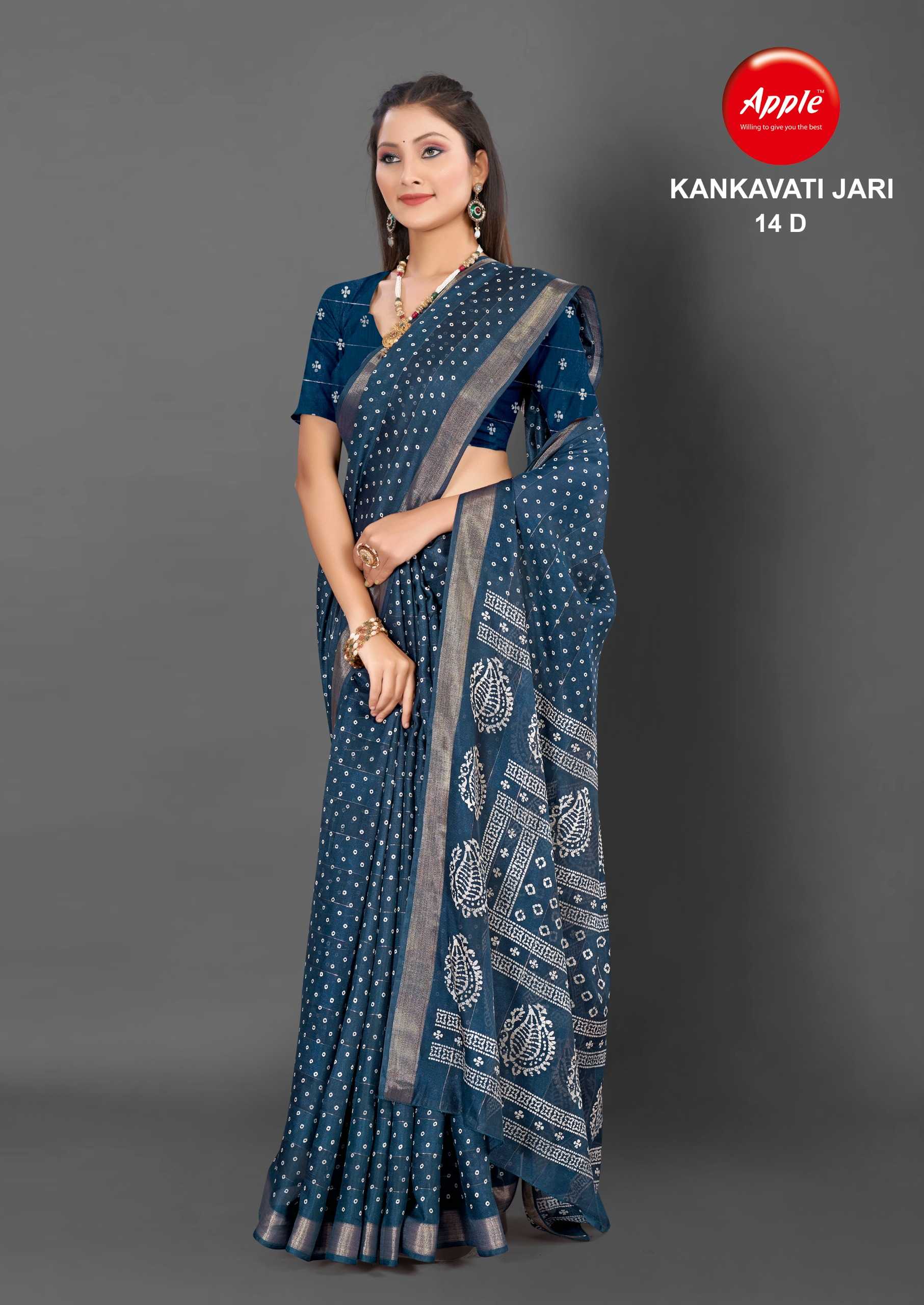 Looking for apple presents kankavati jari vol 14 amazing design fancy jari work saree Full Catalouge at Best Price? Buy Now apple presents kankavati jari vol 14 amazing design fancy jari work saree at Wholesale Rate of Rs 4160 with Total 8 Pcs from authroized dealer and supplier of Apple Sarees Brand. Cost of Each piece is just only Rs 520 which is very low and affordable price to resale the product in your retail store. rrgandhi is Surat based Wholesale Supplier & Dealer of Apple Sarees Brand. Click on Brand name to Know more about Brand's products.
