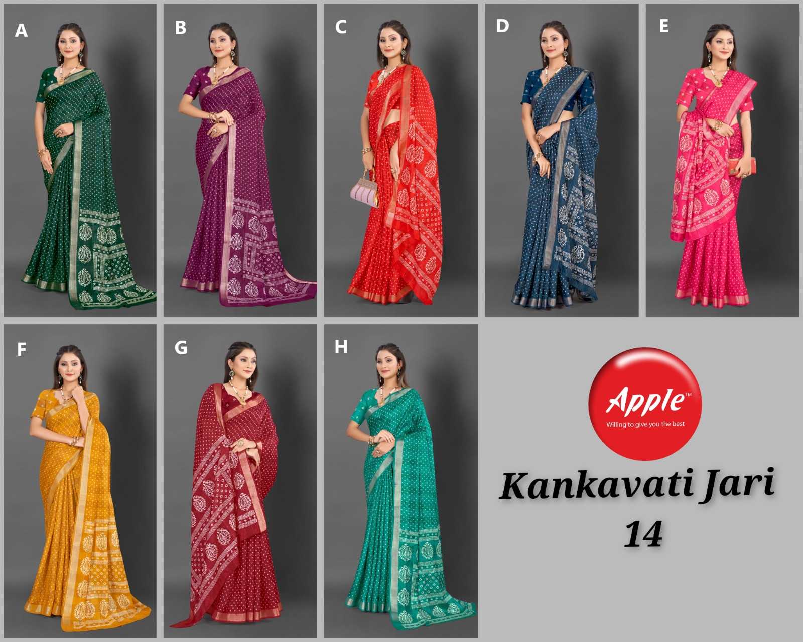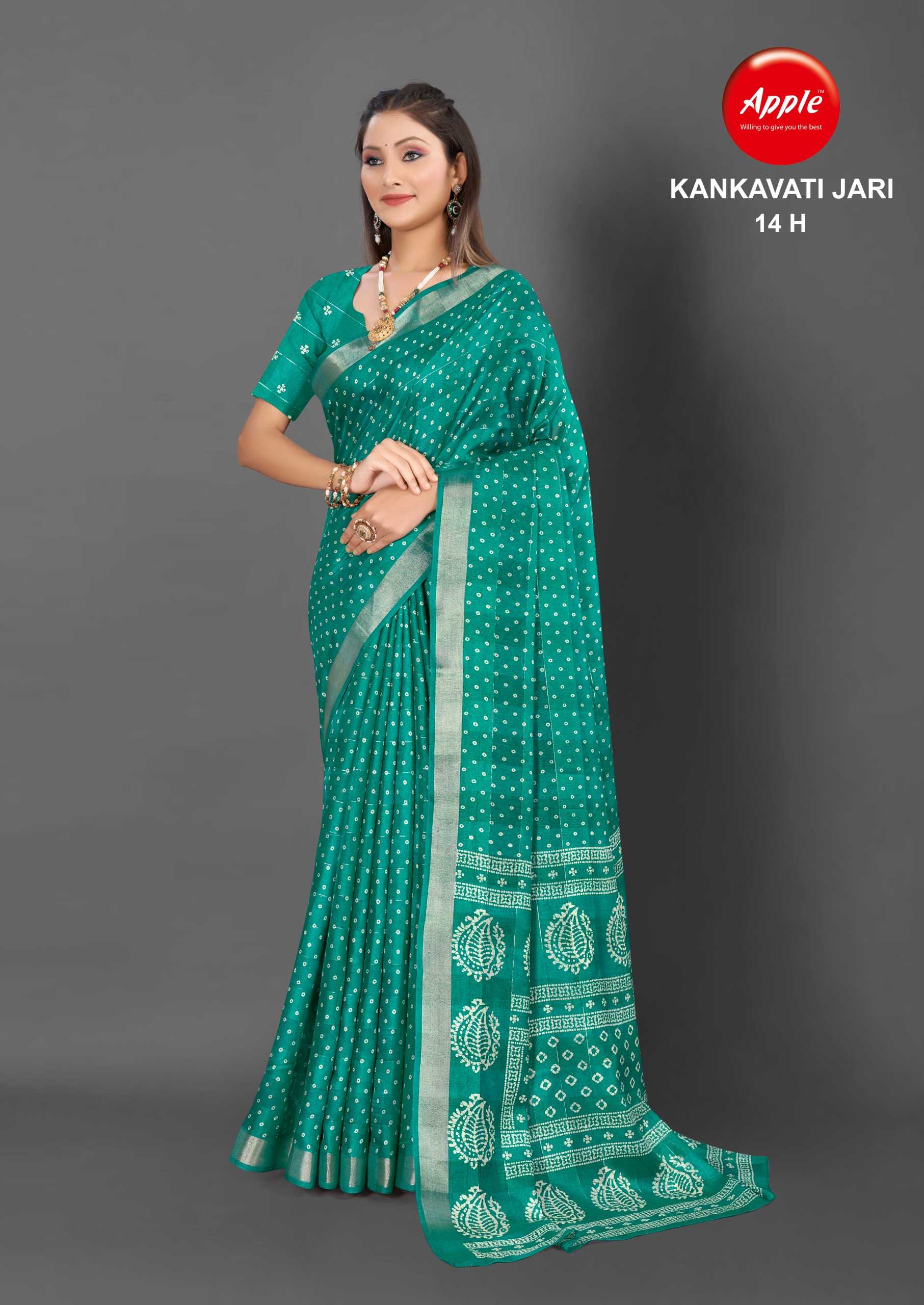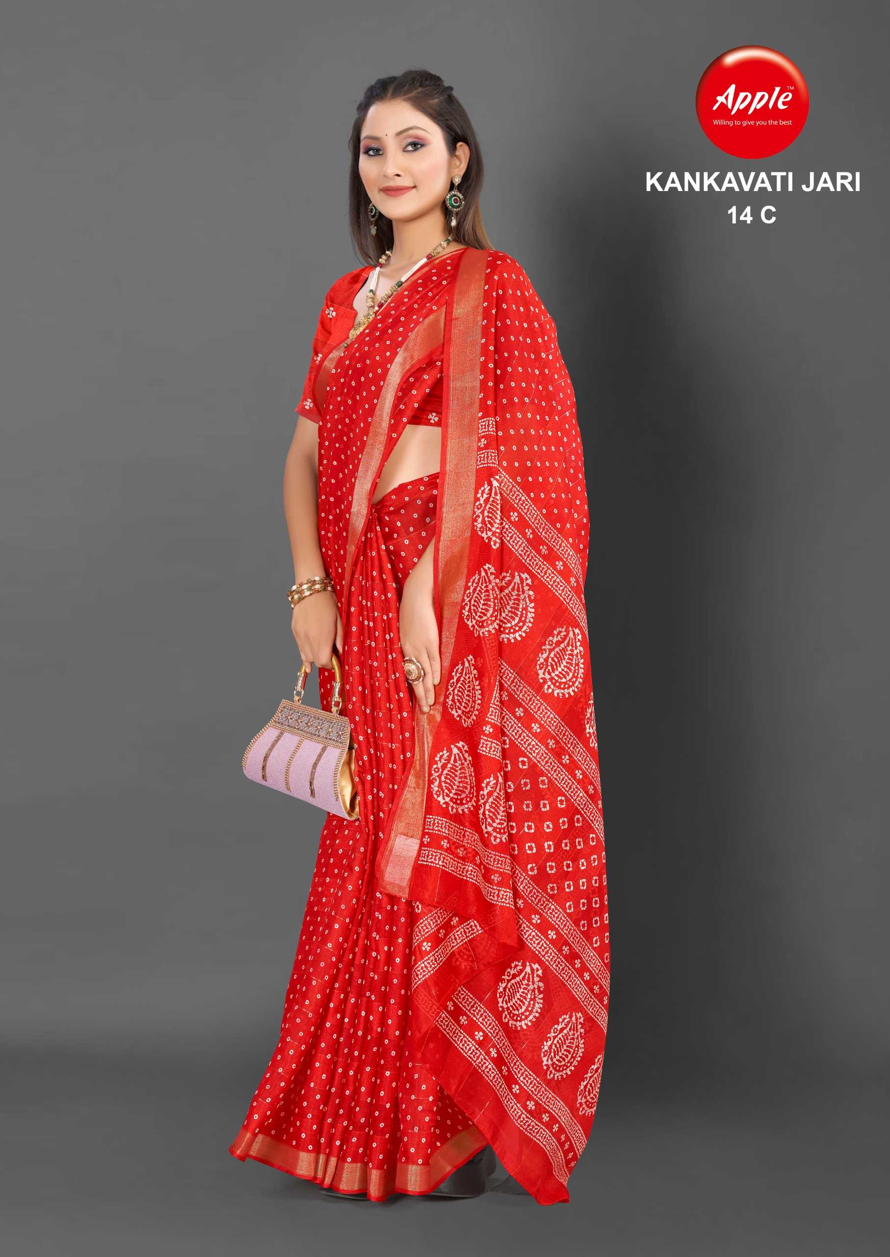 Looking for apple presents kankavati jari vol 14 amazing design fancy jari work saree Full Catalouge at Best Price? Buy Now apple presents kankavati jari vol 14 amazing design fancy jari work saree at Wholesale Rate of Rs 4160 with Total 8 Pcs from authroized dealer and supplier of Apple Sarees Brand. Cost of Each piece is just only Rs 520 which is very low and affordable price to resale the product in your retail store. rrgandhi is Surat based Wholesale Supplier & Dealer of Apple Sarees Brand. Click on Brand name to Know more about Brand's products.