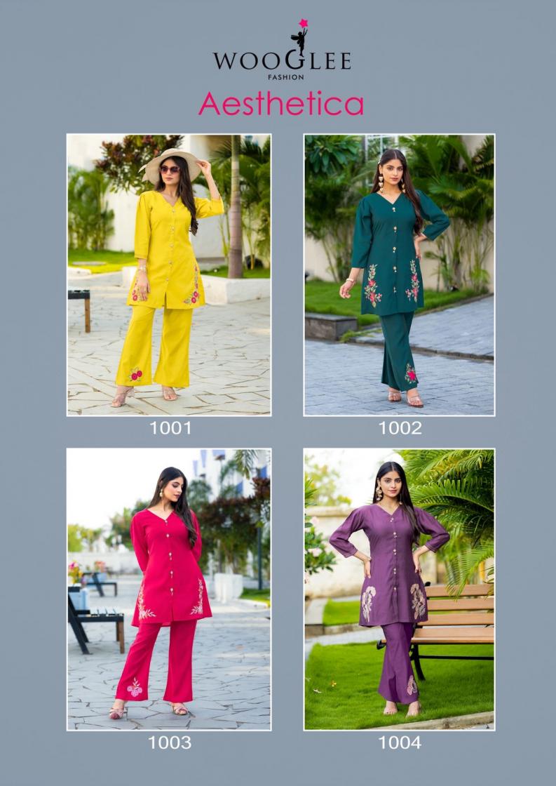 Looking for ASTHETICA BY WOOGLEE PRESENTS CLASSY CO-ORDS OUTFIT Full Catalouge at Best Price? Buy Now ASTHETICA BY WOOGLEE PRESENTS CLASSY CO-ORDS OUTFIT at Wholesale Rate of Rs 3320 with Total 4 Pcs from authroized dealer and supplier of Wooglee Brand. Cost of Each piece is just only Rs 830 which is very low and affordable price to resale the product in your retail store. rrgandhi is Surat based Wholesale Supplier & Dealer of Wooglee Brand. Click on Brand name to Know more about Brand's products.