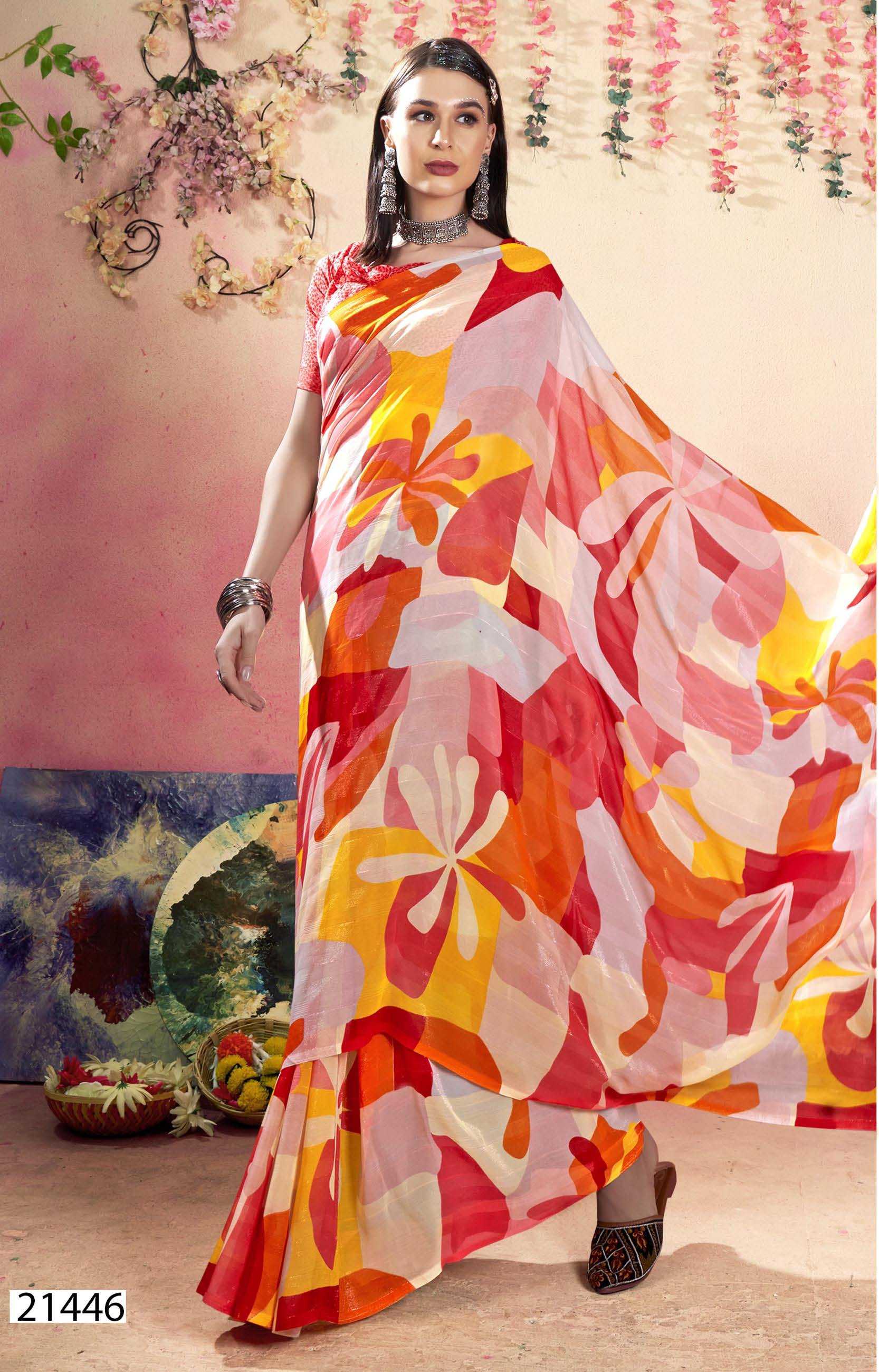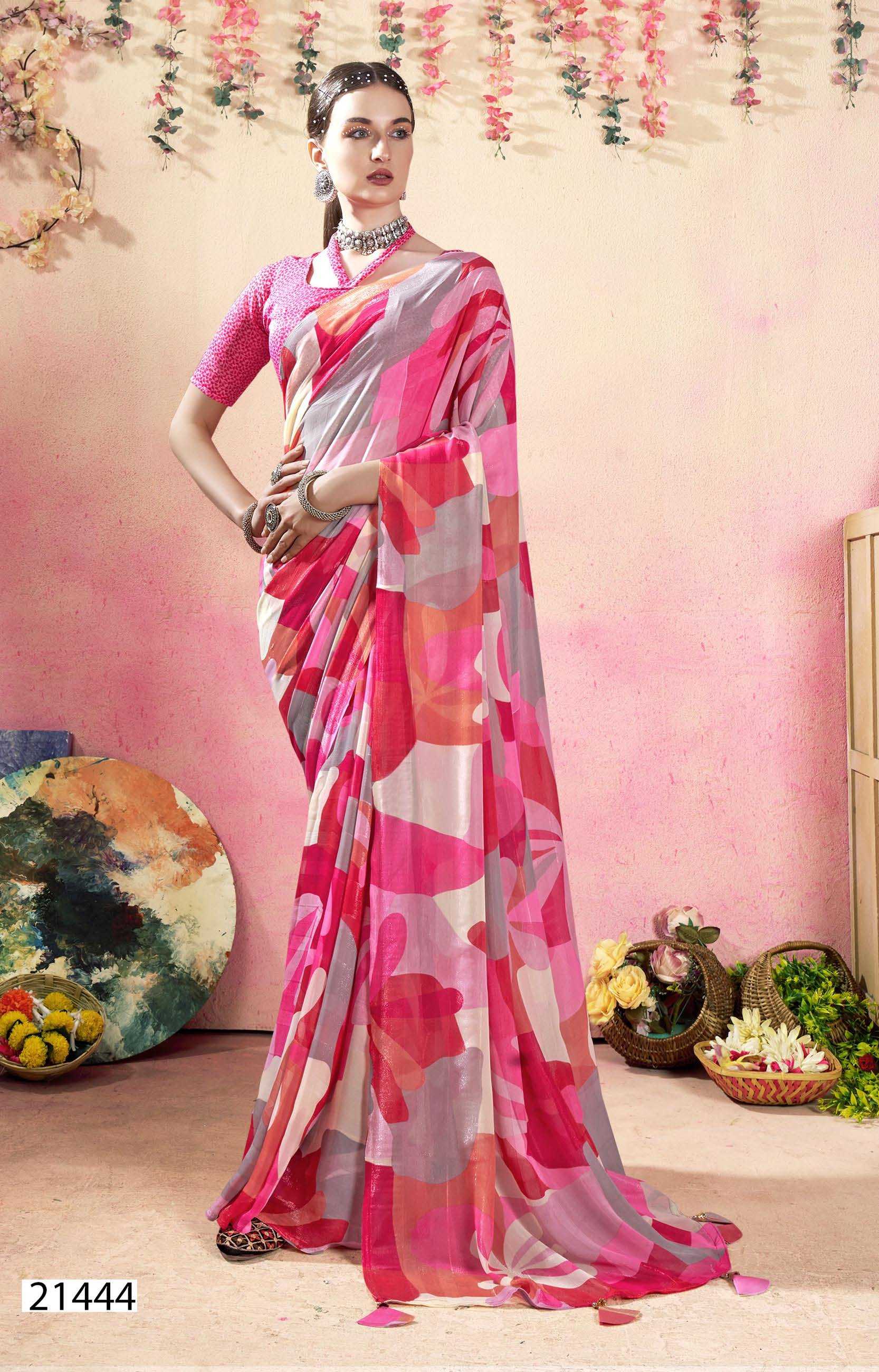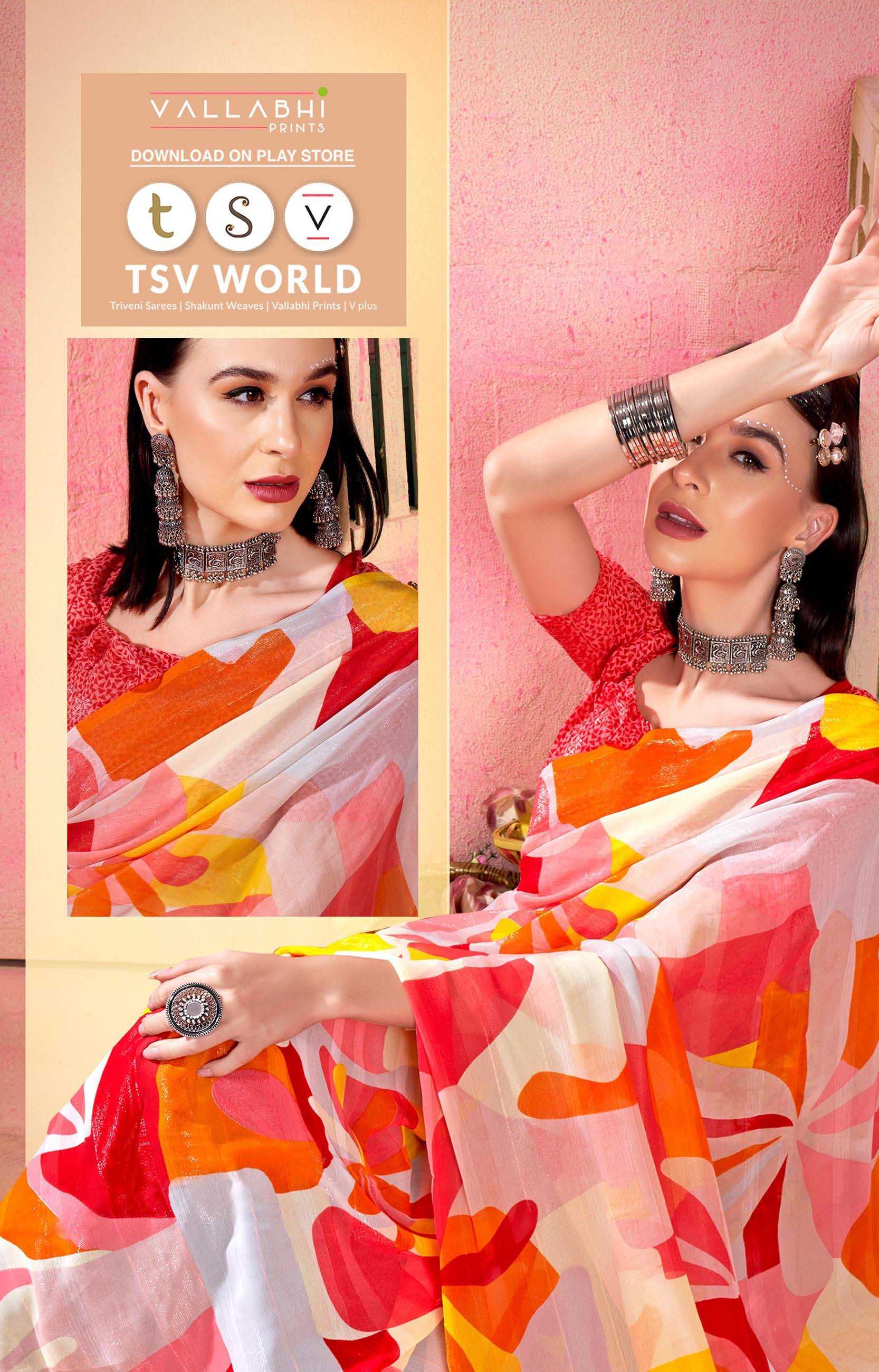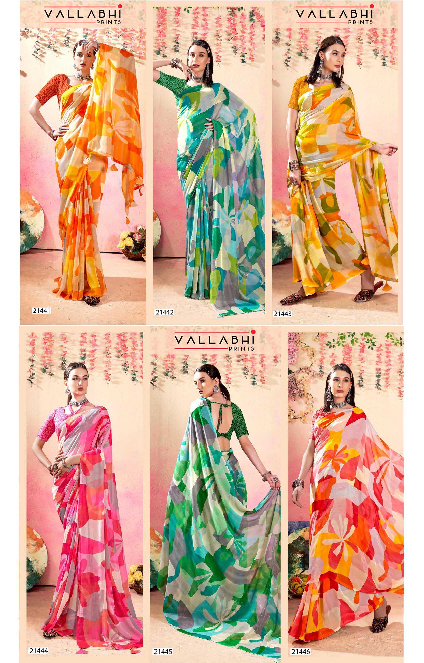 Looking for babli 4 by vallabhi prints latest fancy georgatee saree Full Catalouge at Best Price? Buy Now babli 4 by vallabhi prints latest fancy georgatee saree at Wholesale Rate of Rs 3870 with Total 6 Pcs from authroized dealer and supplier of Vallabhi Prints Brand. Cost of Each piece is just only Rs 645 which is very low and affordable price to resale the product in your retail store. rrgandhi is Surat based Wholesale Supplier & Dealer of Vallabhi Prints Brand. Click on Brand name to Know more about Brand's products.