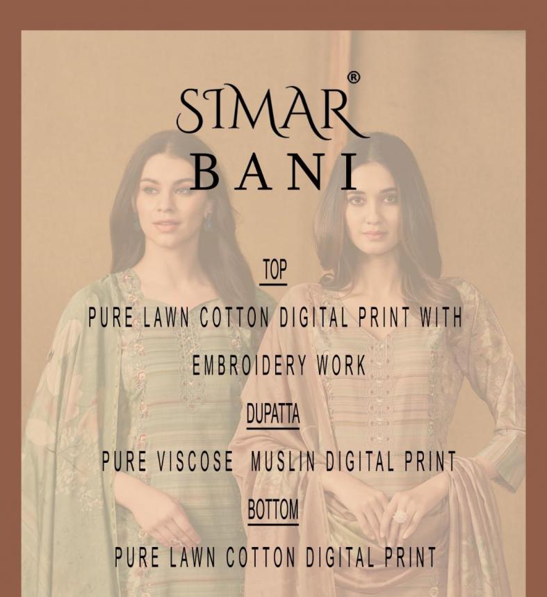 Looking for BANI SIMAR GLOSSY LAWN COTTON DIGITAL PRINT SUIT Full Catalouge at Best Price? Buy Now BANI SIMAR GLOSSY LAWN COTTON DIGITAL PRINT SUIT at Wholesale Rate of Rs 5580 with Total 4 Pcs from authroized dealer and supplier of Simar Brand. Cost of Each piece is just only Rs 1395 which is very low and affordable price to resale the product in your retail store. rrgandhi is Surat based Wholesale Supplier & Dealer of Simar Brand. Click on Brand name to Know more about Brand's products.