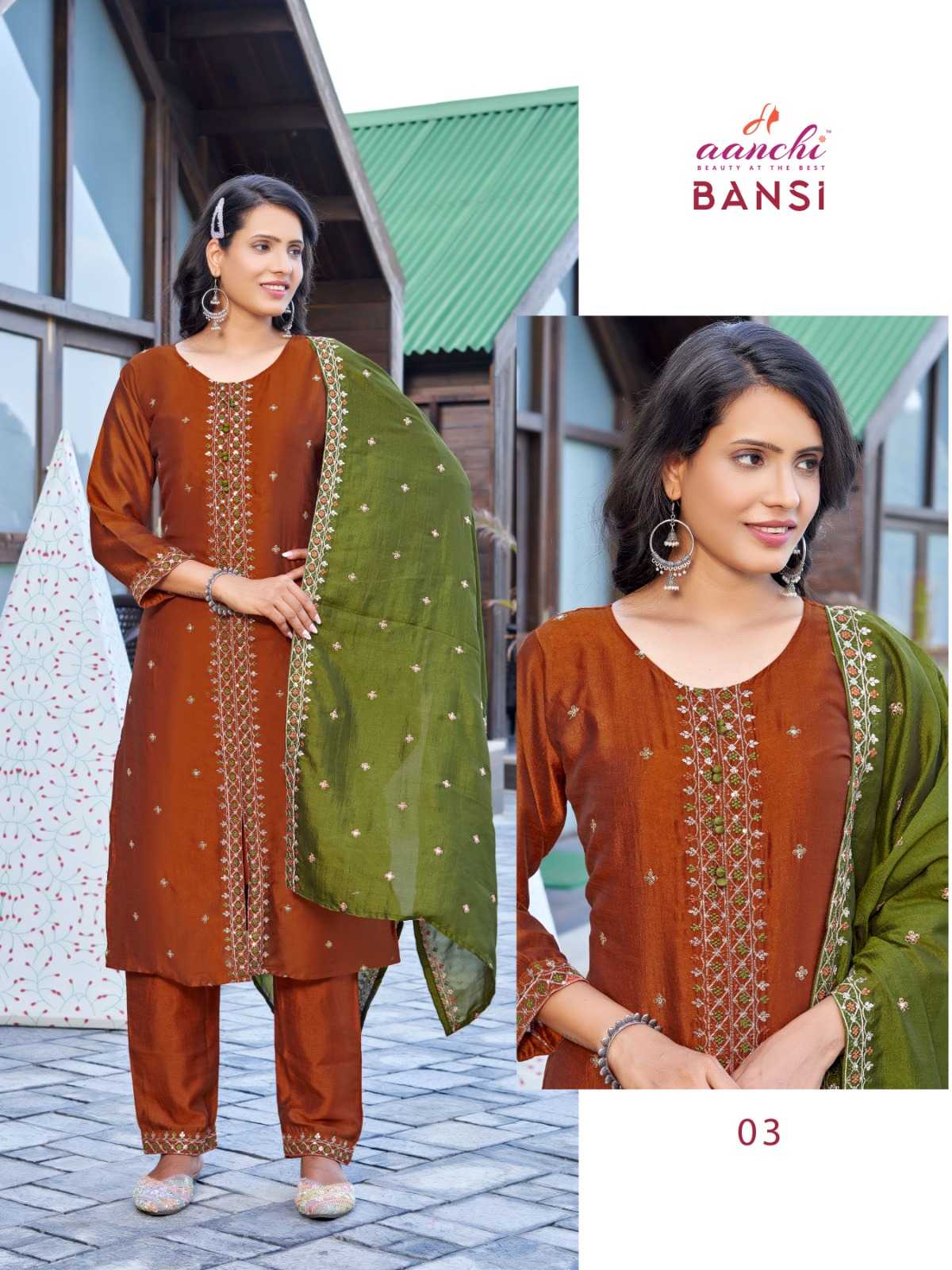 Looking for bansi by aanchi trendy vichitra amazing work readymade kurti pant dupatta Full Catalouge at Best Price? Buy Now bansi by aanchi trendy vichitra amazing work readymade kurti pant dupatta at Wholesale Rate of Rs 4320 with Total 4 Pcs from authroized dealer and supplier of Aanchi Brand. Cost of Each piece is just only Rs 1080 which is very low and affordable price to resale the product in your retail store. rrgandhi is Surat based Wholesale Supplier & Dealer of Aanchi Brand. Click on Brand name to Know more about Brand's products.