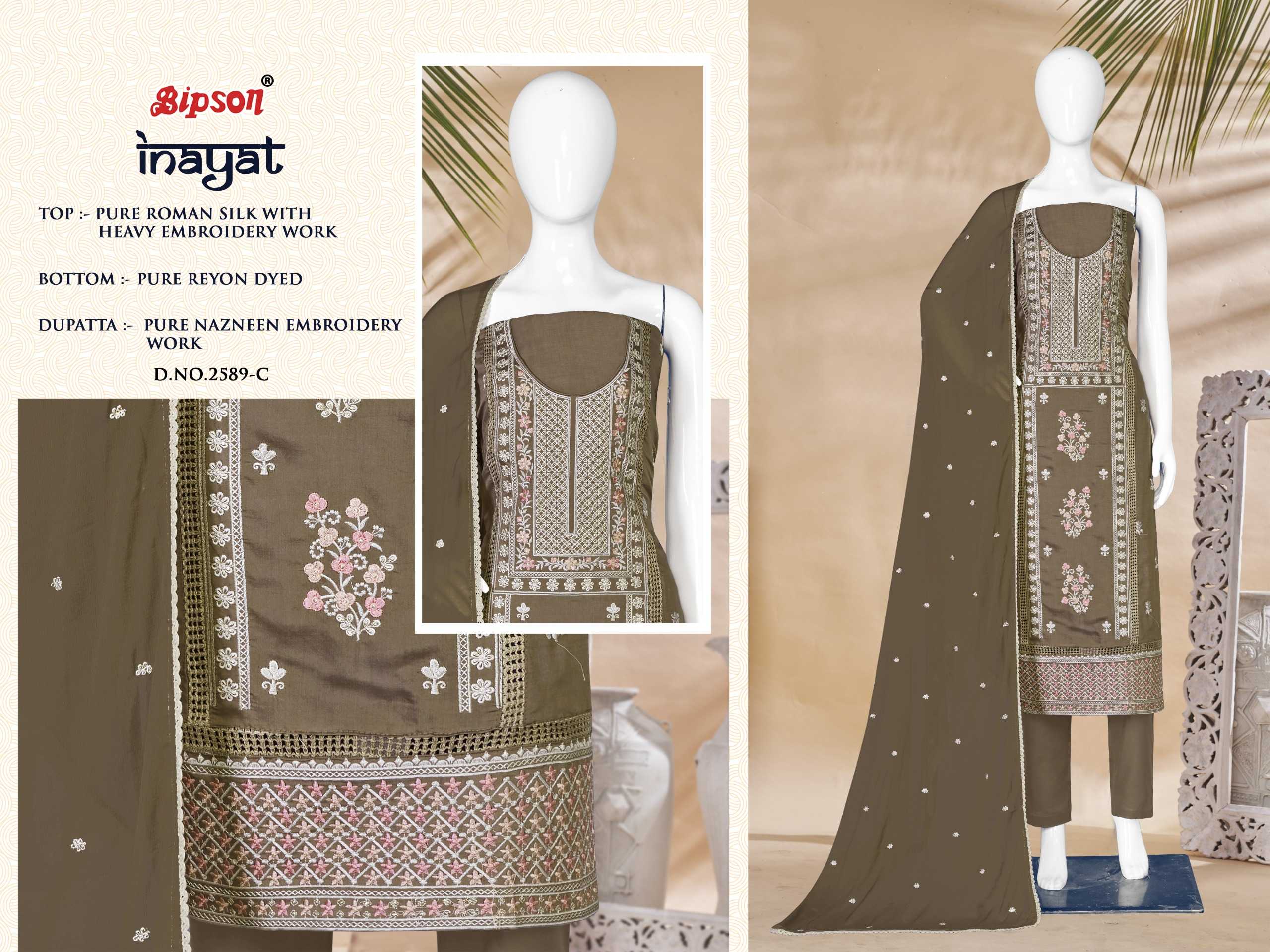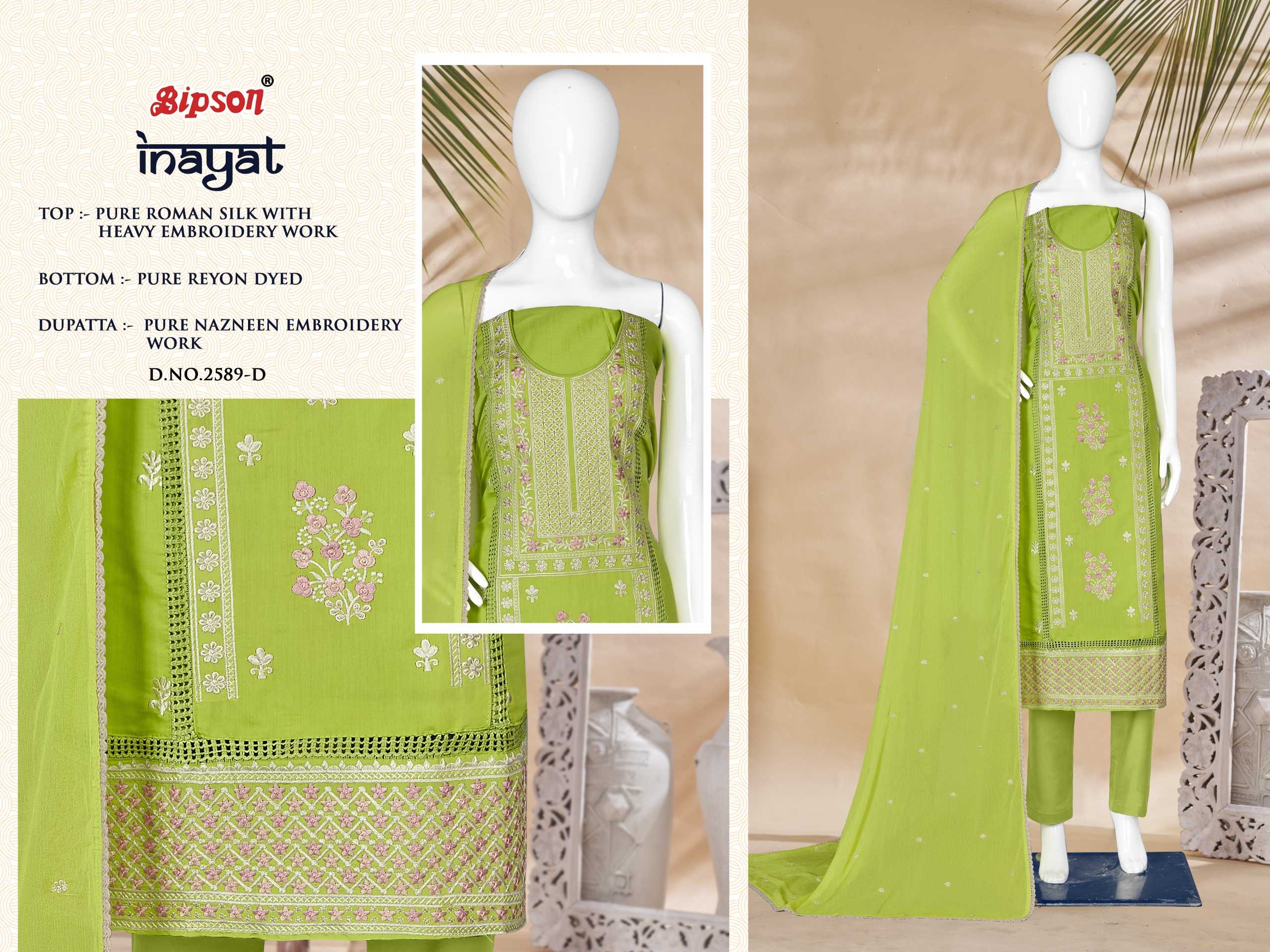 Looking for bipson inayat 2589 fancy wear unstitch silk salwar suit Full Catalouge at Best Price? Buy Now bipson inayat 2589 fancy wear unstitch silk salwar suit at Wholesale Rate of Rs 3100 with Total 4 Pcs from authroized dealer and supplier of Bipson Fashion Brand. Cost of Each piece is just only Rs 775 which is very low and affordable price to resale the product in your retail store. rrgandhi is Surat based Wholesale Supplier & Dealer of Bipson Fashion Brand. Click on Brand name to Know more about Brand's products.
