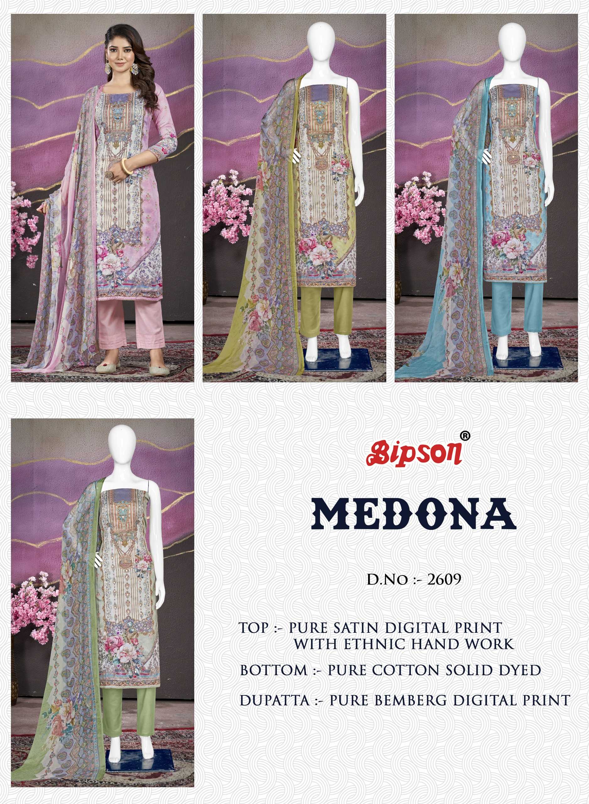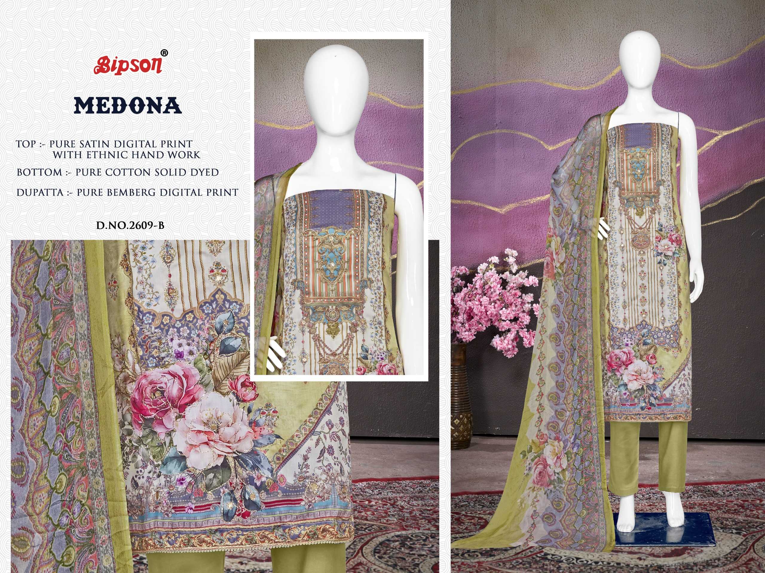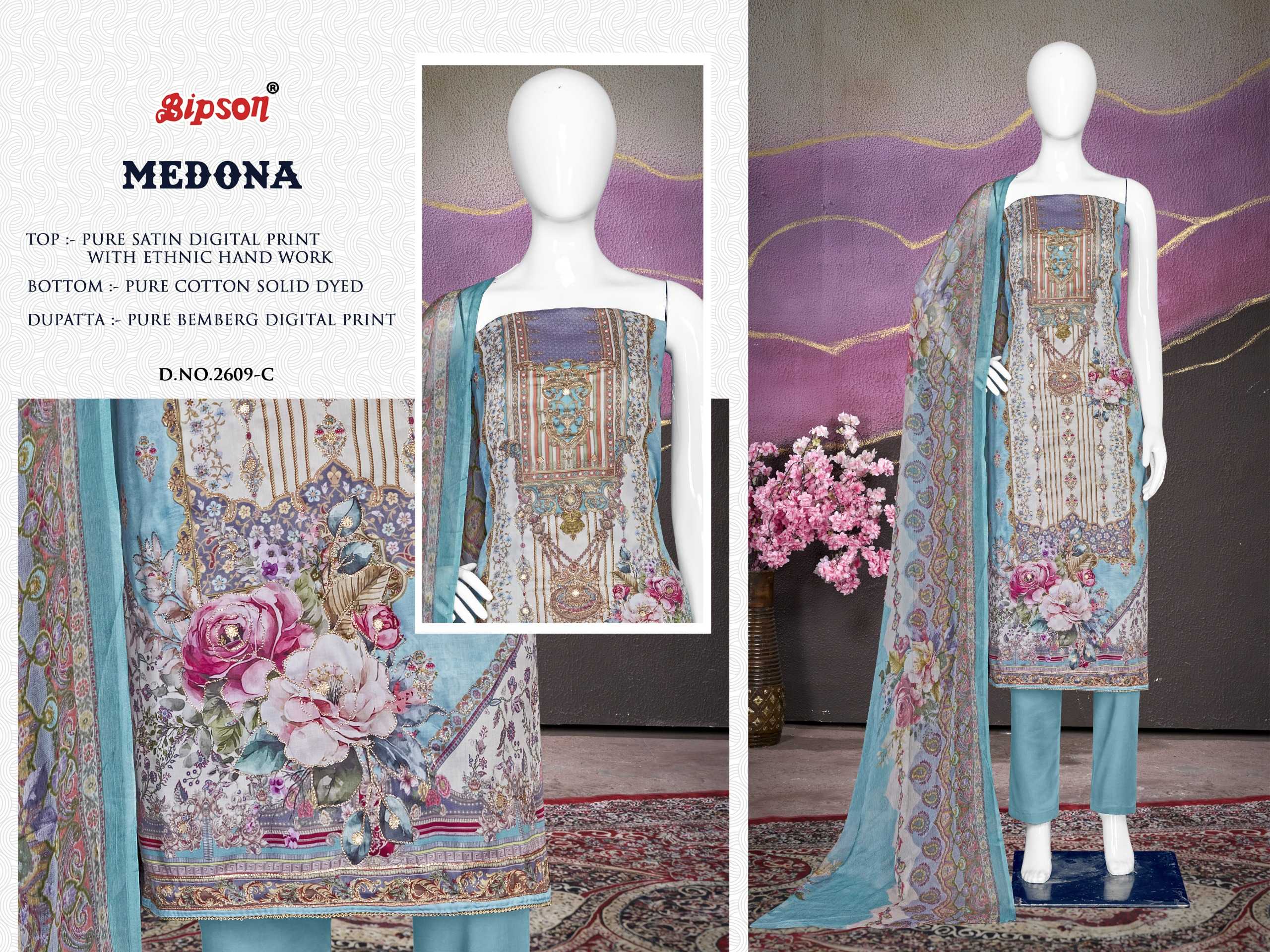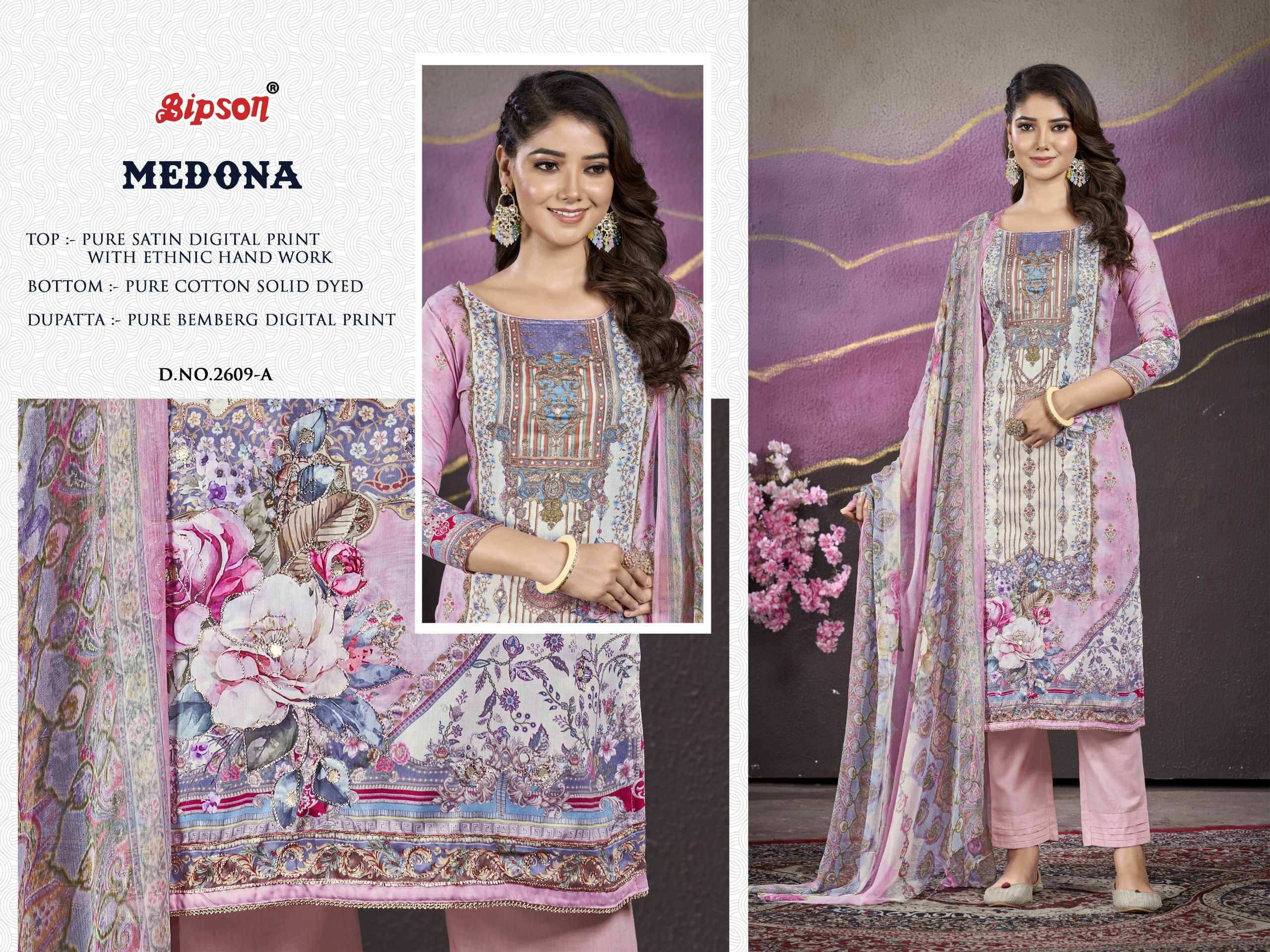 Looking for bipson medona 2609 launch fancy & comfortable pure satin salwar suit dress material Full Catalouge at Best Price? Buy Now bipson medona 2609 launch fancy & comfortable pure satin salwar suit dress material at Wholesale Rate of Rs 3300 with Total 4 Pcs from authroized dealer and supplier of Bipson Fashion Brand. Cost of Each piece is just only Rs 825 which is very low and affordable price to resale the product in your retail store. rrgandhi is Surat based Wholesale Supplier & Dealer of Bipson Fashion Brand. Click on Brand name to Know more about Brand's products.