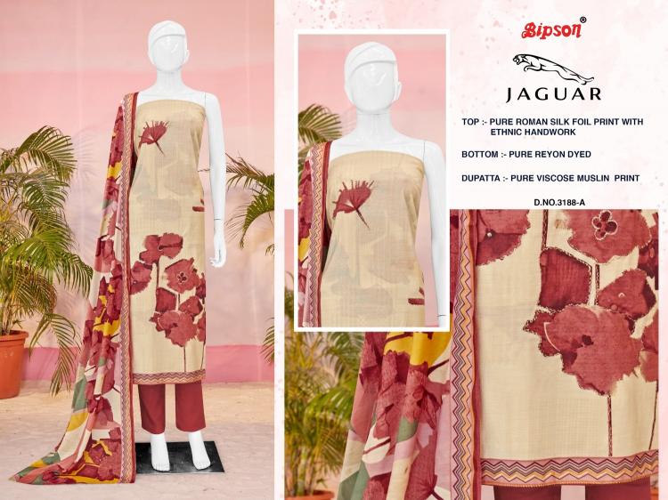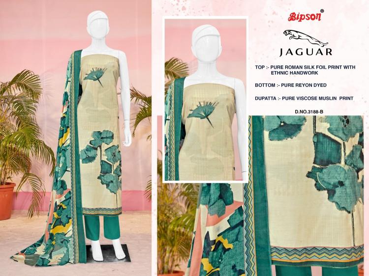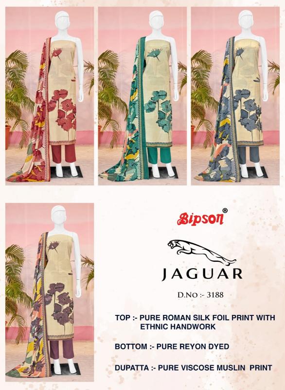 Looking for bipson prints jaguar 3188 roman silk daily wear 3pcs dress Full Catalouge at Best Price? Buy Now bipson prints jaguar 3188 roman silk daily wear 3pcs dress at Wholesale Rate of Rs 3180 with Total 4 Pcs from authroized dealer and supplier of Bipson Fashion Brand. Cost of Each piece is just only Rs 795 which is very low and affordable price to resale the product in your retail store. rrgandhi is Surat based Wholesale Supplier & Dealer of Bipson Fashion Brand. Click on Brand name to Know more about Brand's products.