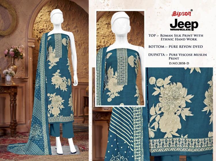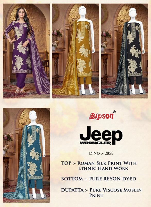 Looking for bipson prints jeep wranglar 2858 unique roman silk unstitch suit Full Catalouge at Best Price? Buy Now bipson prints jeep wranglar 2858 unique roman silk unstitch suit at Wholesale Rate of Rs 2980 with Total 4 Pcs from authroized dealer and supplier of Bipson Fashion Brand. Cost of Each piece is just only Rs 745 which is very low and affordable price to resale the product in your retail store. rrgandhi is Surat based Wholesale Supplier & Dealer of Bipson Fashion Brand. Click on Brand name to Know more about Brand's products.